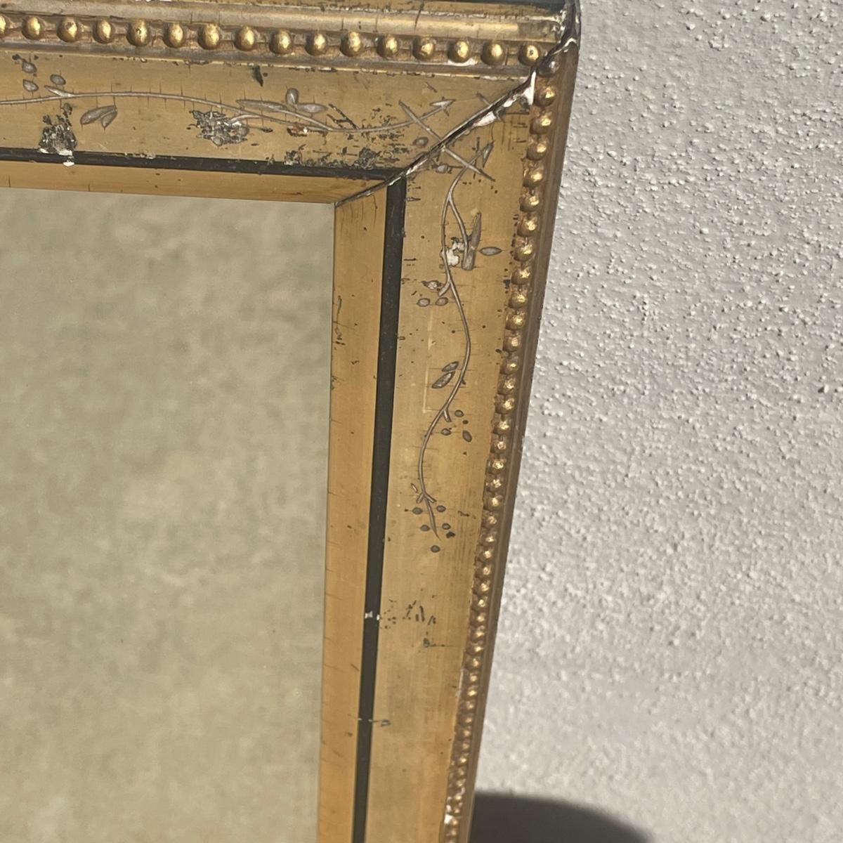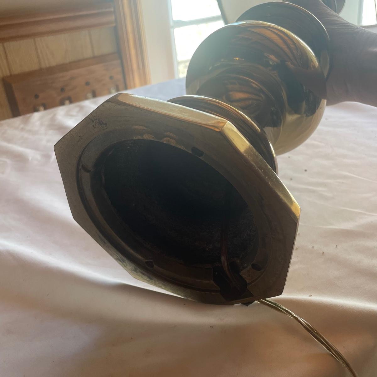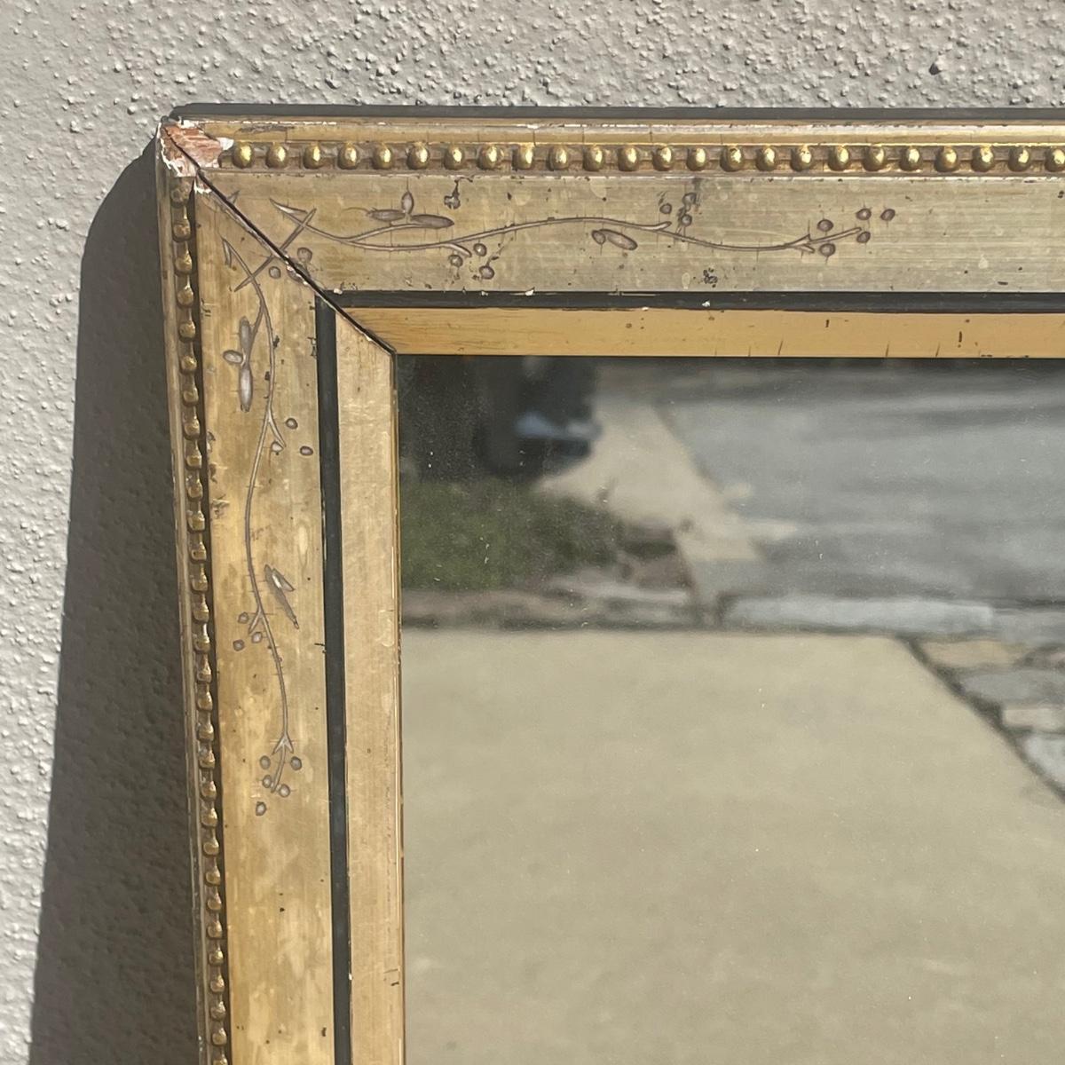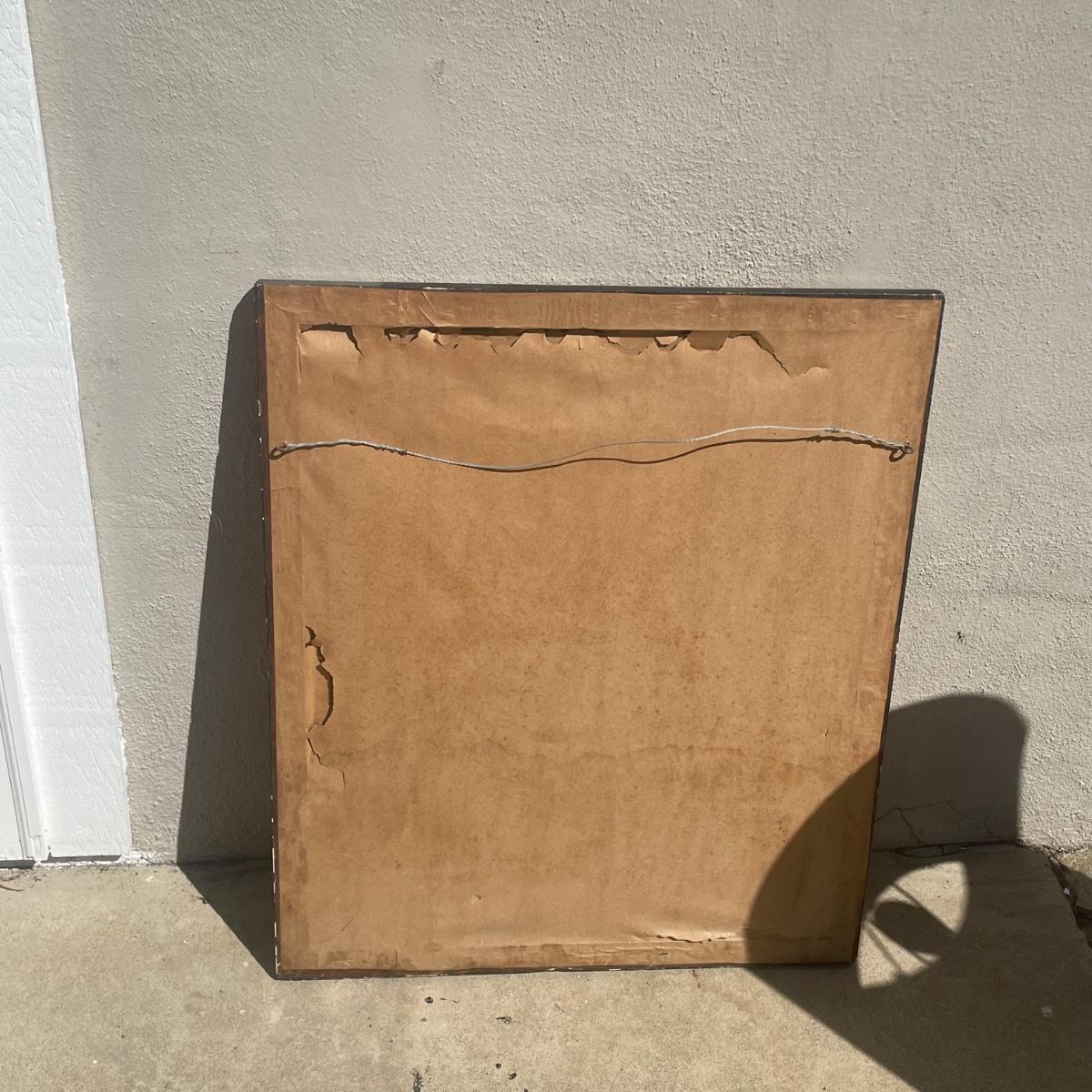 This attractive Vintage wood mirror measures 22” x 26” and is accompanied by a brass mirror with a retro tan woven lamp shade.