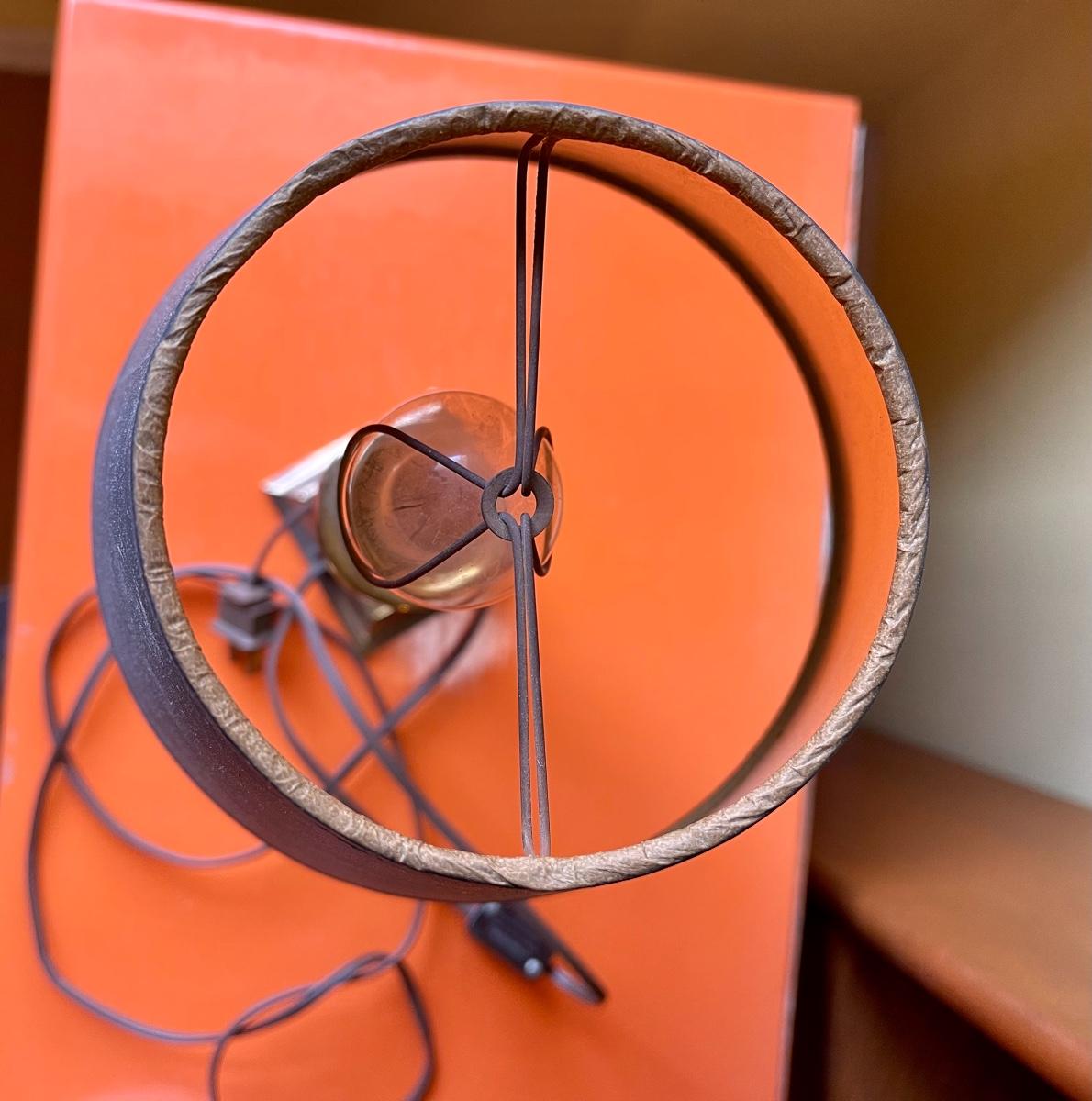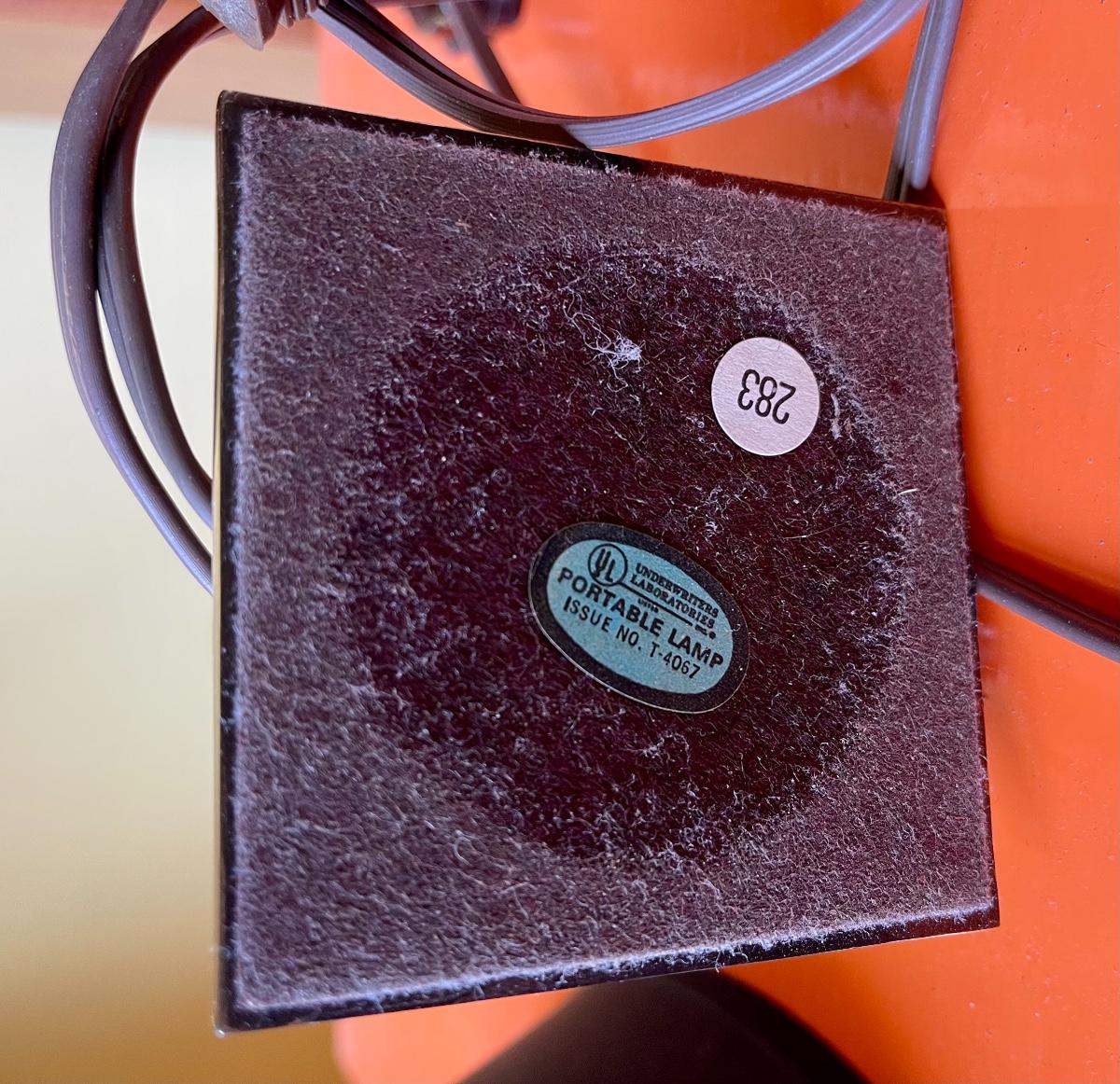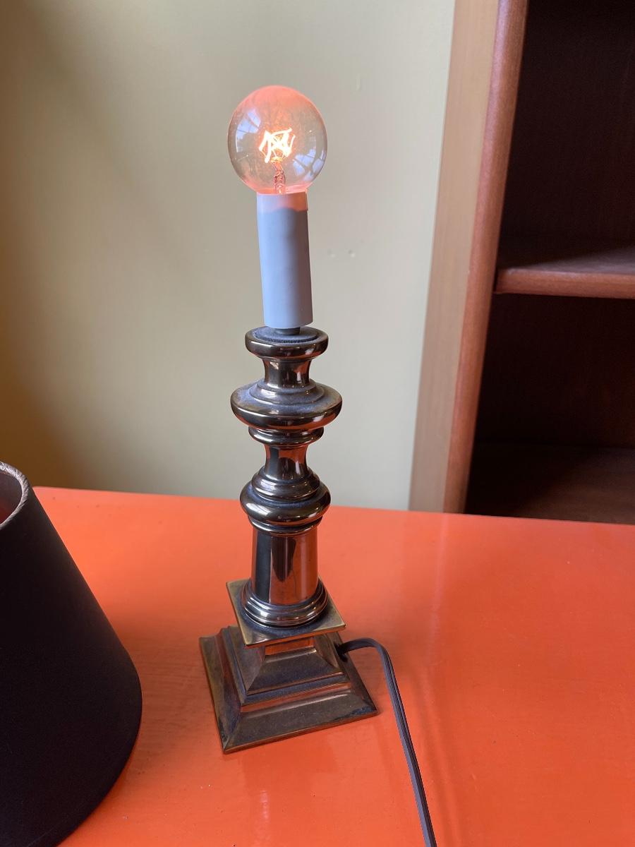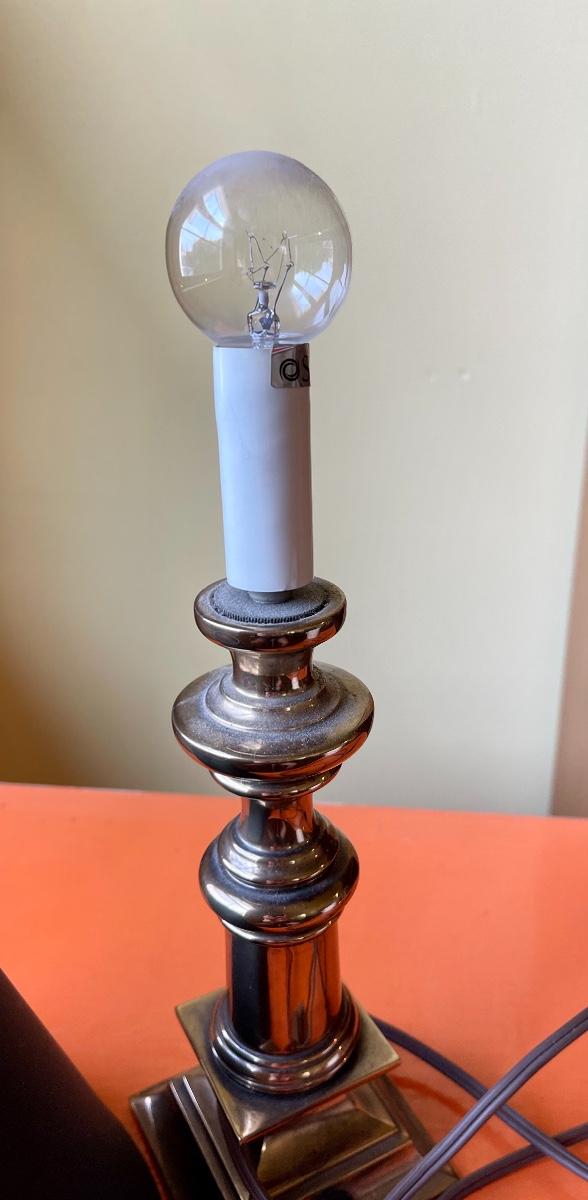 Heavy brass base, Black lampshade (feels like suede), long cord, It is in good working condition.Approximately 14 inches tall.