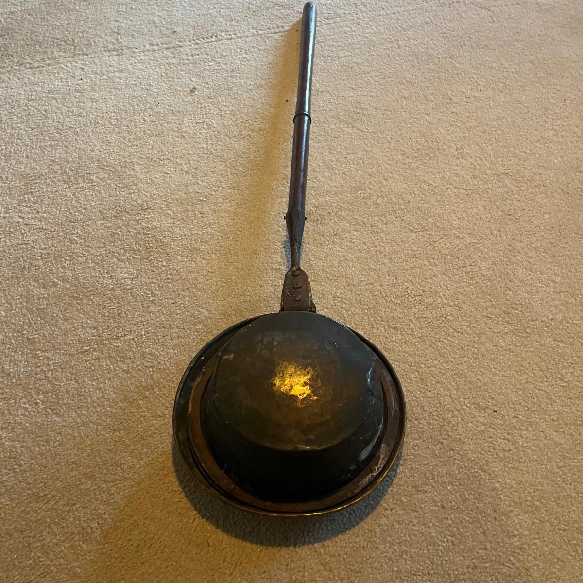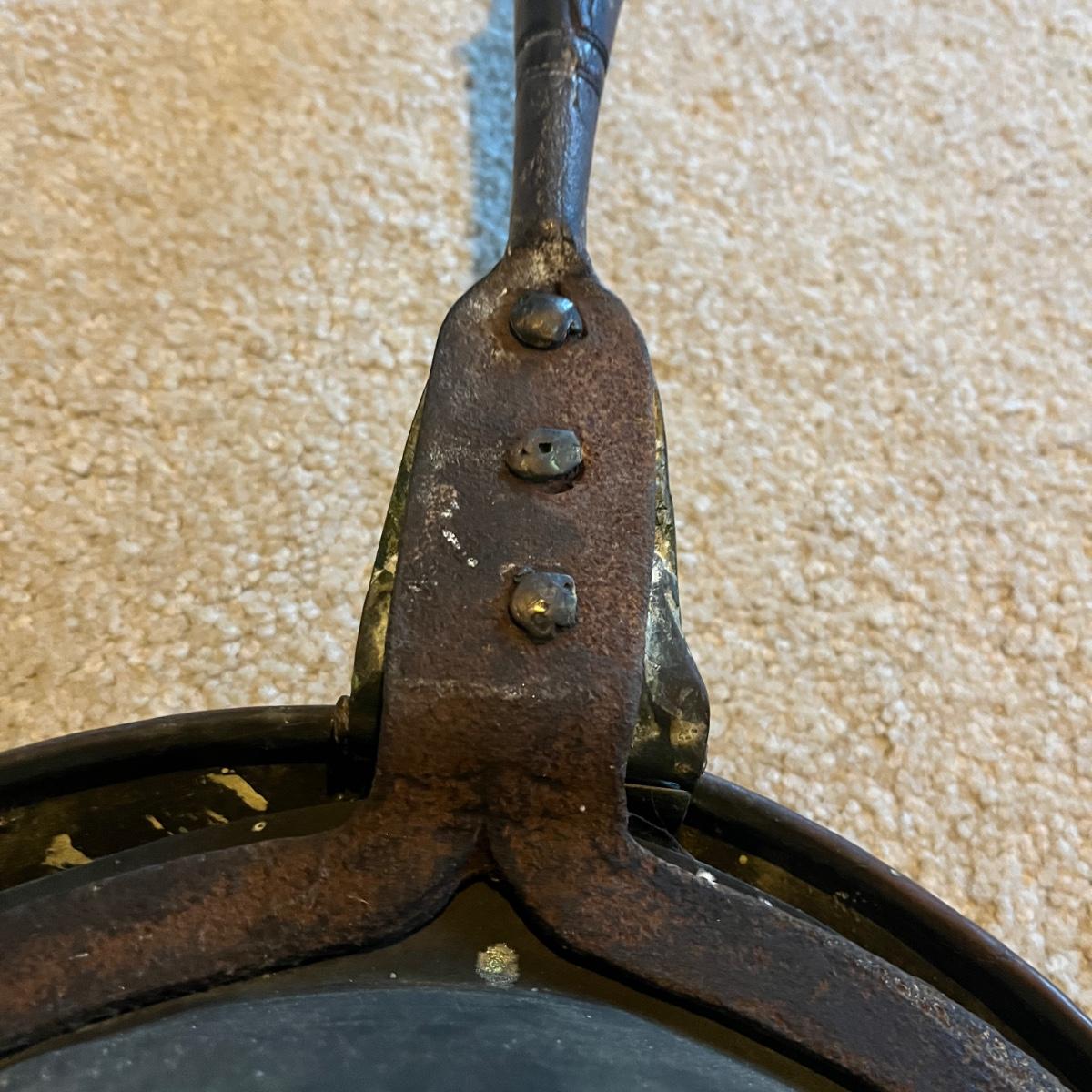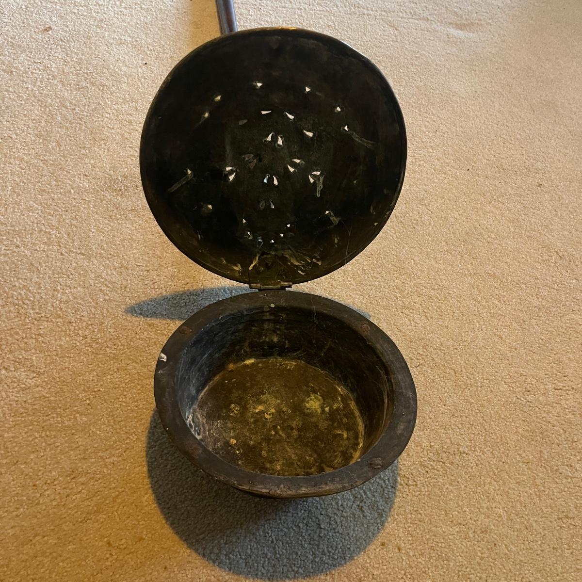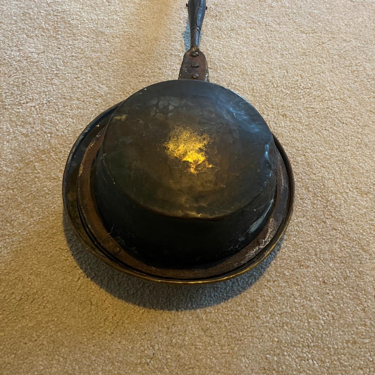 Lot includes a brass lidded bed warmer with metal pan and iron frame with wooden handle. Item measures 12” x 5” x 50” long.