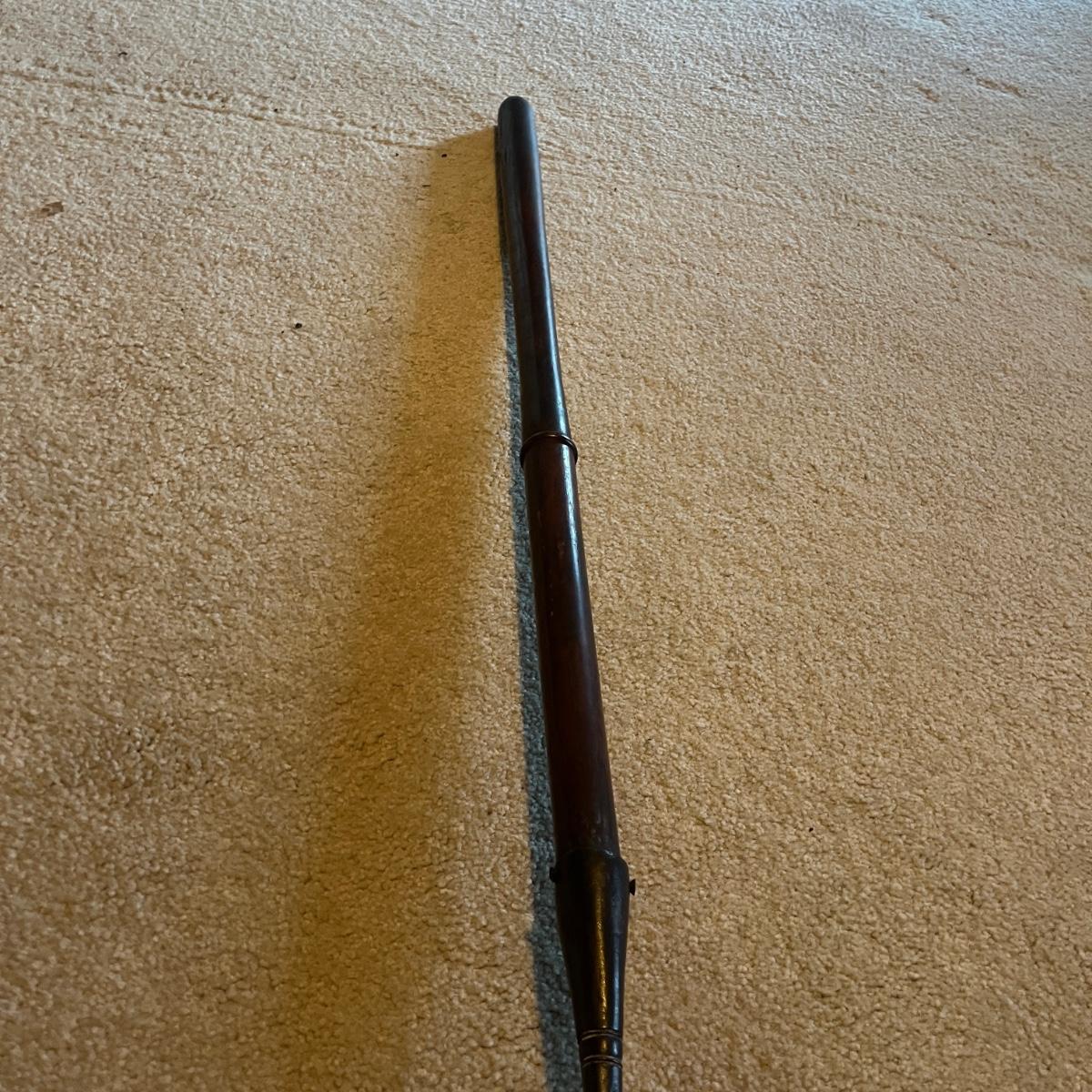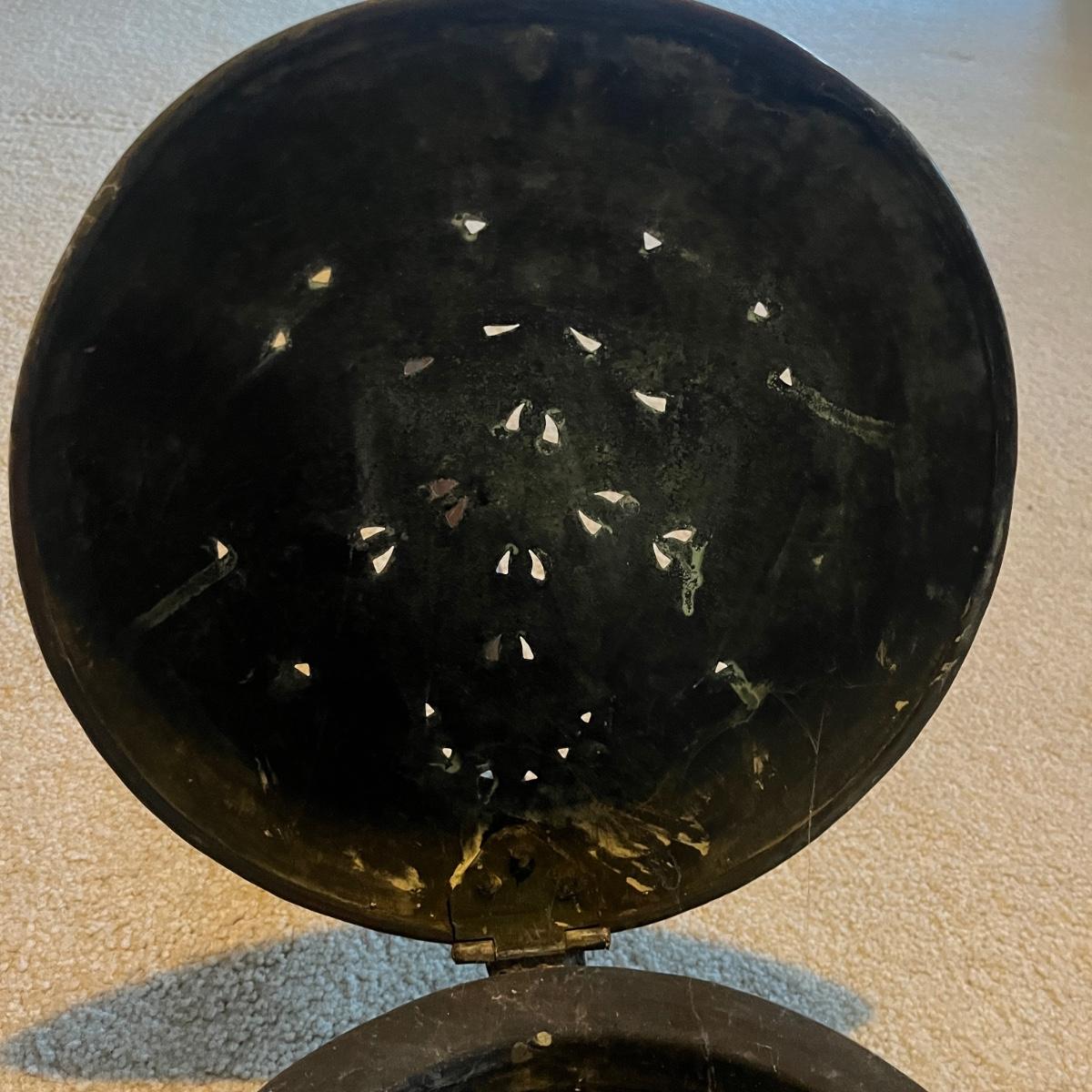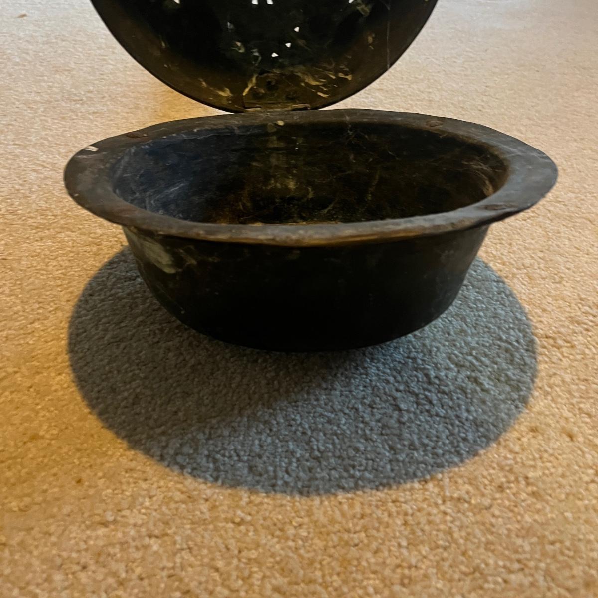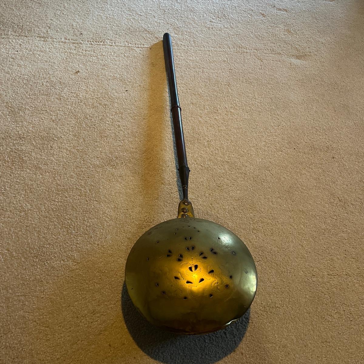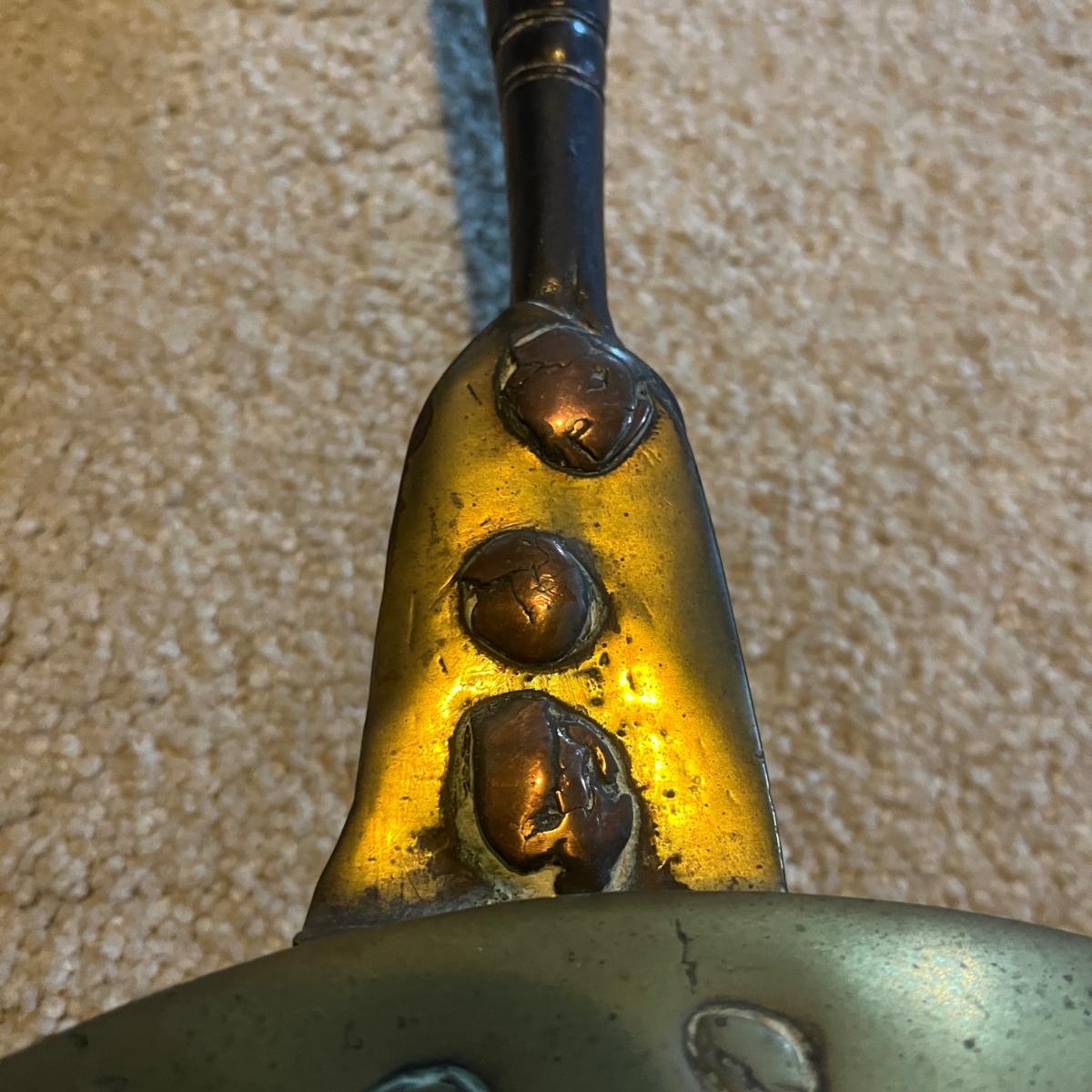 Lot includes a brass lidded bed warmer with metal pan and iron frame with wooden handle. Item measures 12” x 5” x 50” long.