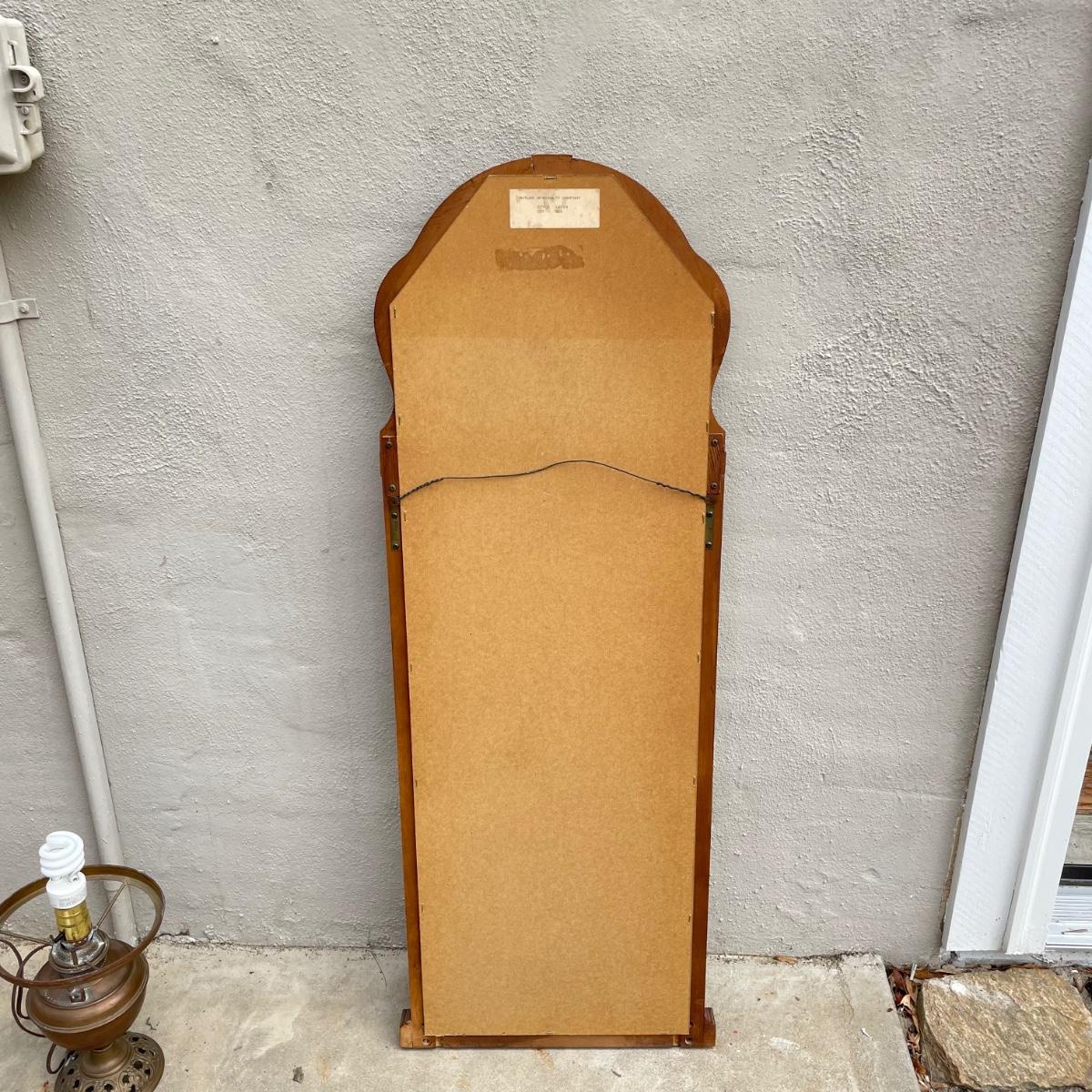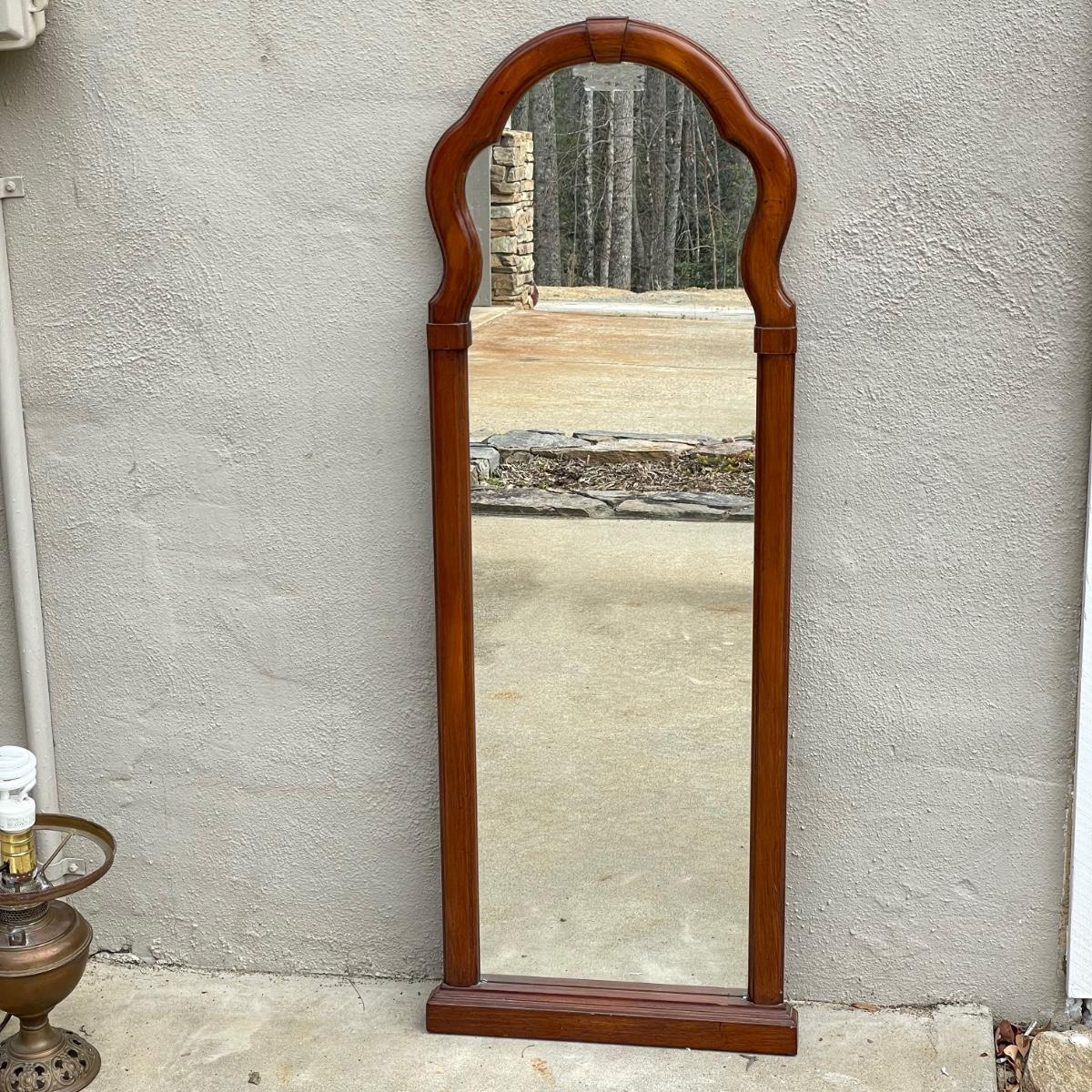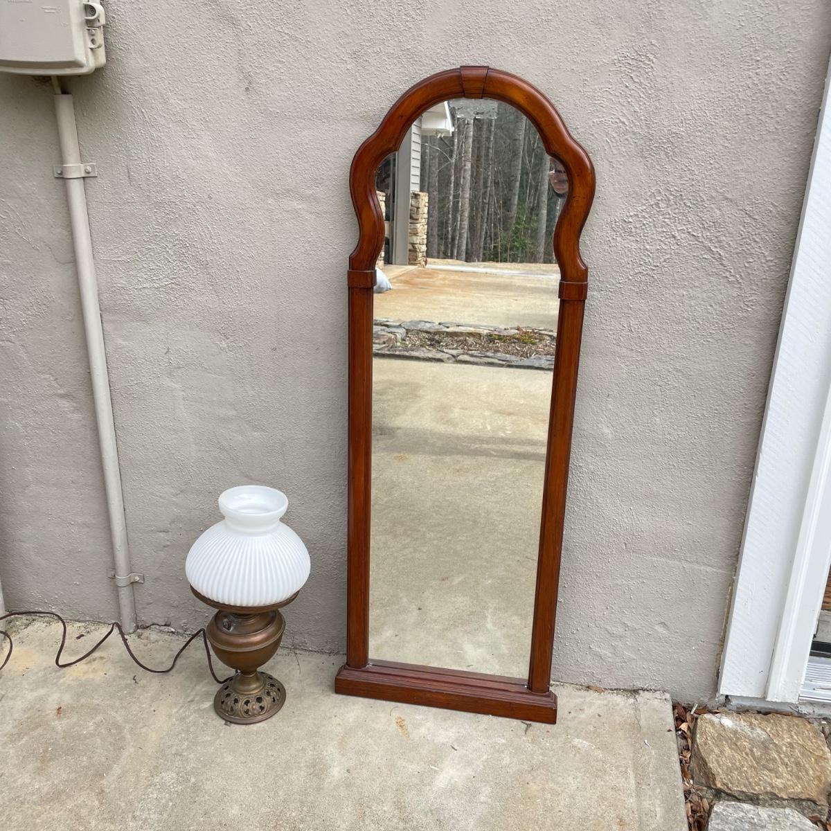 Wooden framed almost full-length mirror measures 14.5” x 42”. It has a strip of adhesive near the top of the mirror. Lot also includes an electric brass lamp with a scalloped milk glass shade. Lamp measures approximately 8” x 16.25”. The shade sits loosely on the brass lamp. See images. Shipping available. Please call UPS with dimensions at 828-252-6930 for a shipping quote prior to bidding.
