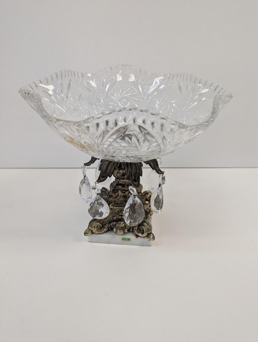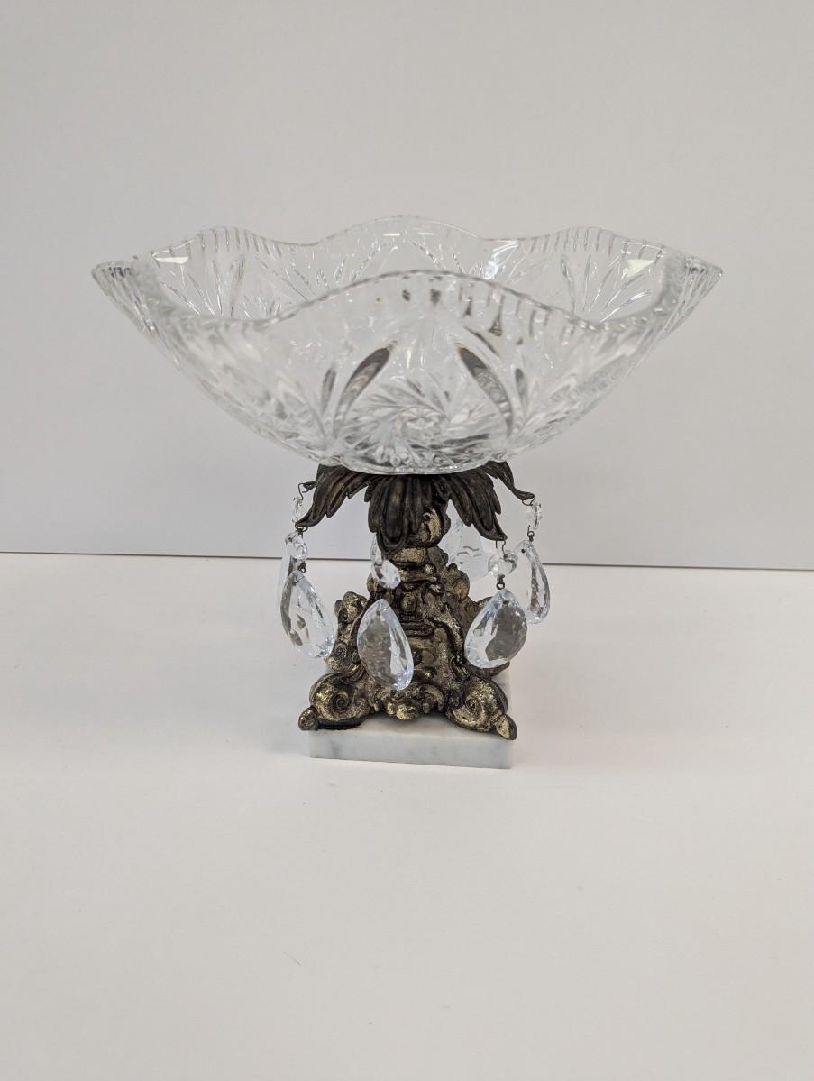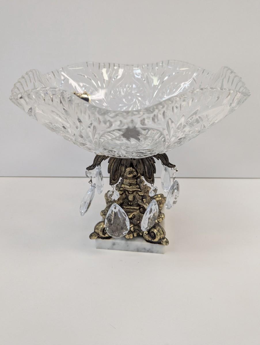 Brass Monarch Lead Crystal Pedestal Compote Bowl Drop Crystals With Marble Base