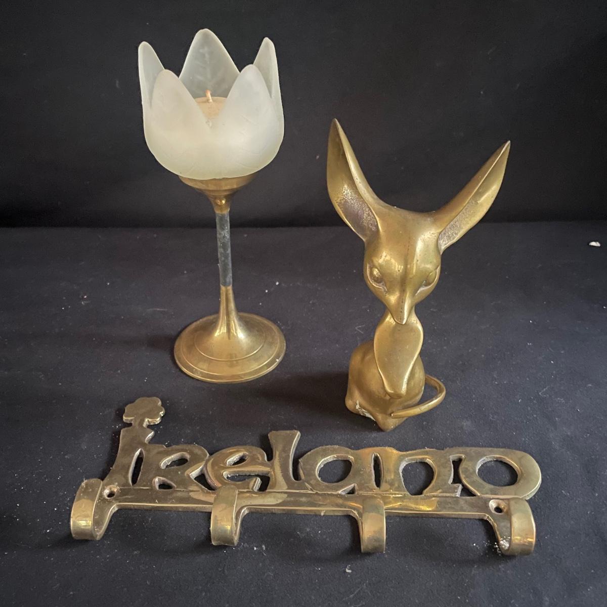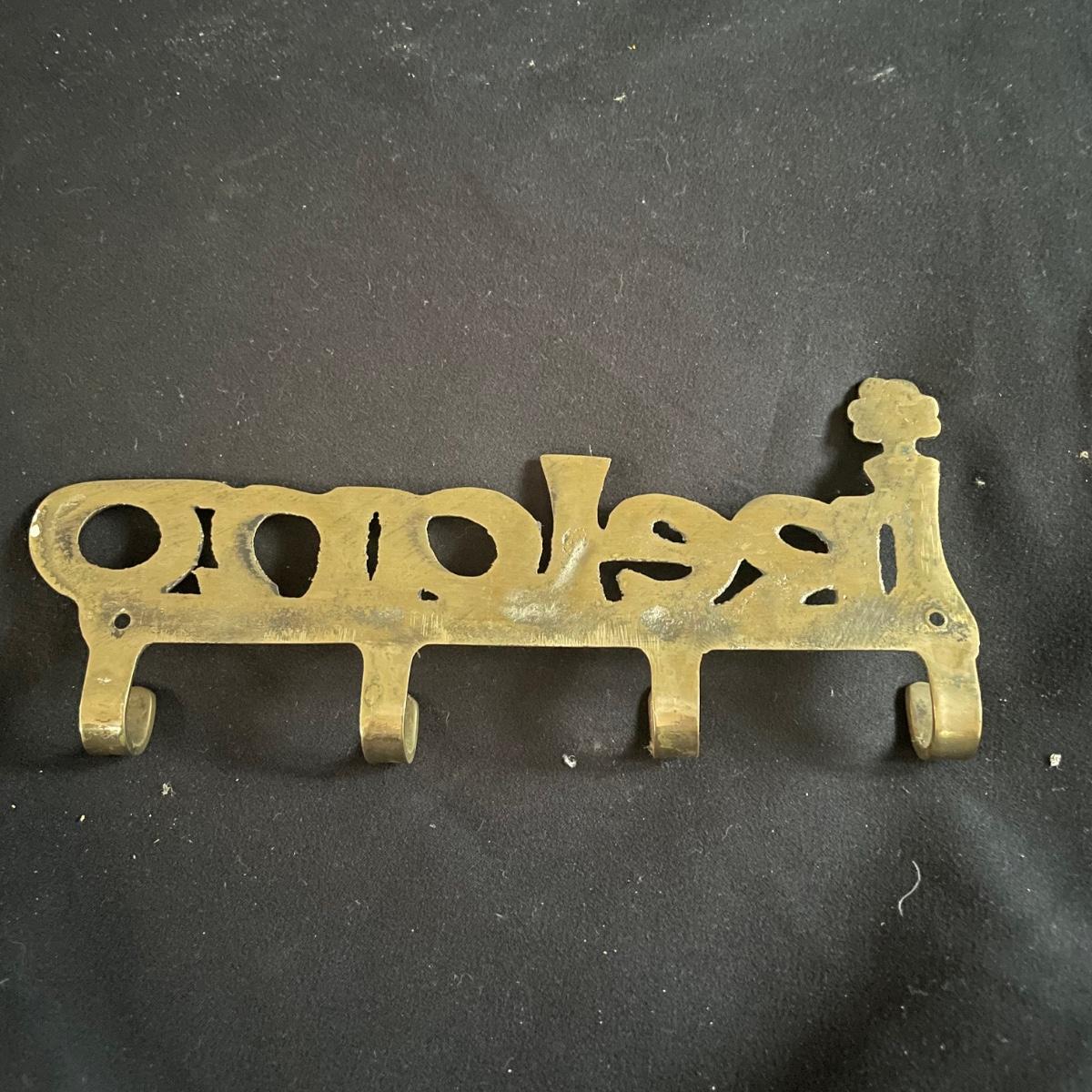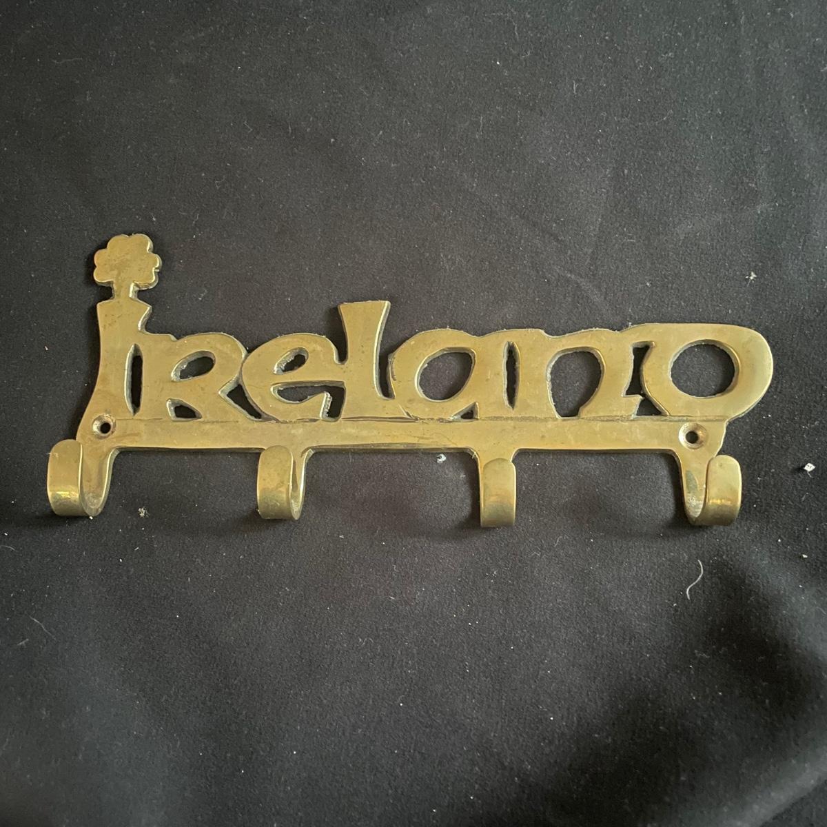 This solid brass mouse measures 2” x 3” x 5”. The candle holder is brass with frosted glass and holds a tea light. The small Ireland key rack has four hooks.