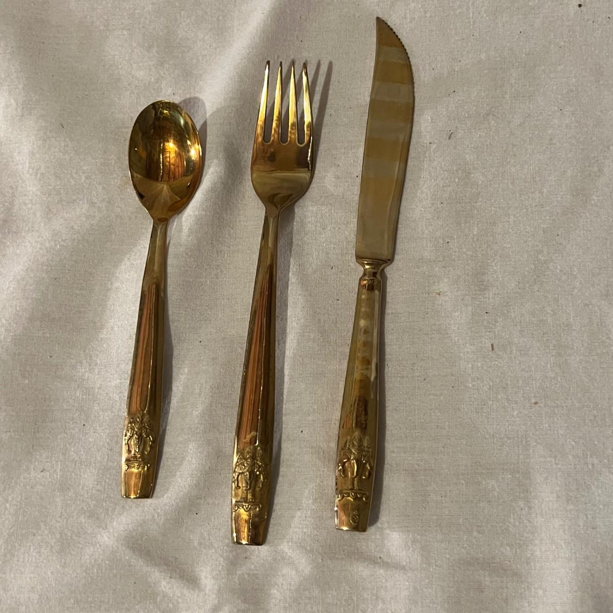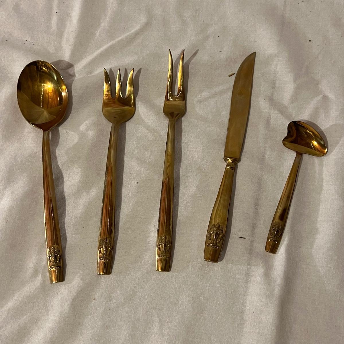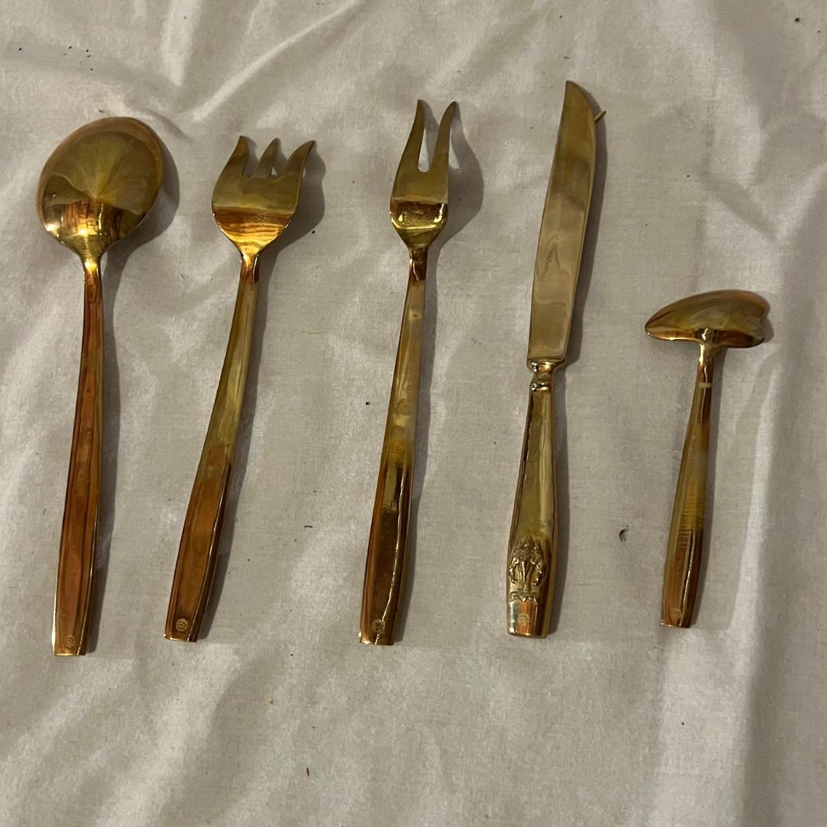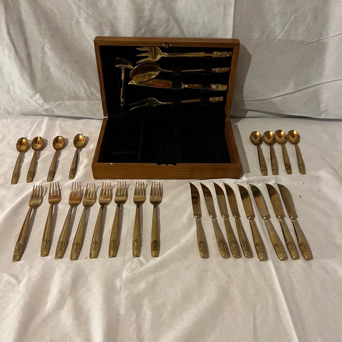 A complete setting of what appears to be nickel brass flatware for eight with five serving utensils. Forks are 7.25” long, spoons are 6” long and serrated knives are 8.25” long. The set comes in a wooden box.