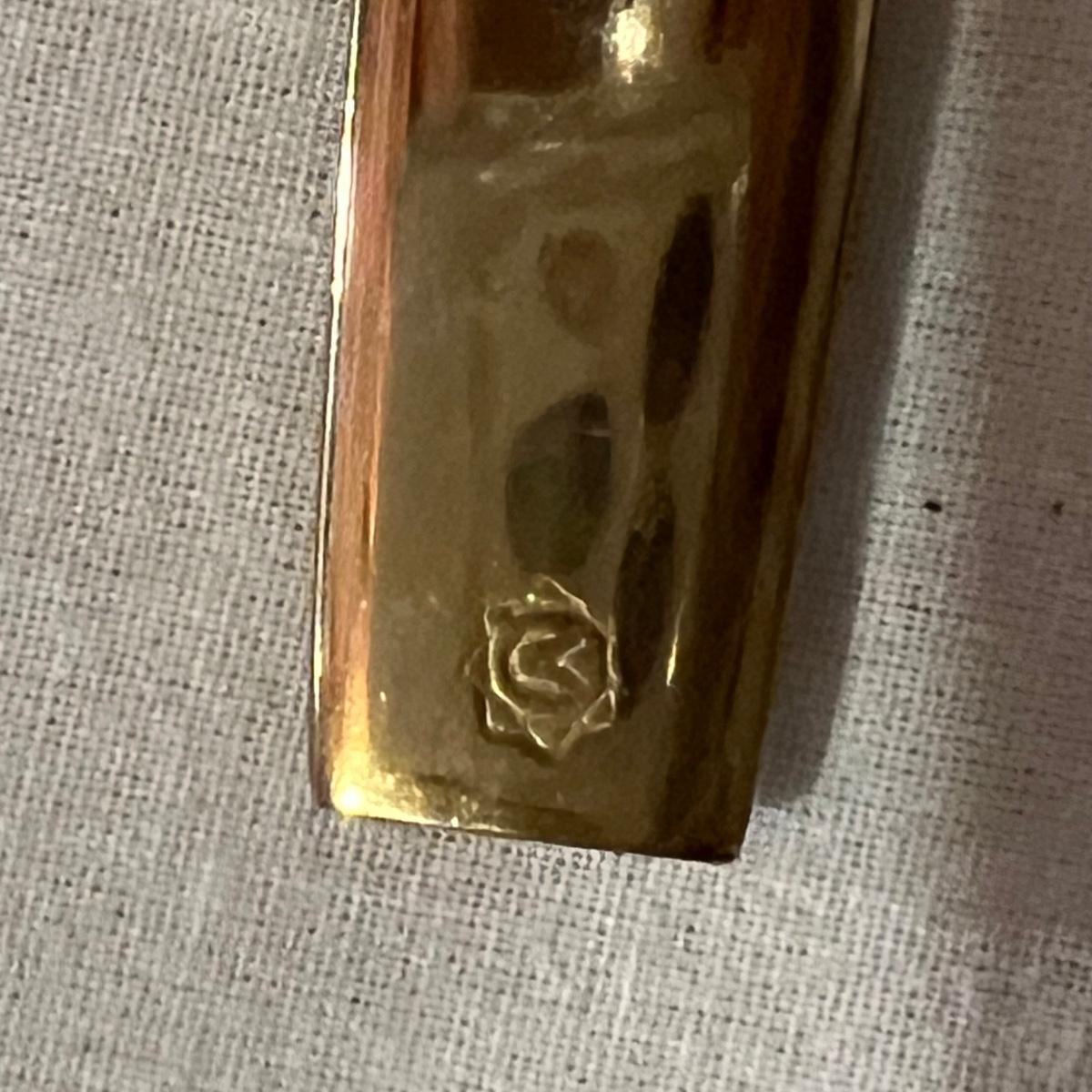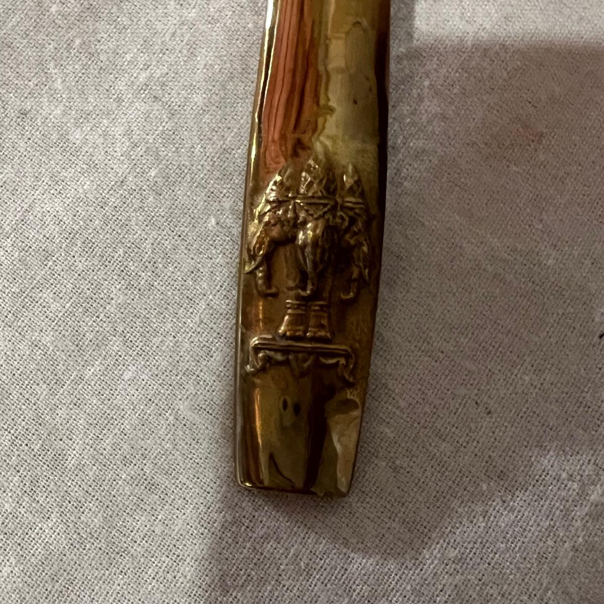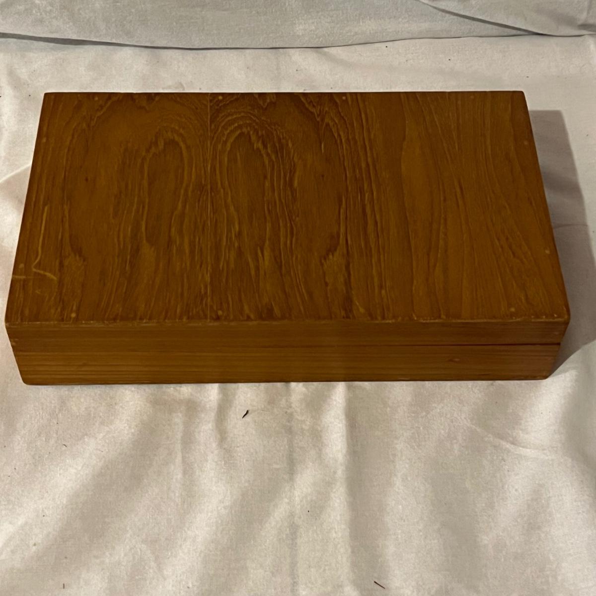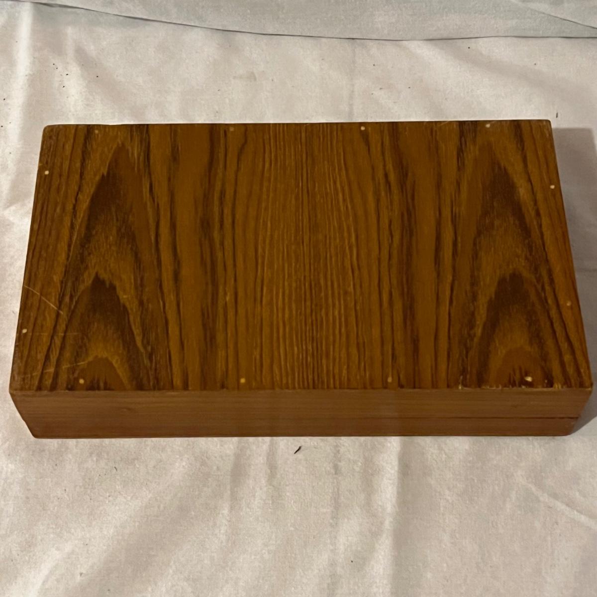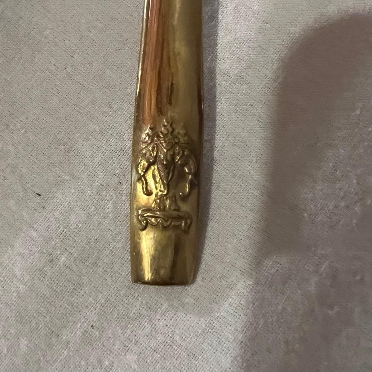 A complete setting of what appears to be nickel brass flatware for eight with five serving utensils. Forks are 7.25” long, spoons are 6” long and serrated knives are 8.25” long. The set comes in a wooden box.