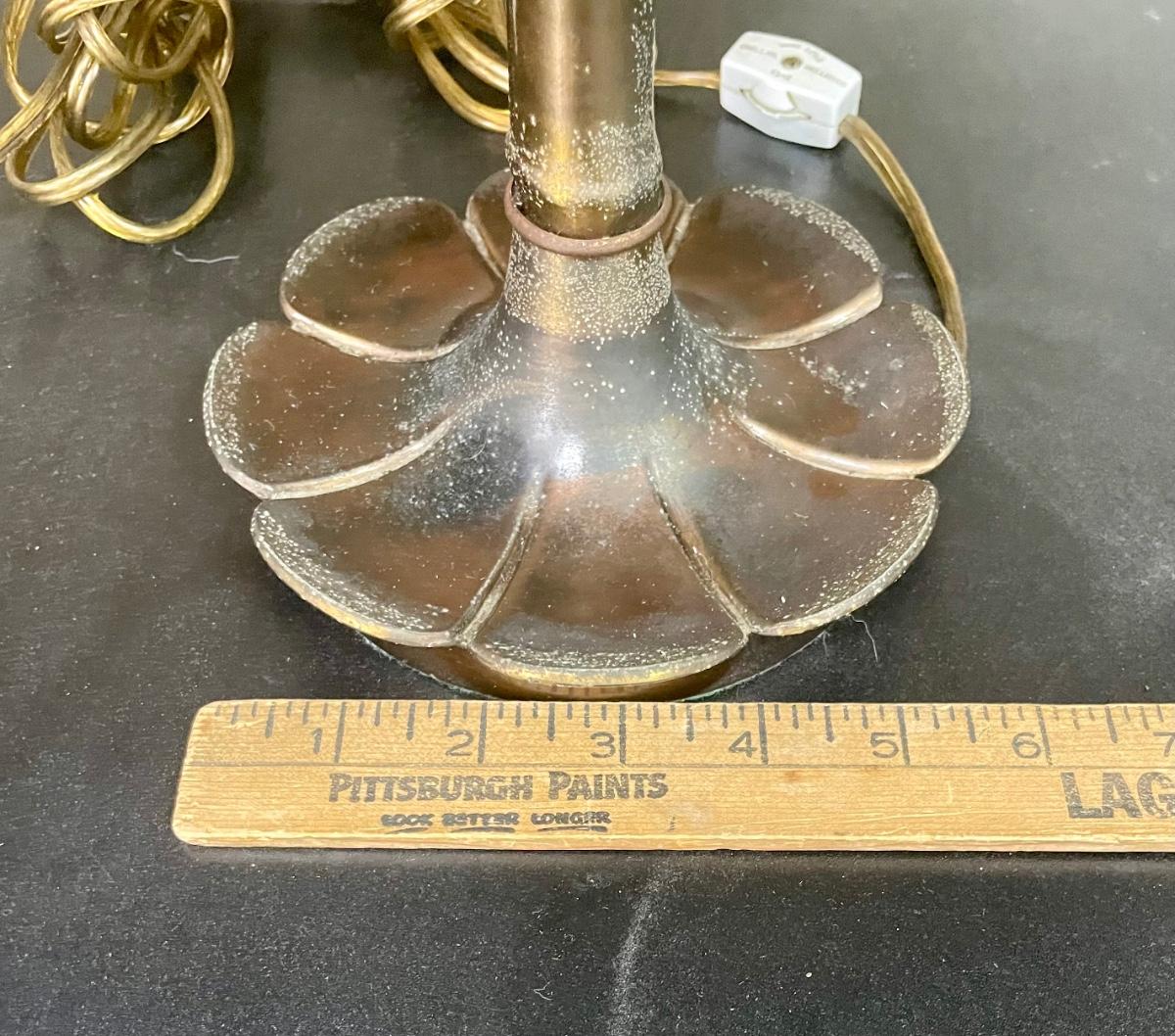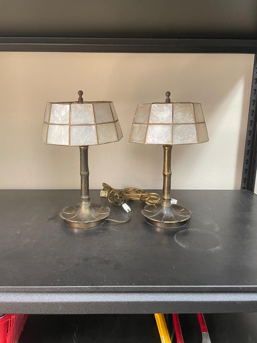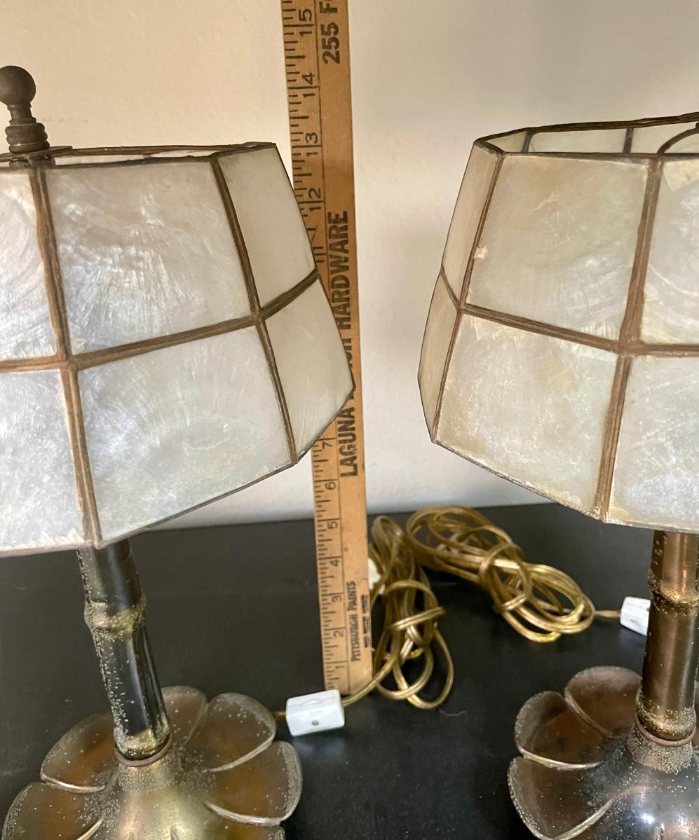 Tiffany Style Bronze Nightstand Lamps with Capiz Shell Shades and unique petal-like base