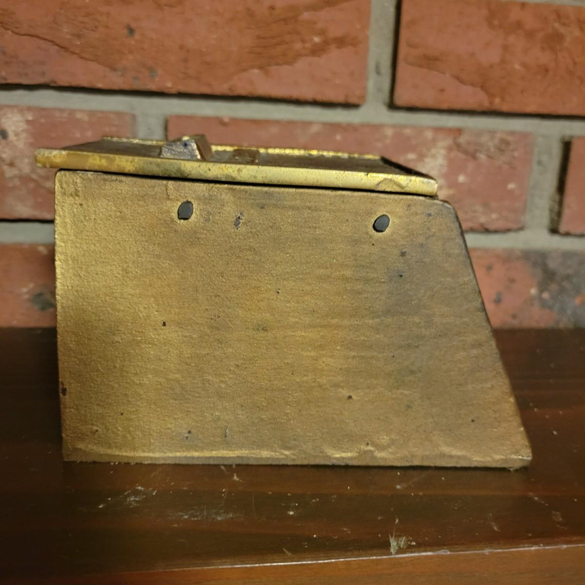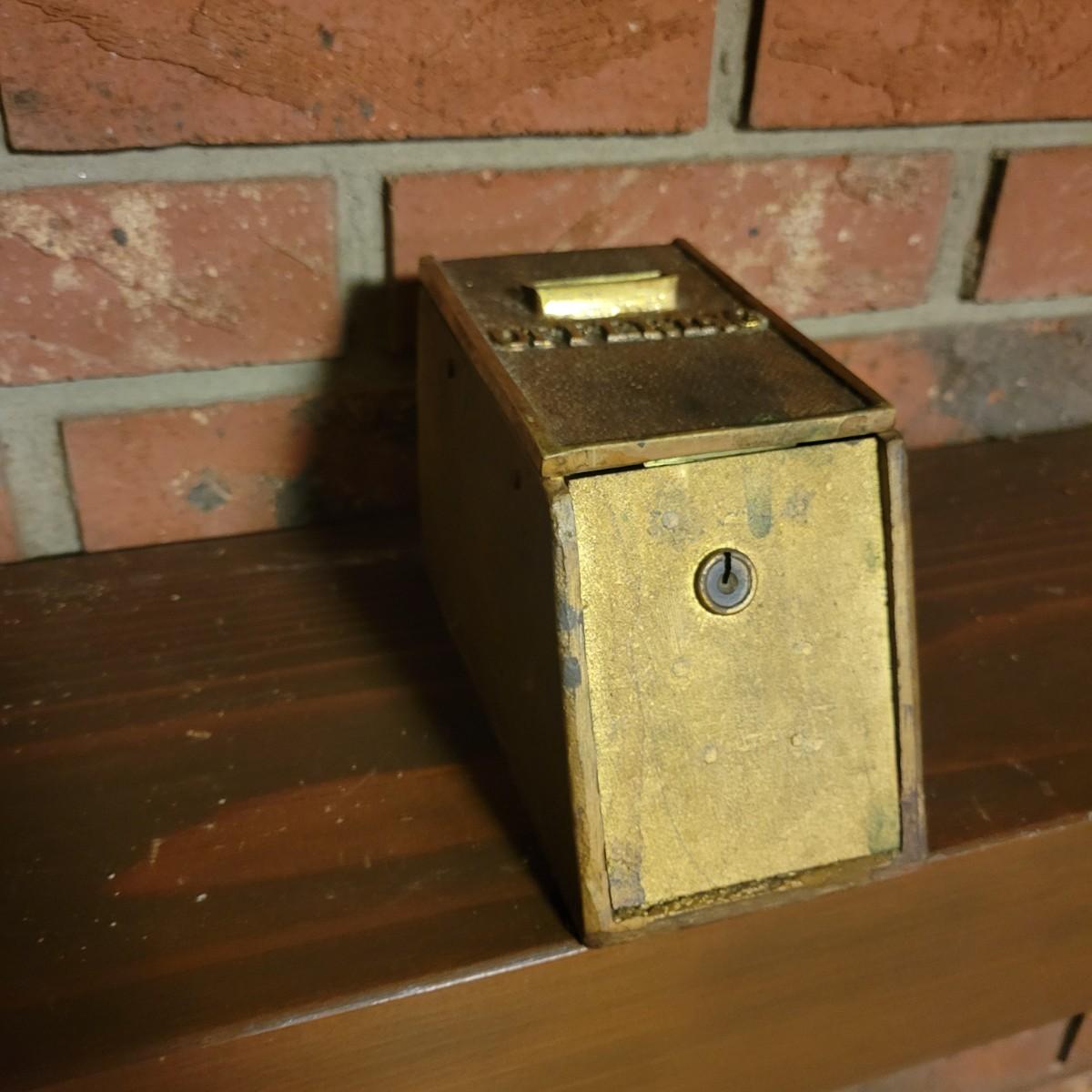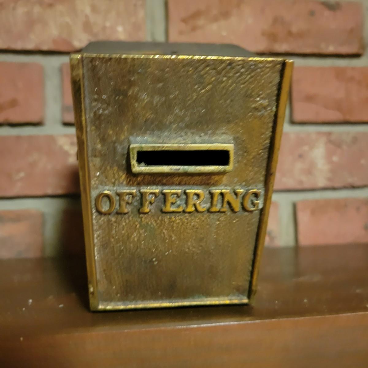 A brass offering Box that appears to be cast and measures approximately 3" x 6" x 4"H. There is no key to open the box with. Shipping available
