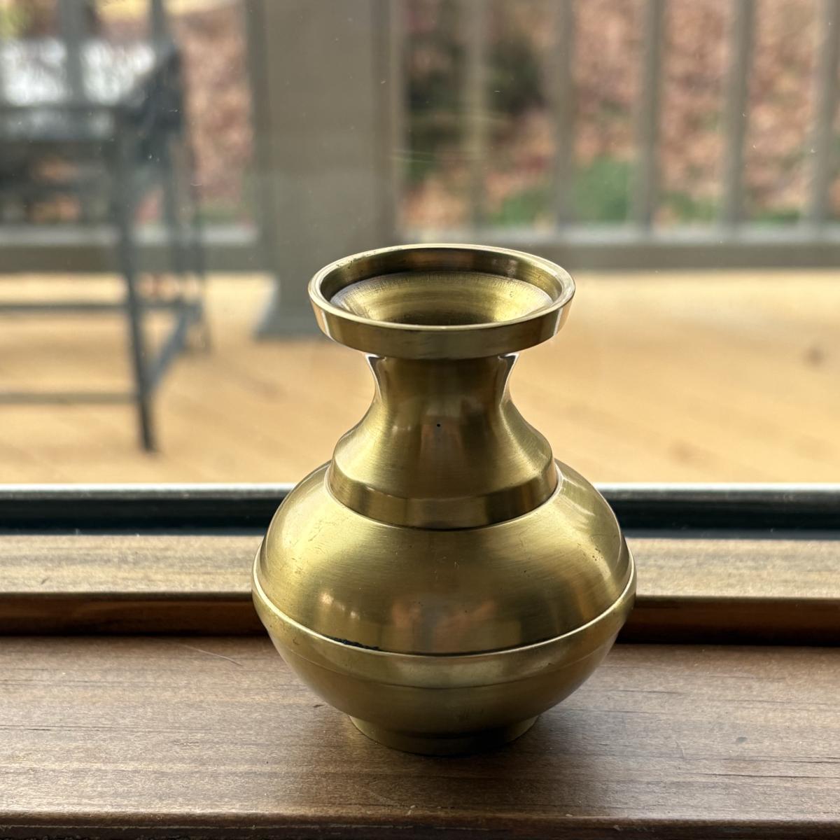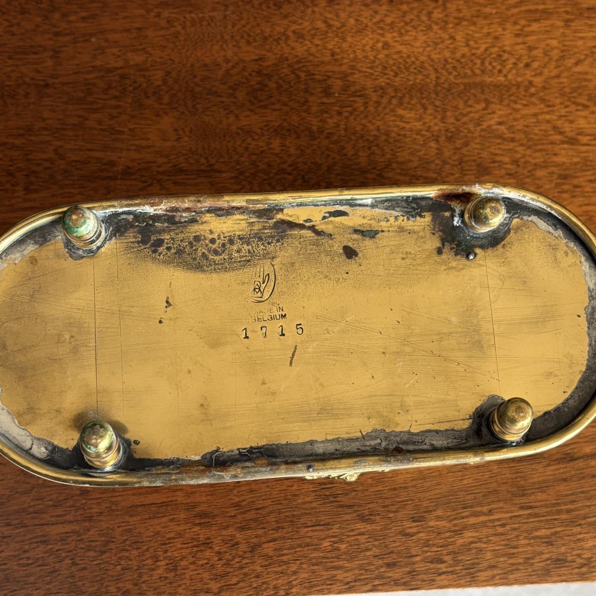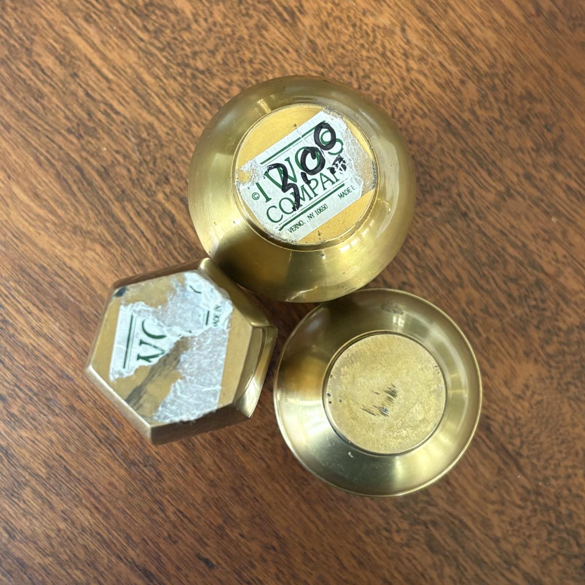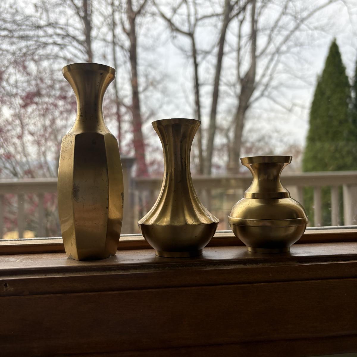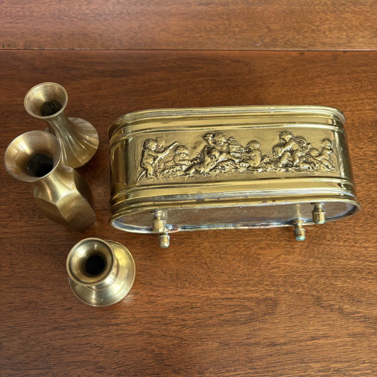 This lot includes 4 brass pieces - one oval planter with elaborate repoussé work and 3 bud vases in staggering heights, with the tallest measuring at approximately 5" tall and the shortest at 3". The oval planter appears to be made in belgium with measurements of approximately 9" x 3.5" x 4"H.