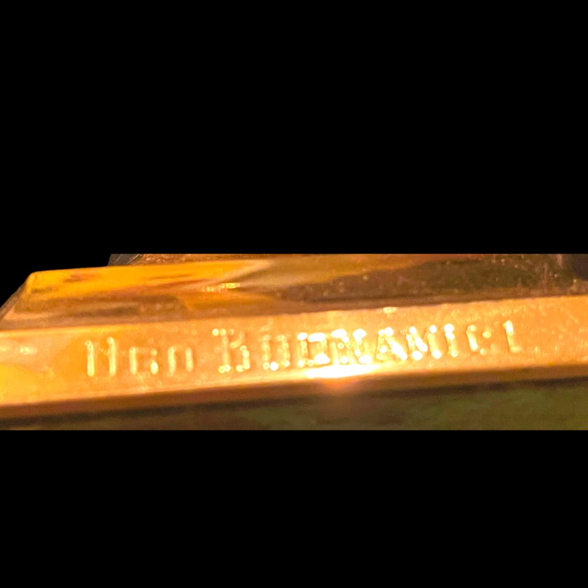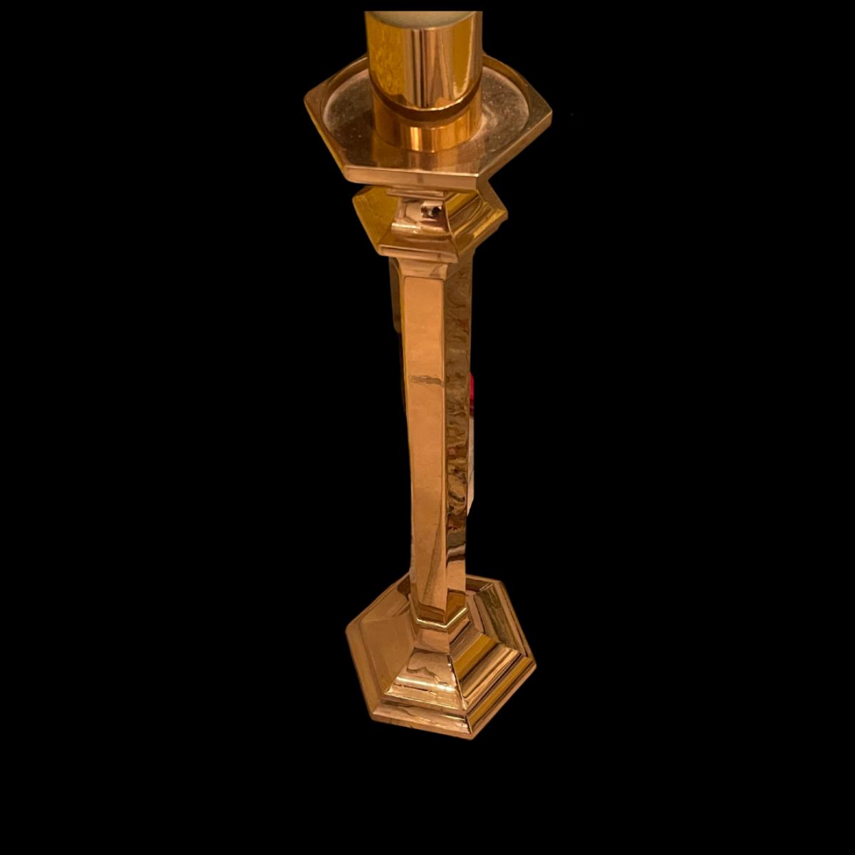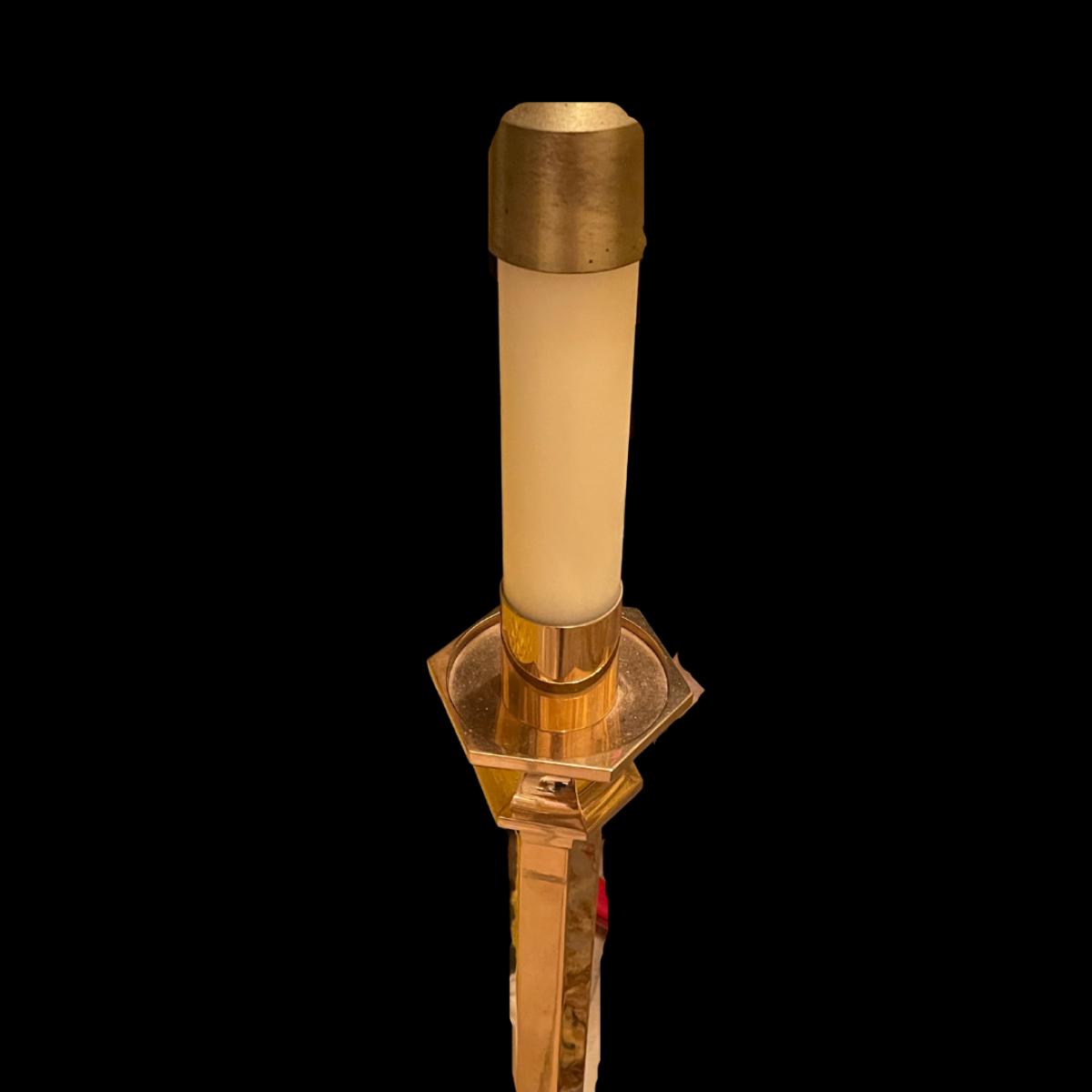 Paschal Candles are used at the Liturgy of Baptism. This particular candle was engraved with the child's name on it. Ugo Buonamici lived from 1902 - 1958 in Yearington, Nevada. This candle was found after Katrina in New Orleans. The Buonamici family is originally from Italy. What a mystery how this piece ends up in New Orleans. This piece has a tremendous amount of history waiting to be unlocked. It is solid bras and about 36".