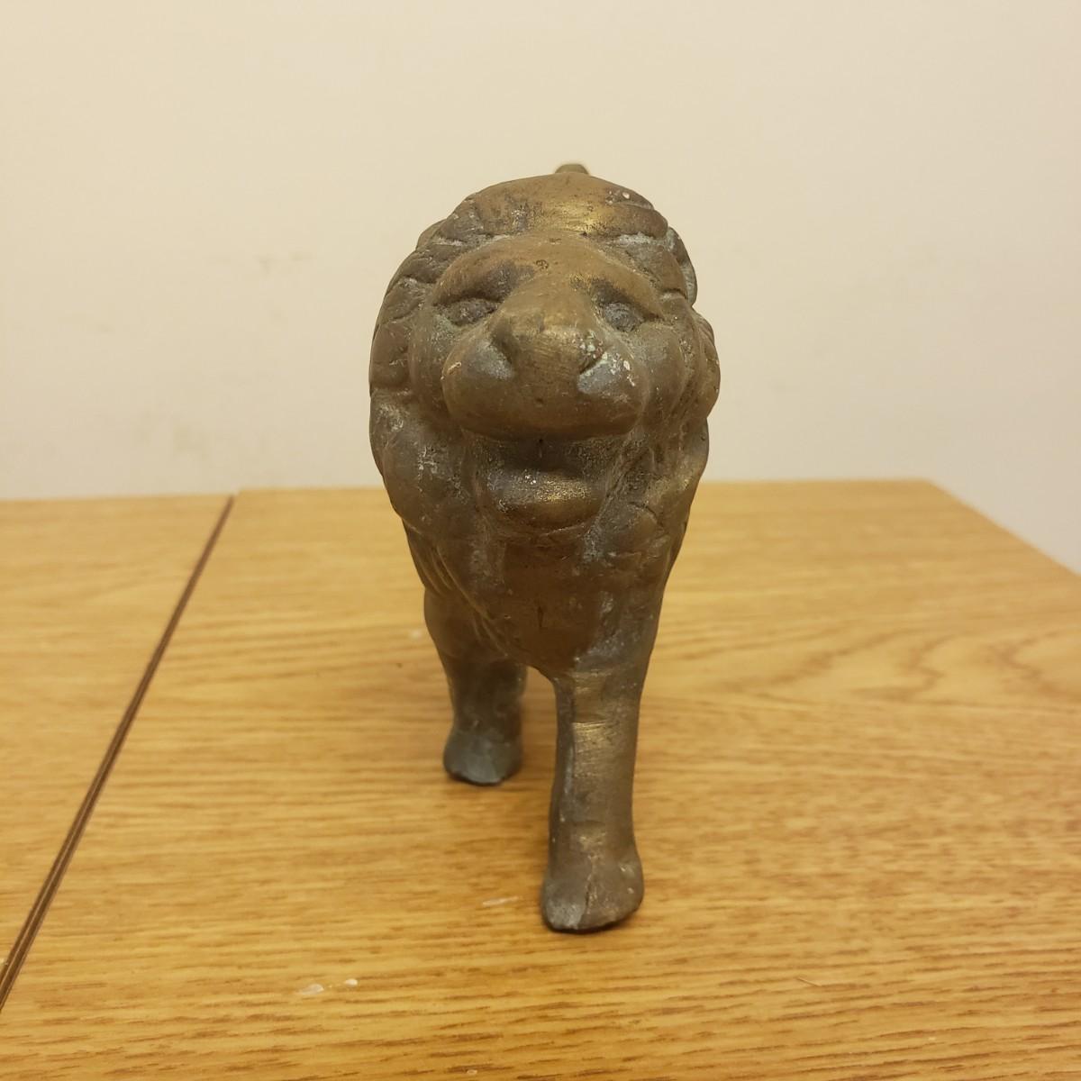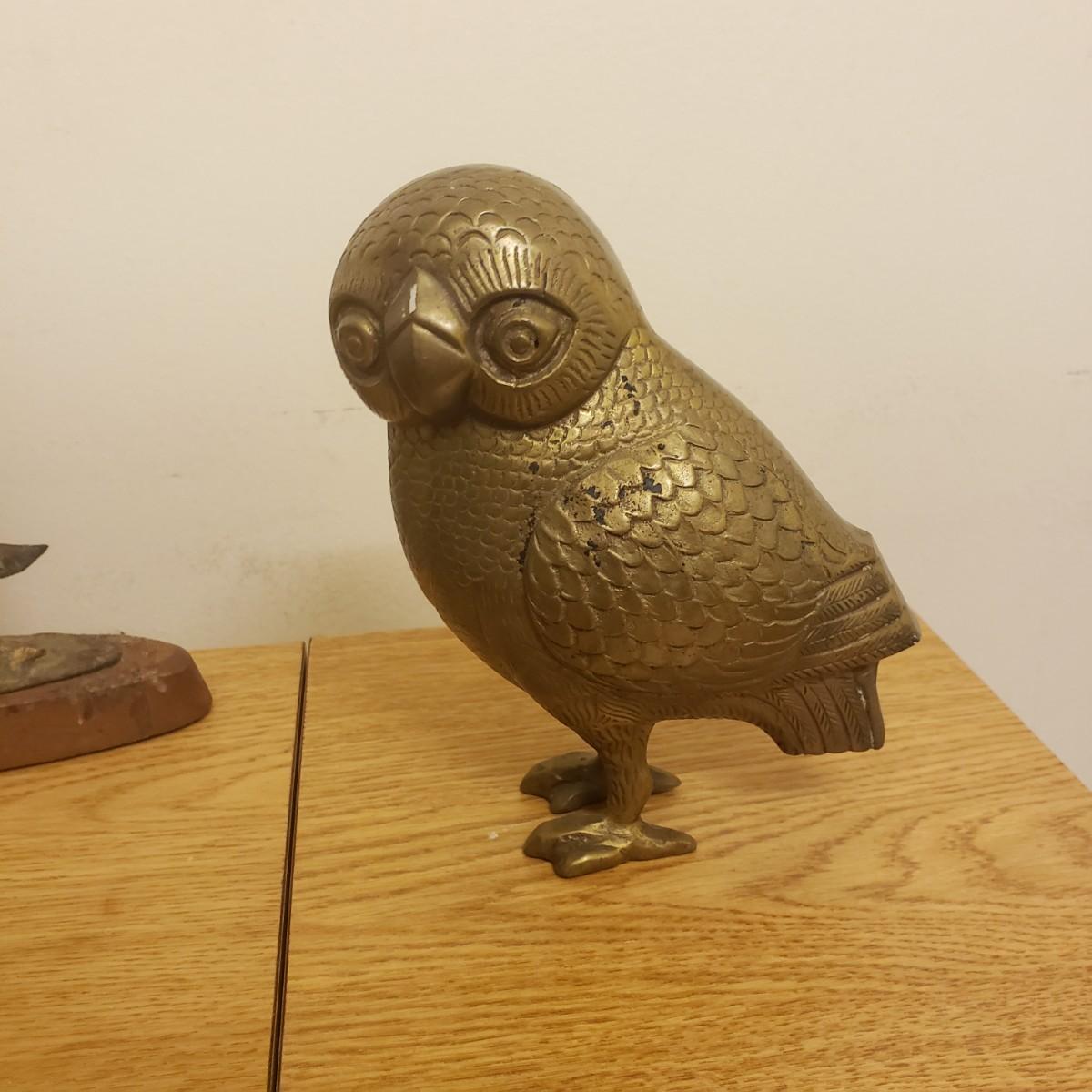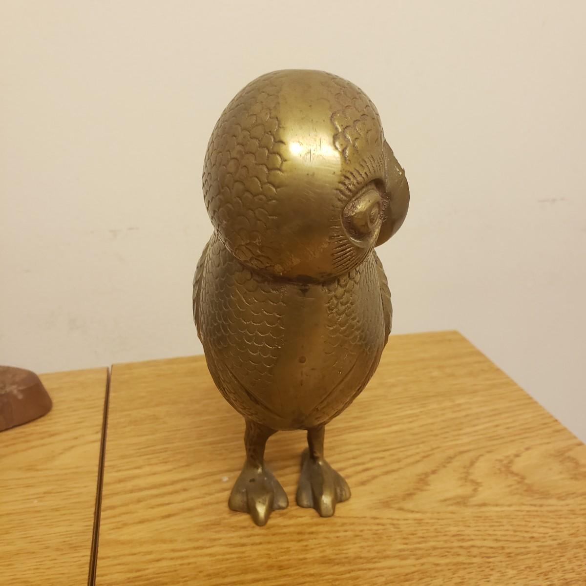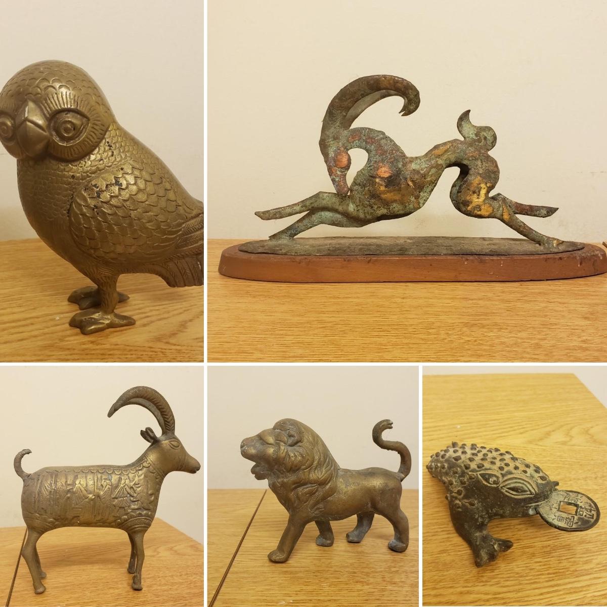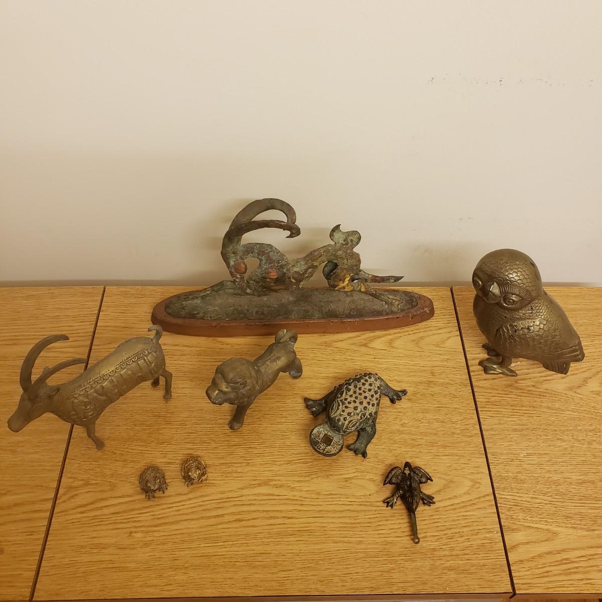 This eight piece brass and metal lot features some unique pieces. The brass owl measures 6" x 3" x 7"H. There are two Feng Shi money frogs. The Ibex sculpture is possibly by artist Bill Lett in the brutalist style. This piece measures 14" x 3" x 7"H.