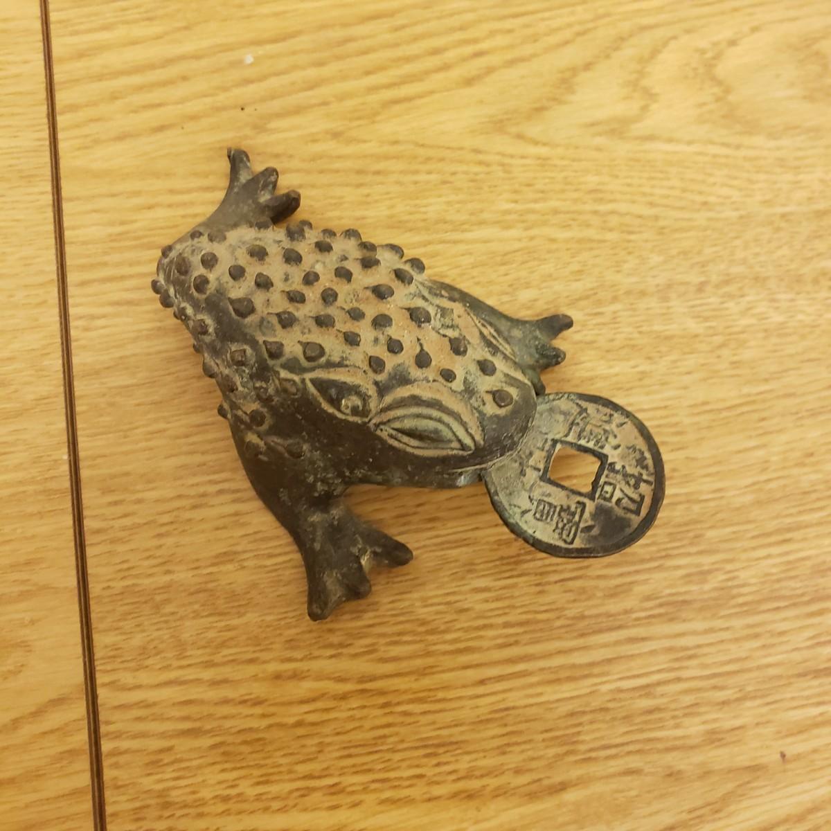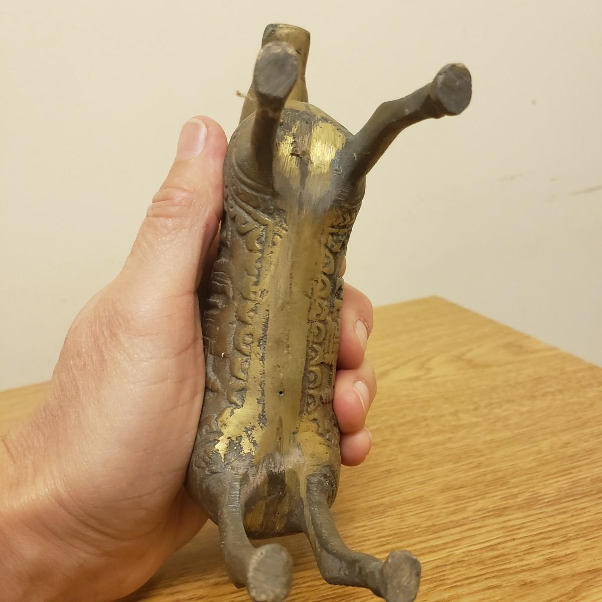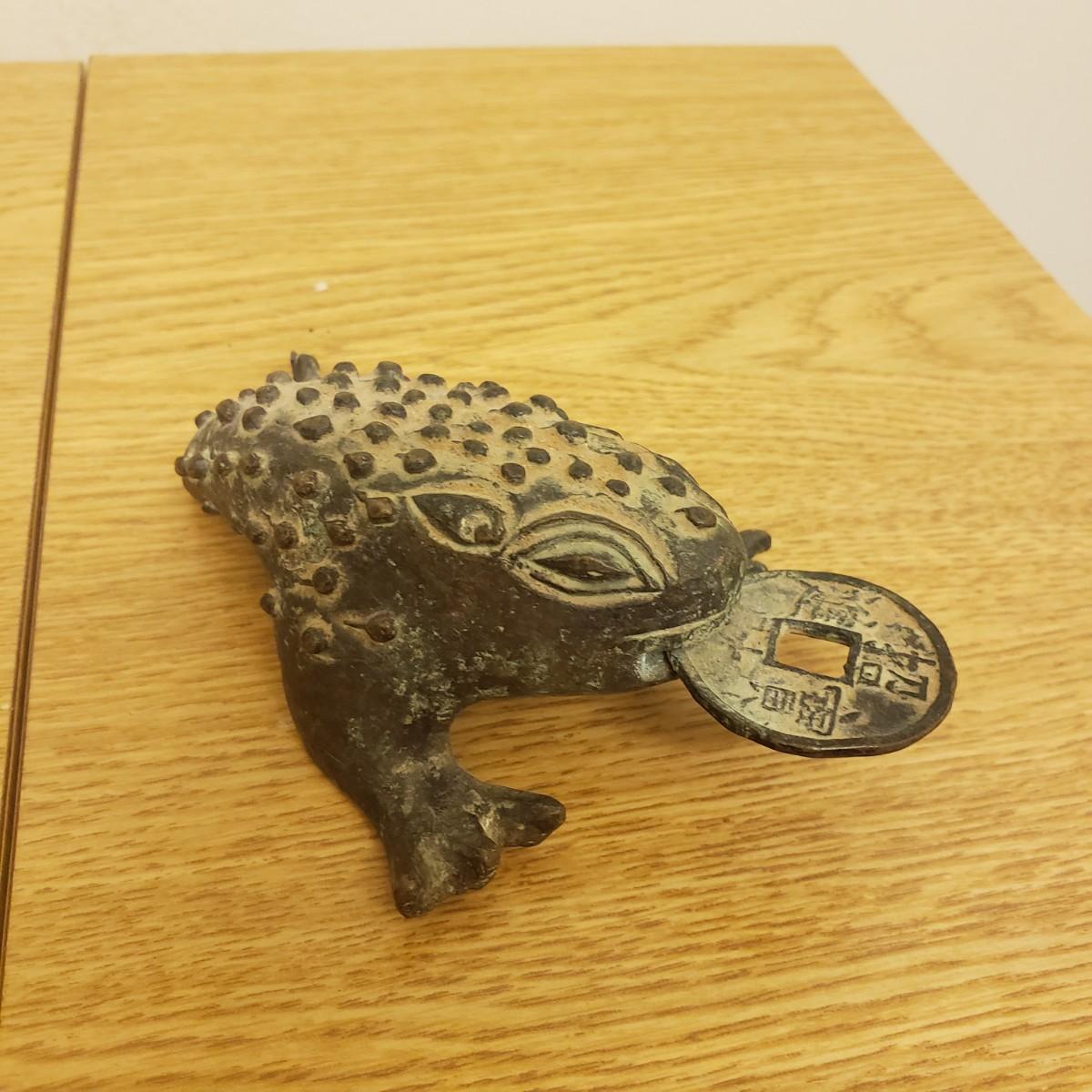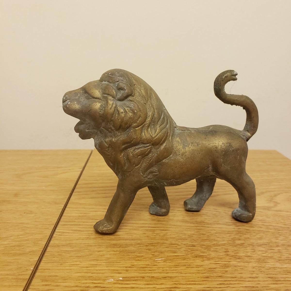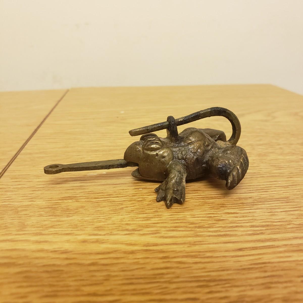 This eight piece brass and metal lot features some unique pieces. The brass owl measures 6" x 3" x 7"H. There are two Feng Shi money frogs. The Ibex sculpture is possibly by artist Bill Lett in the brutalist style. This piece measures 14" x 3" x 7"H.