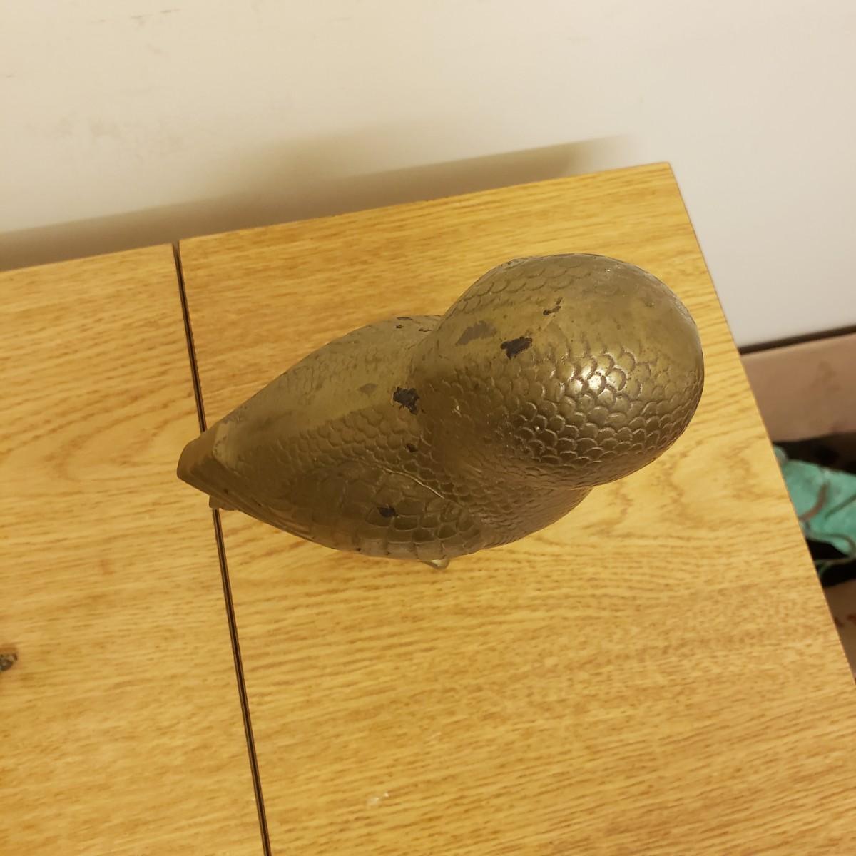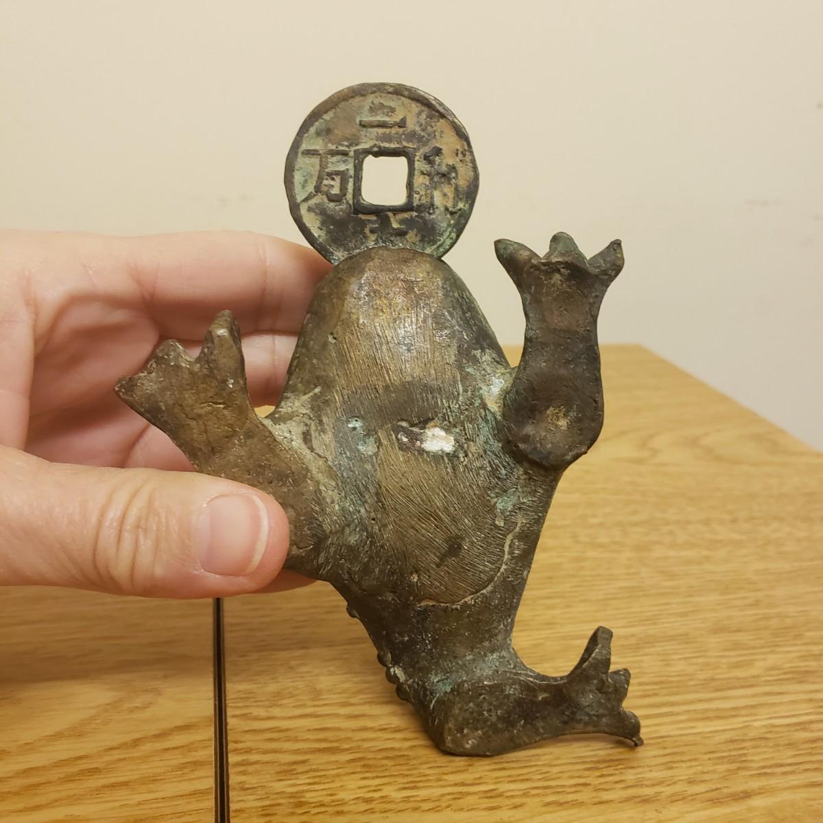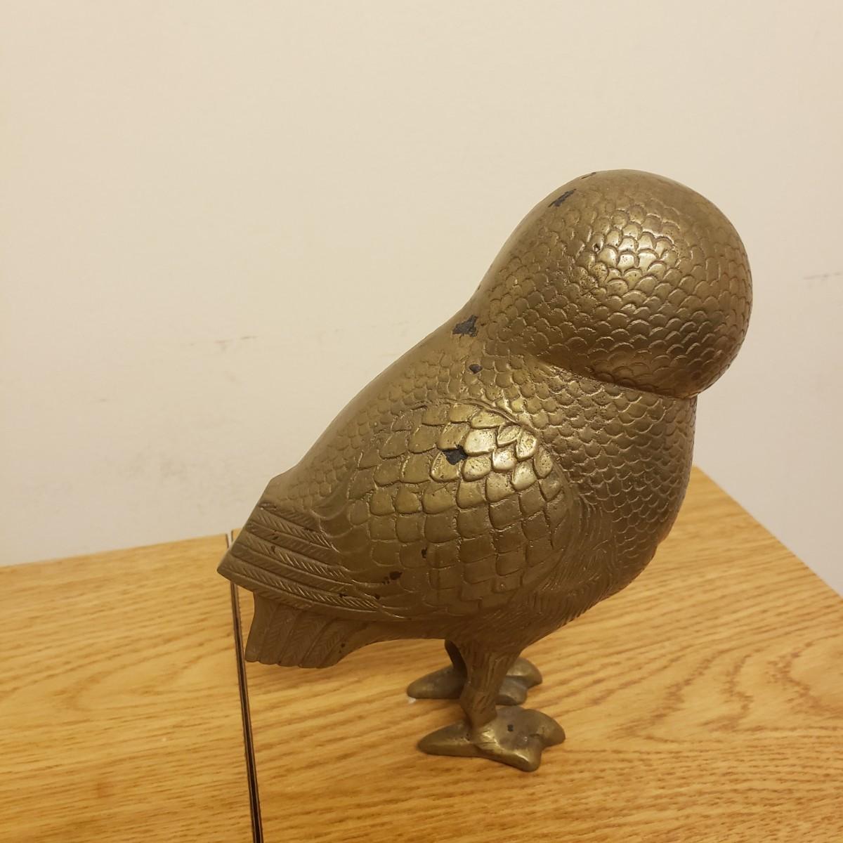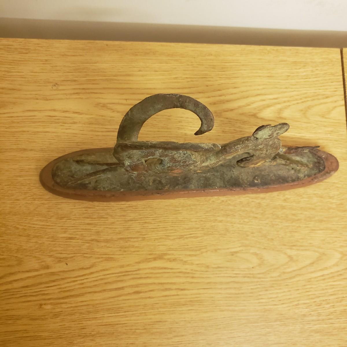 This eight piece brass and metal lot features some unique pieces. The brass owl measures 6" x 3" x 7"H. There are two Feng Shi money frogs. The Ibex sculpture is possibly by artist Bill Lett in the brutalist style. This piece measures 14" x 3" x 7"H.