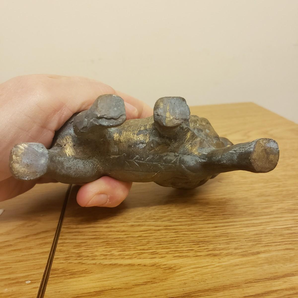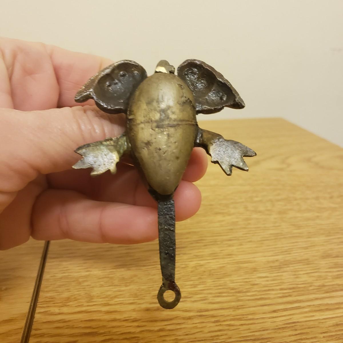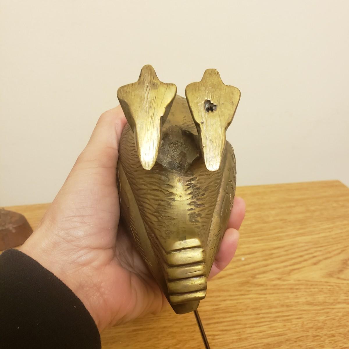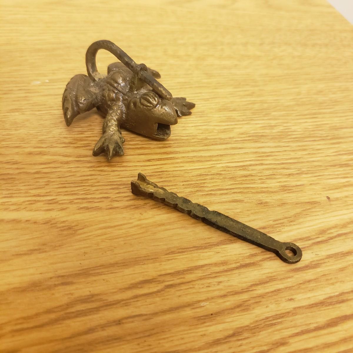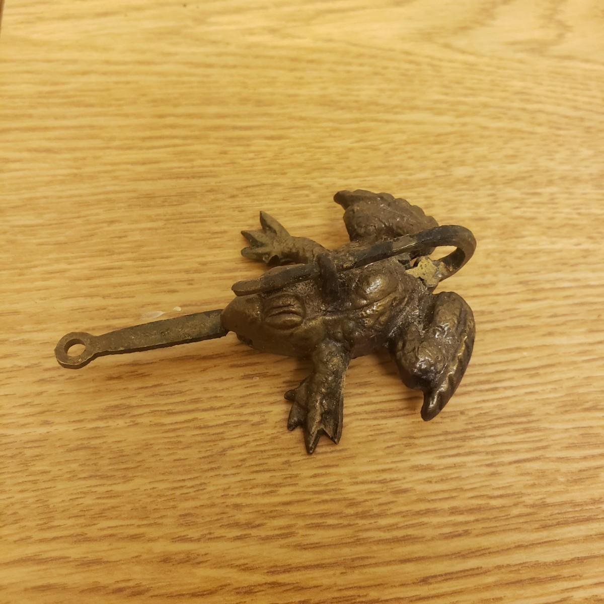 This eight piece brass and metal lot features some unique pieces. The brass owl measures 6" x 3" x 7"H. There are two Feng Shi money frogs. The Ibex sculpture is possibly by artist Bill Lett in the brutalist style. This piece measures 14" x 3" x 7"H.