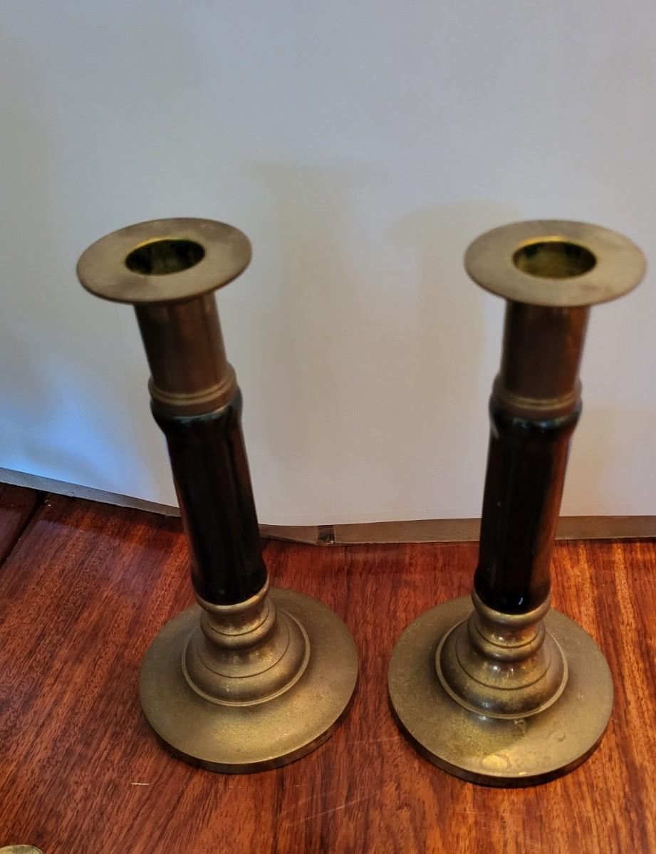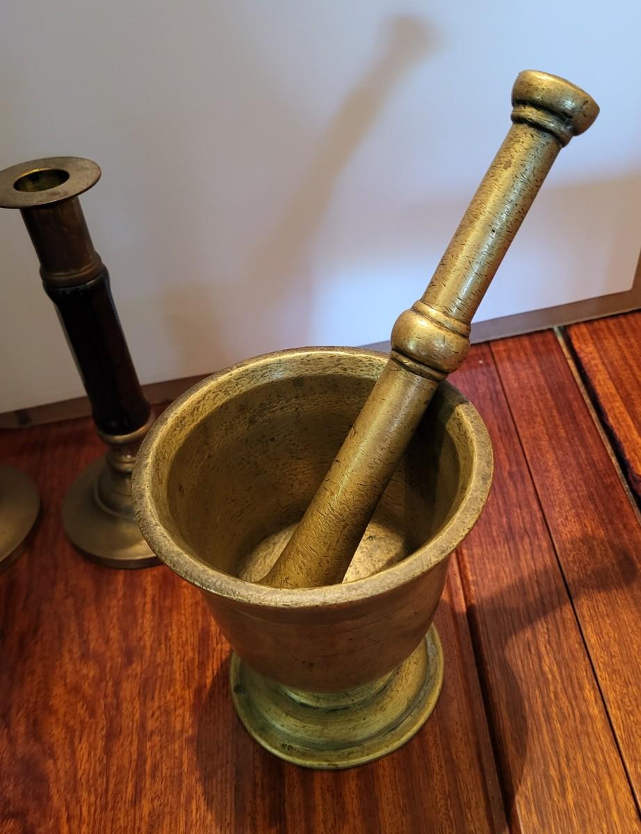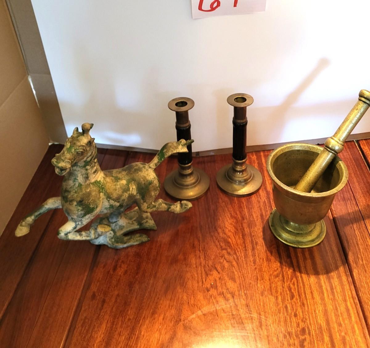 BRASS PESTLE AND MORTAR, CANDLESTICKS AND CAST HORSE