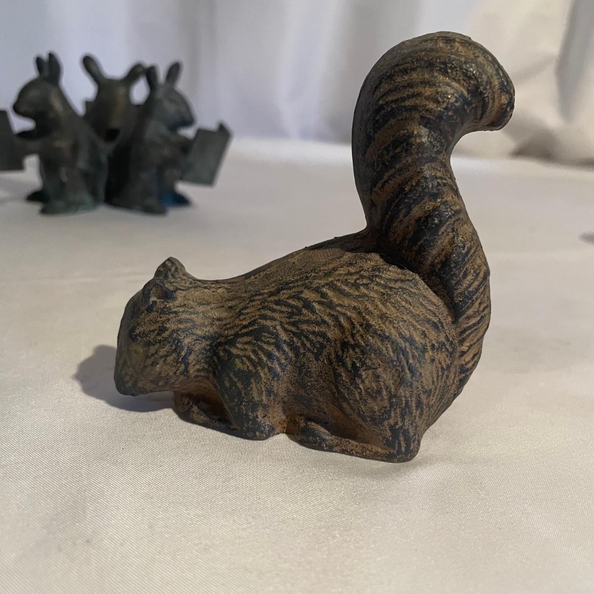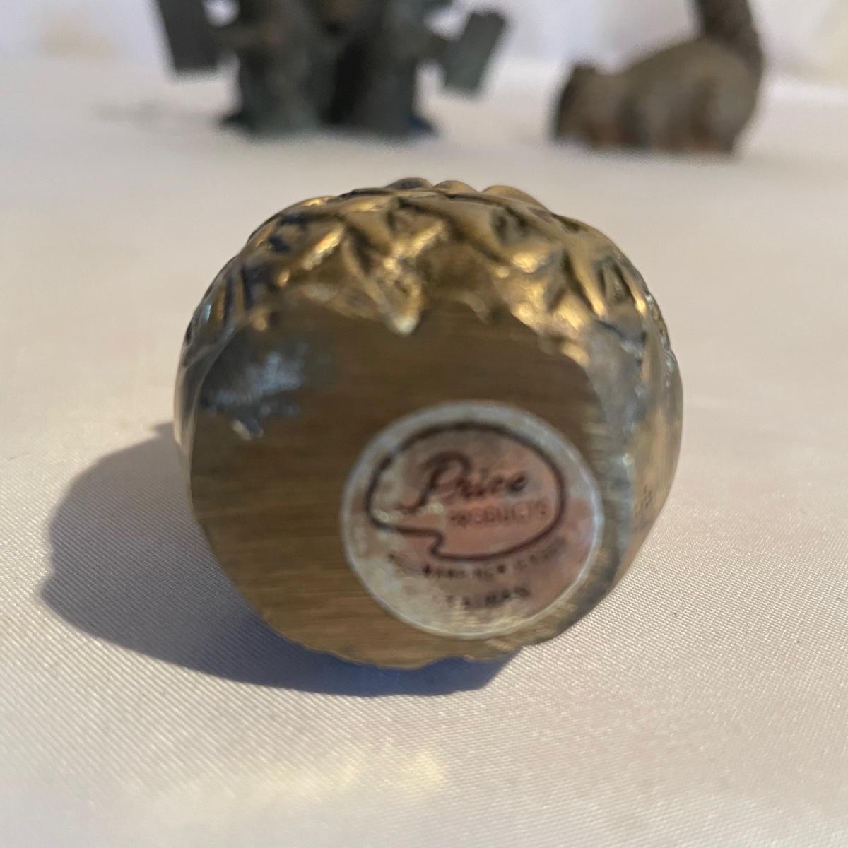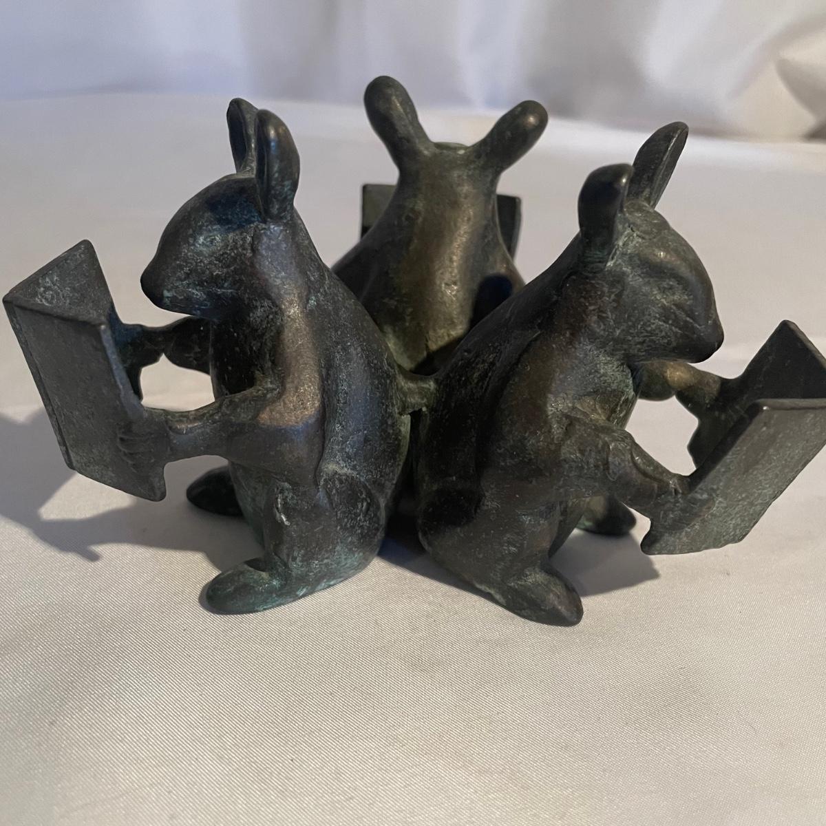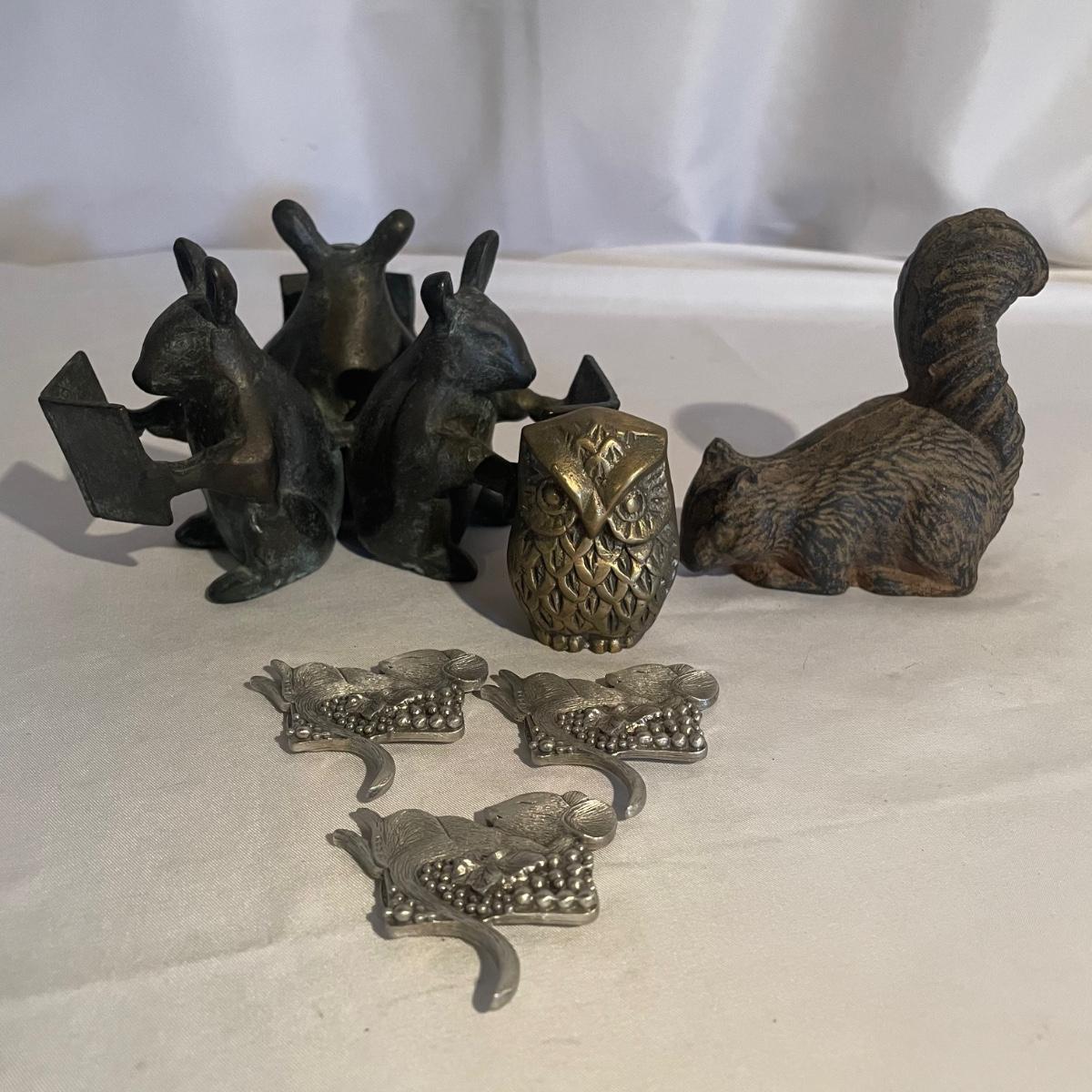 The owl is solid brass and statue of three mice reading is a heavy metal, possibly bronze. The three mice plaques appear to be pewter but no marks were found, they measure 2.5” x 2.5”. The squirrel is a cast metal.