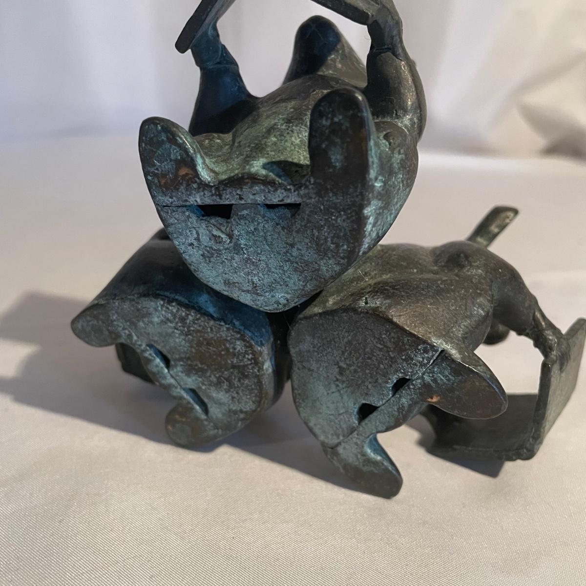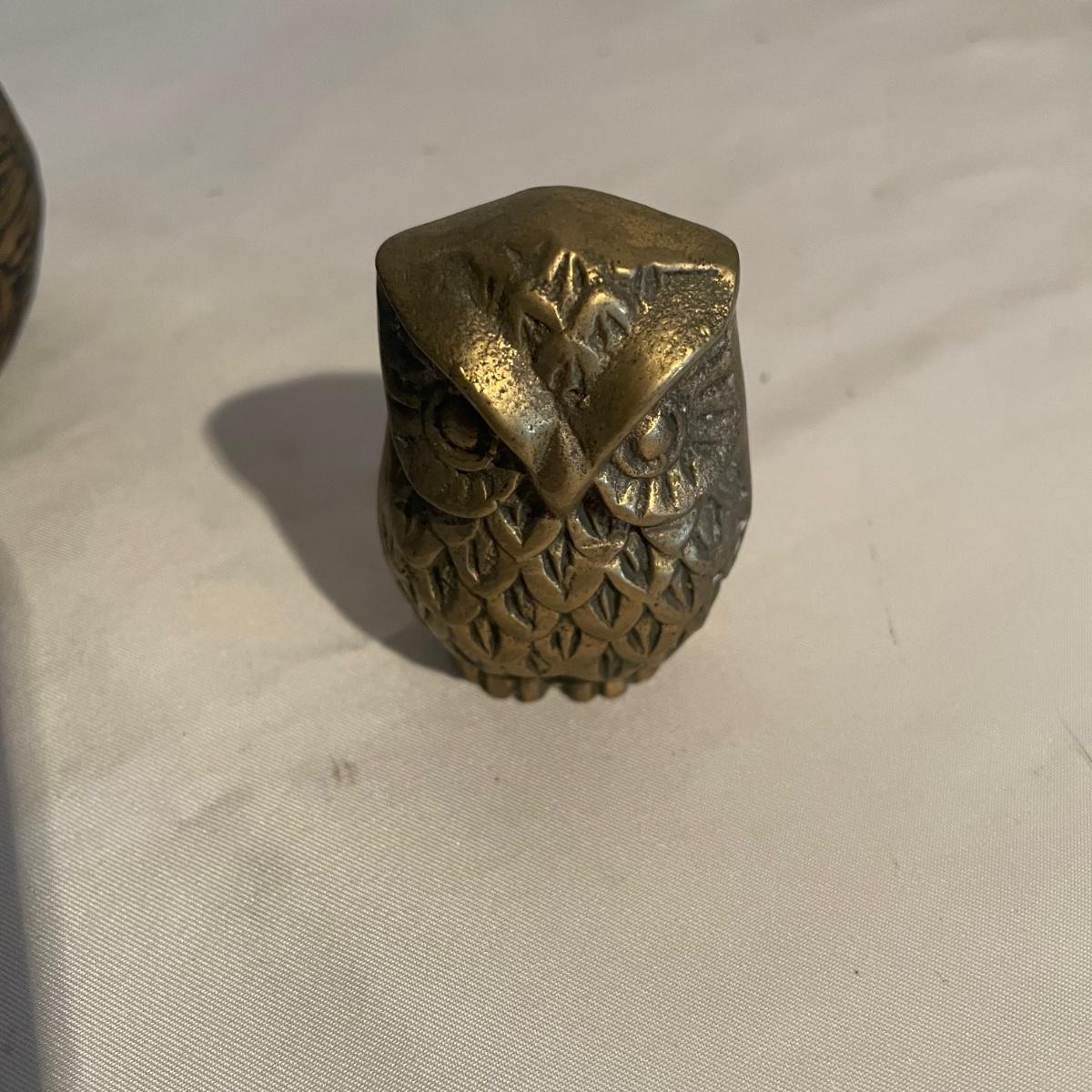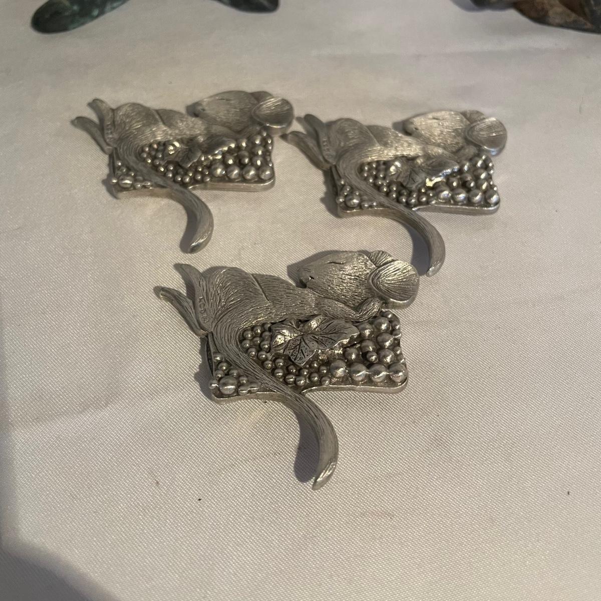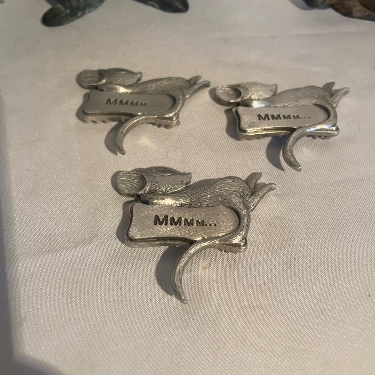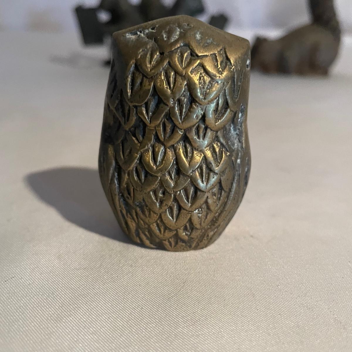 The owl is solid brass and statue of three mice reading is a heavy metal, possibly bronze. The three mice plaques appear to be pewter but no marks were found, they measure 2.5” x 2.5”. The squirrel is a cast metal.