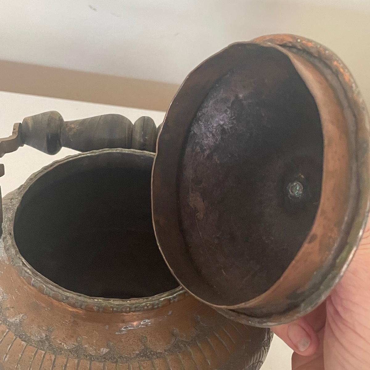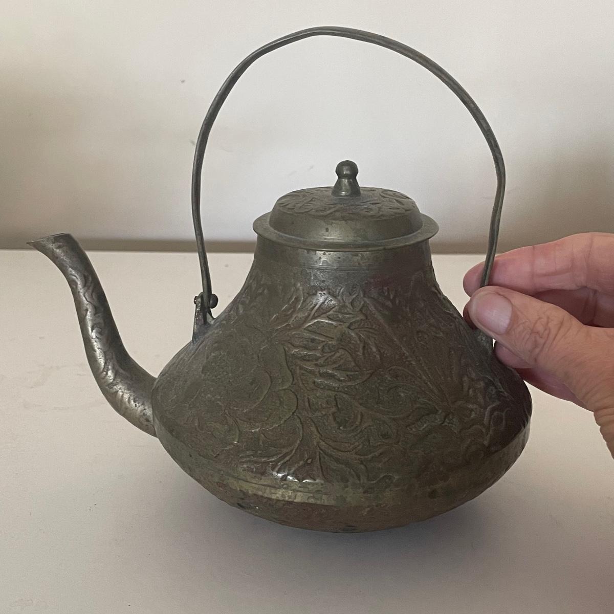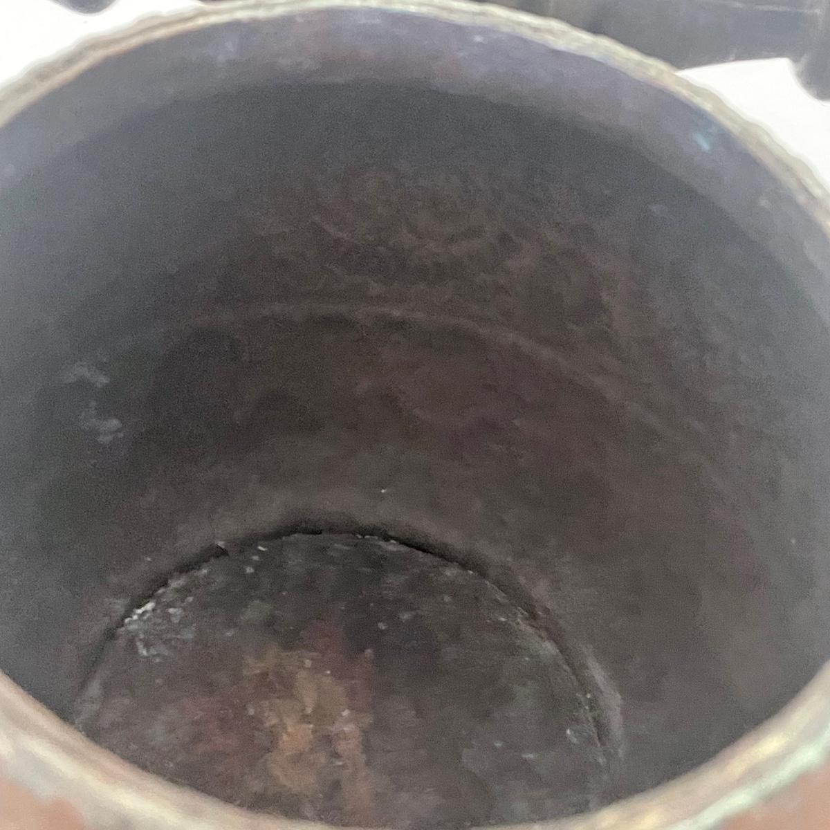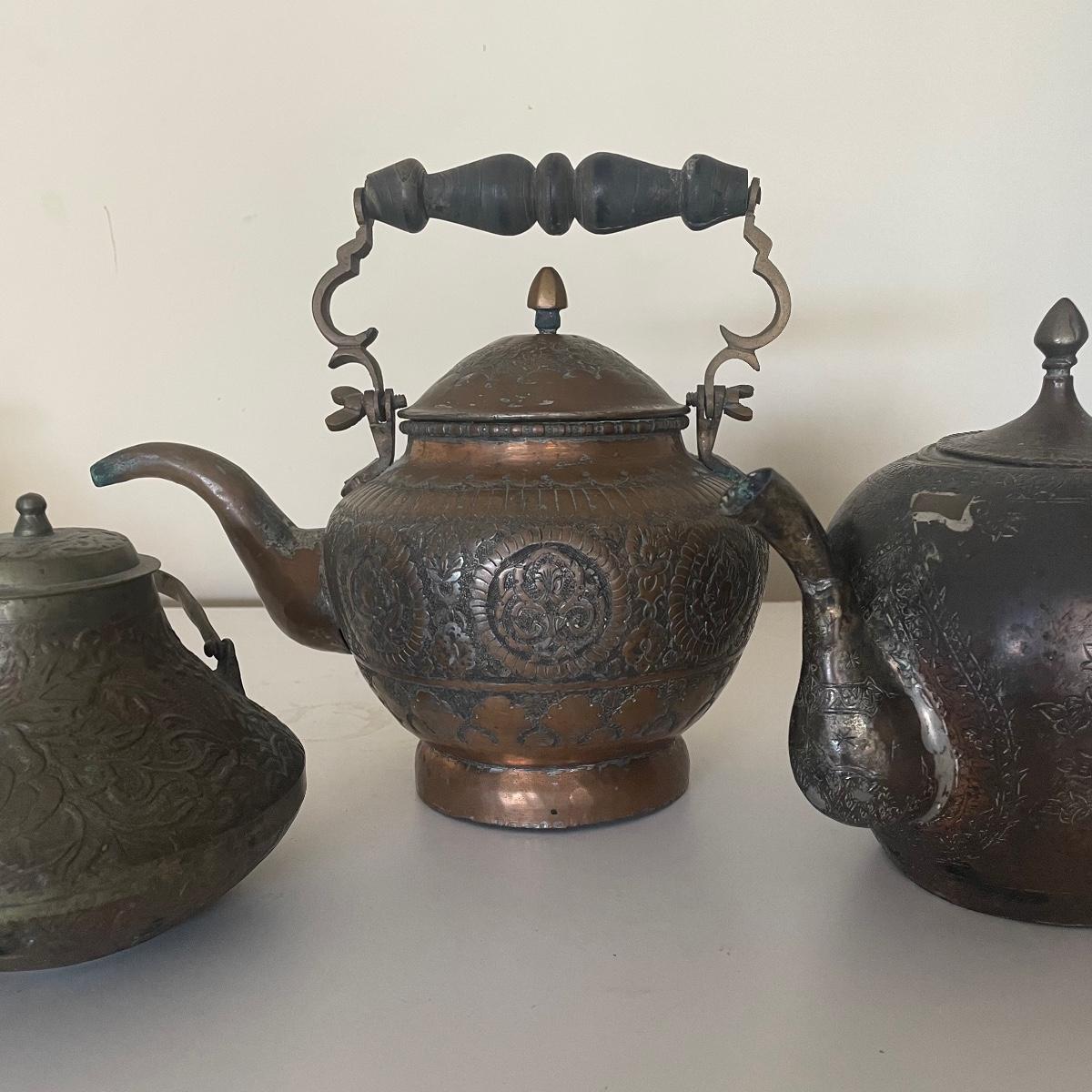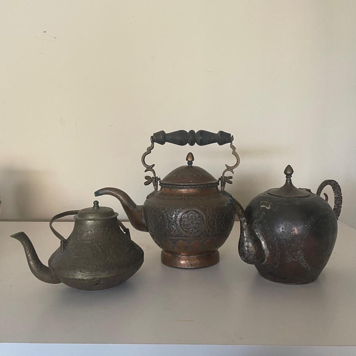The larger of these three metal kettles is copper, smallest is brass and the third one appears to be silver plate that has a strong patina and measures 3” d base x 8” tall.