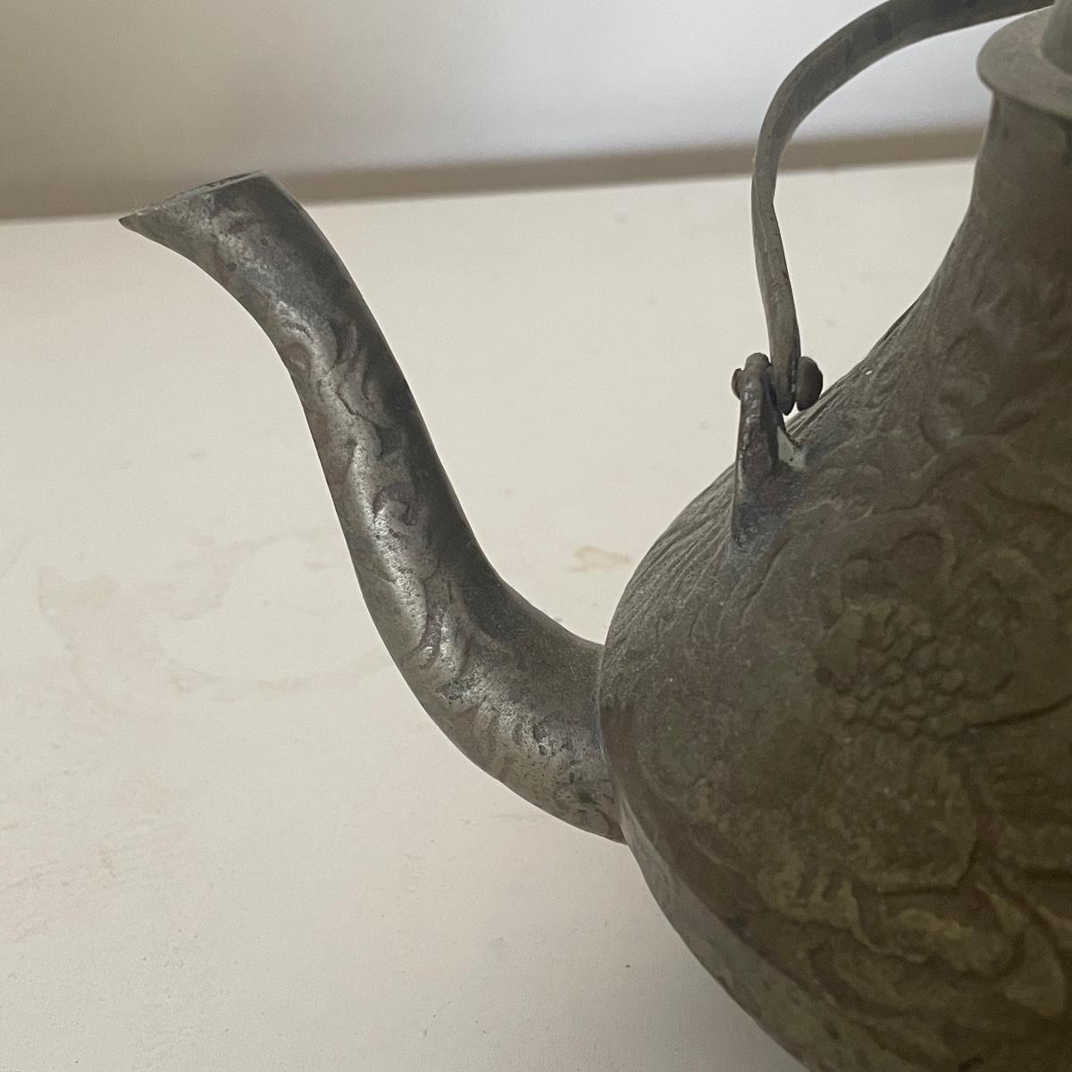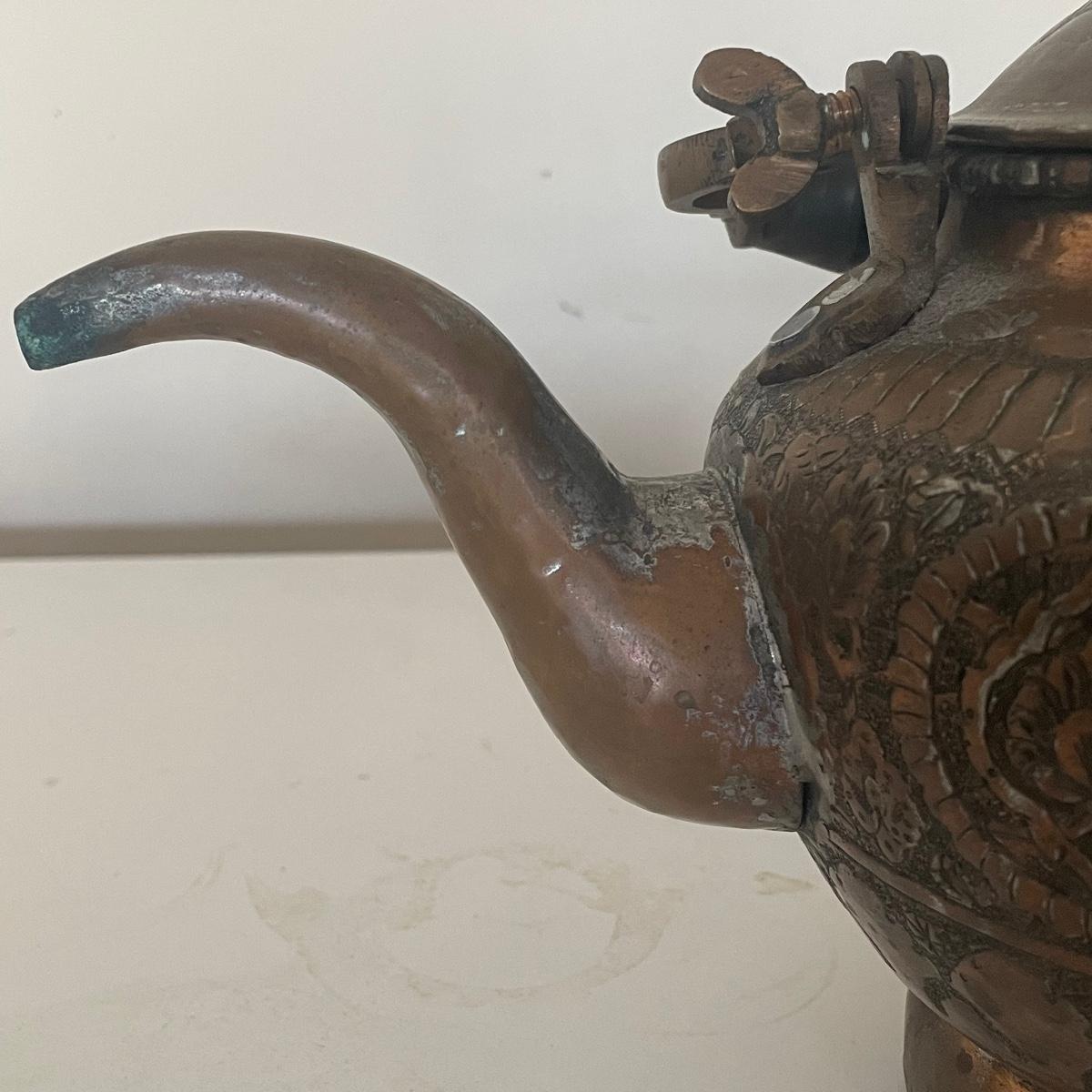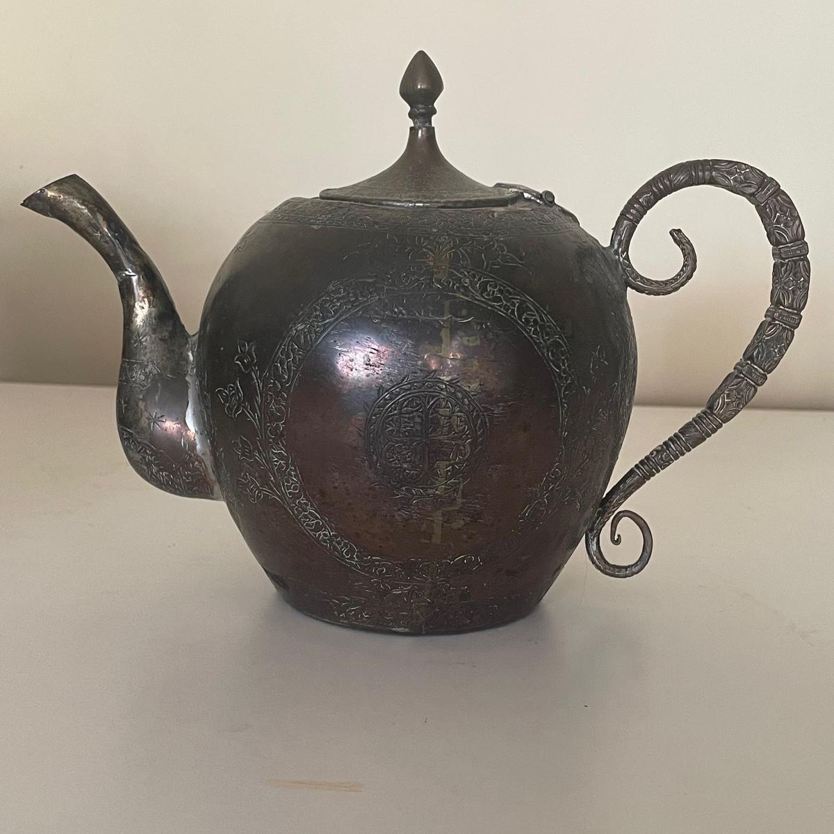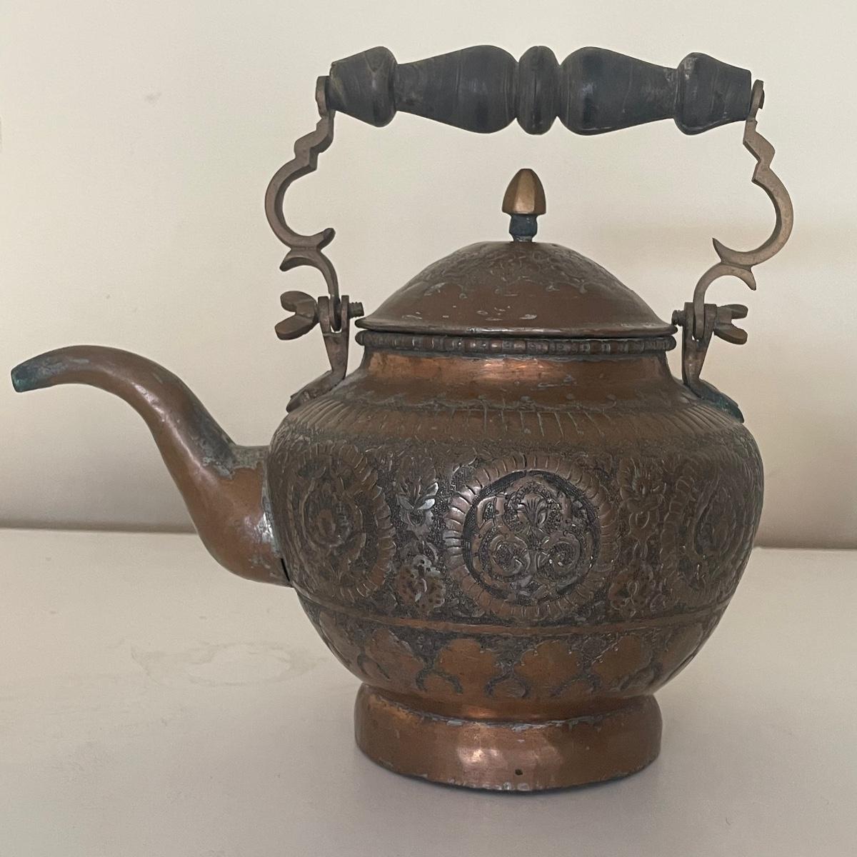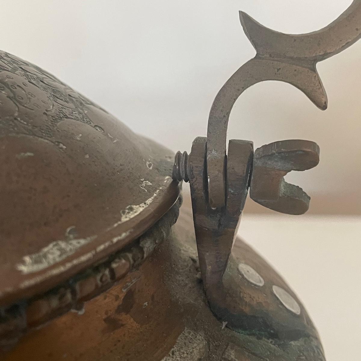 The larger of these three metal kettles is copper, smallest is brass and the third one appears to be silver plate that has a strong patina and measures 3” d base x 8” tall.