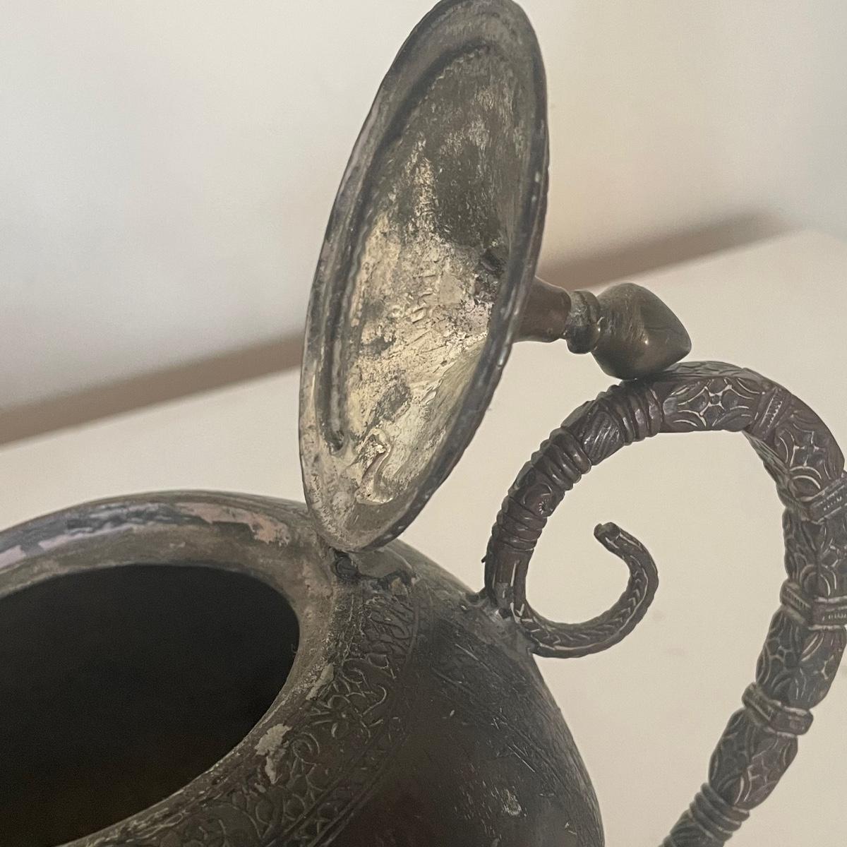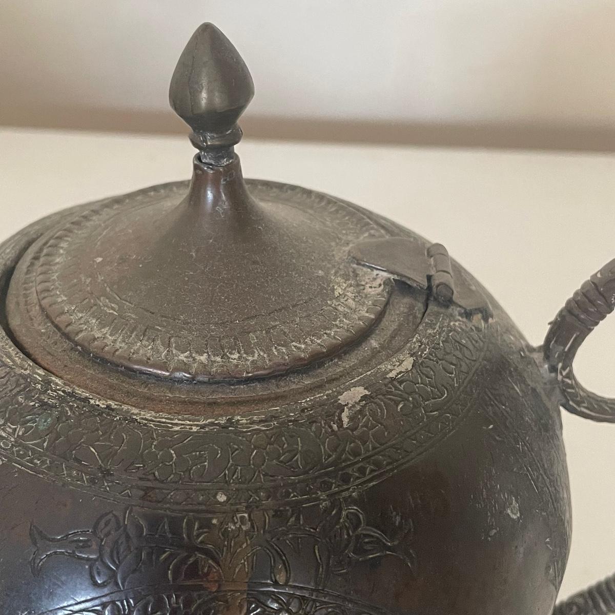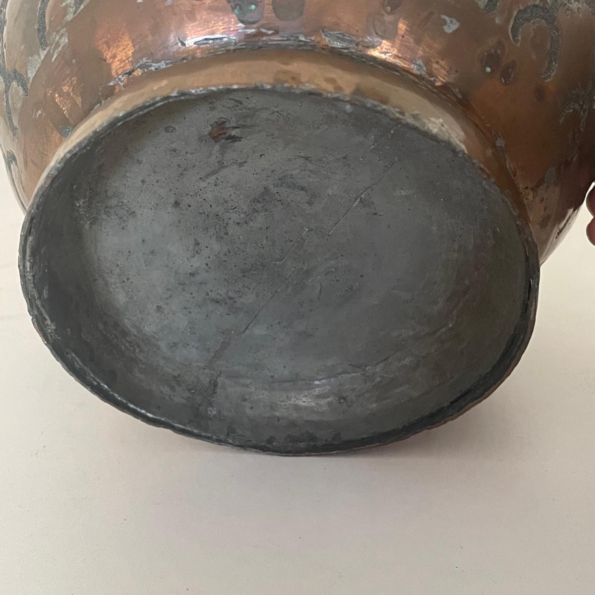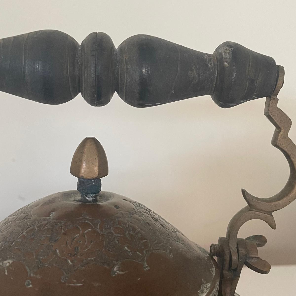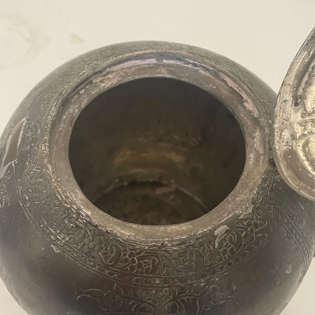 The larger of these three metal kettles is copper, smallest is brass and the third one appears to be silver plate that has a strong patina and measures 3” d base x 8” tall.