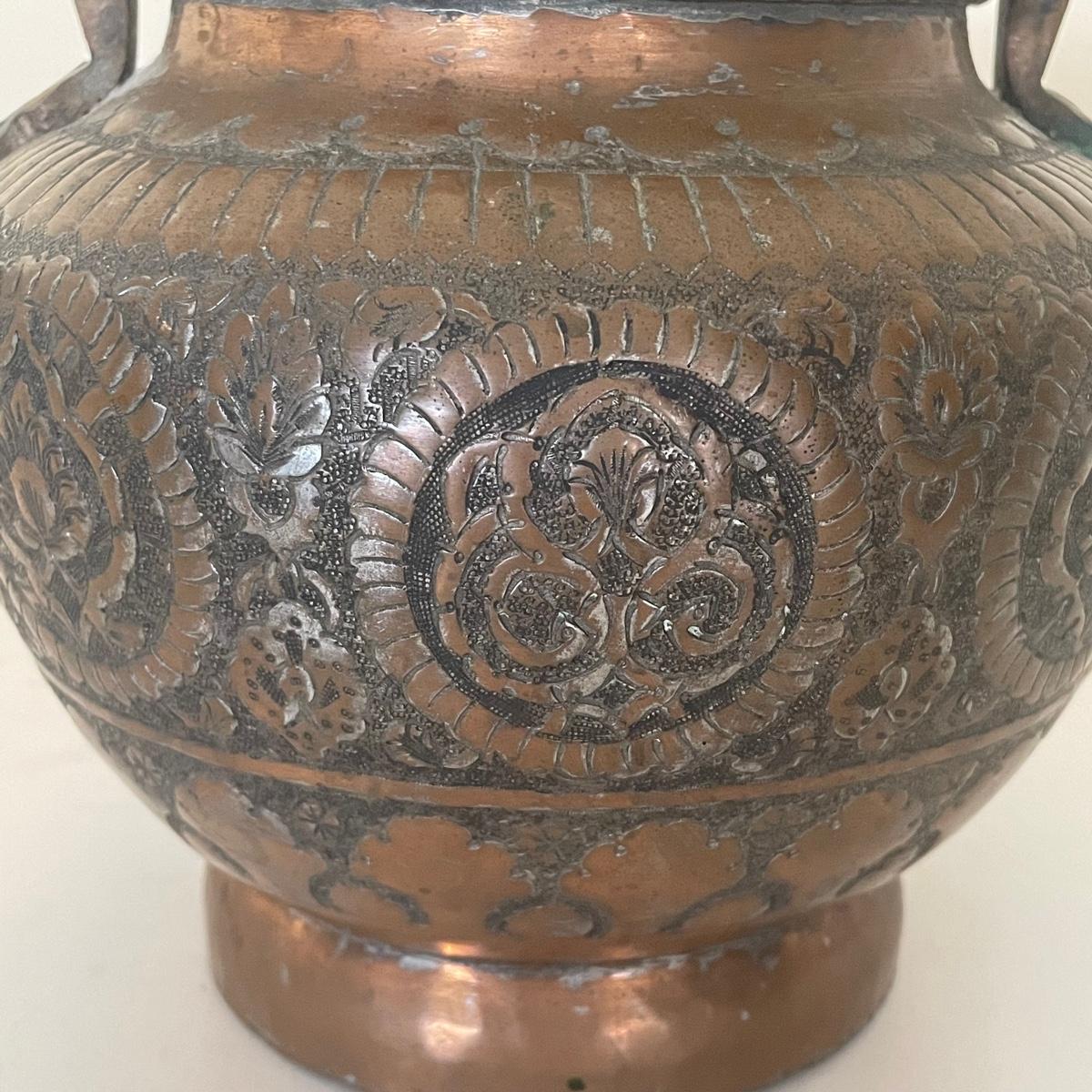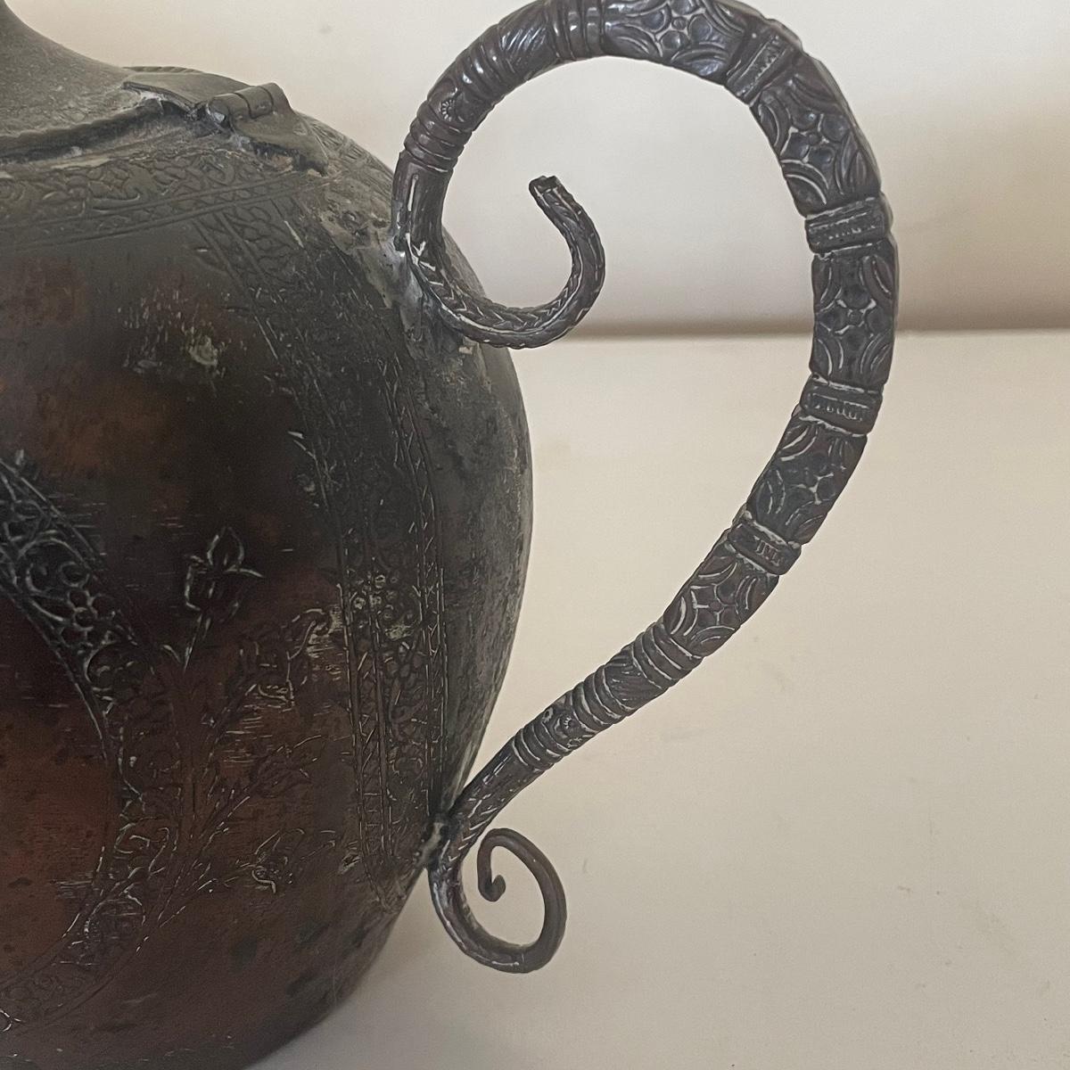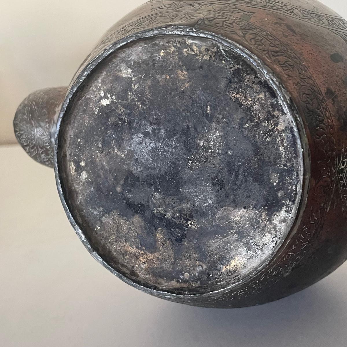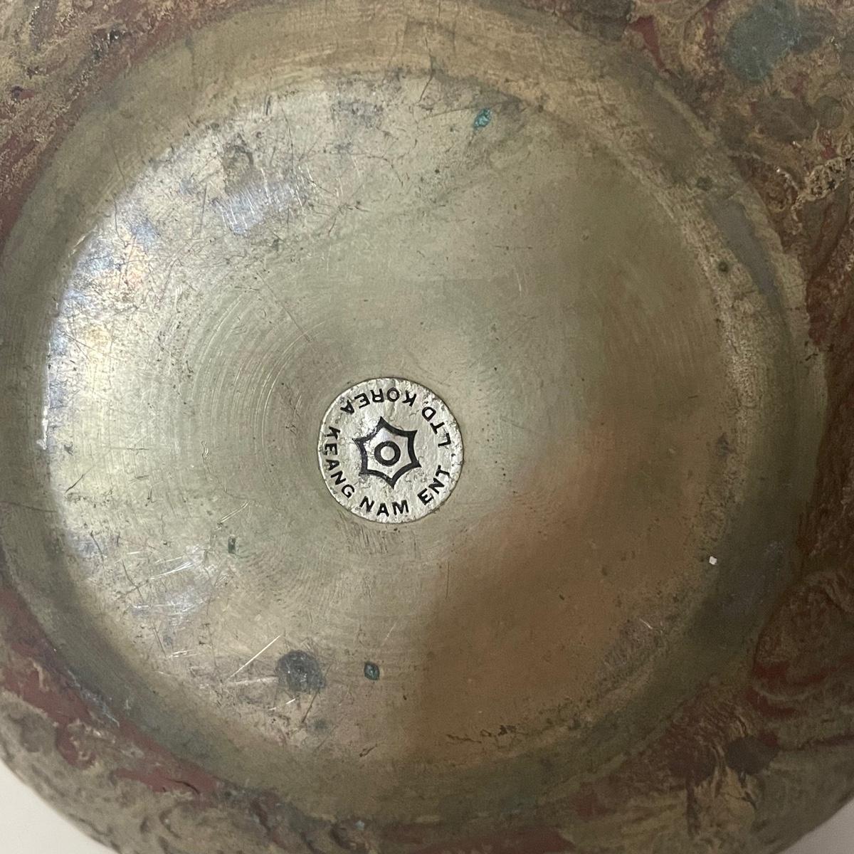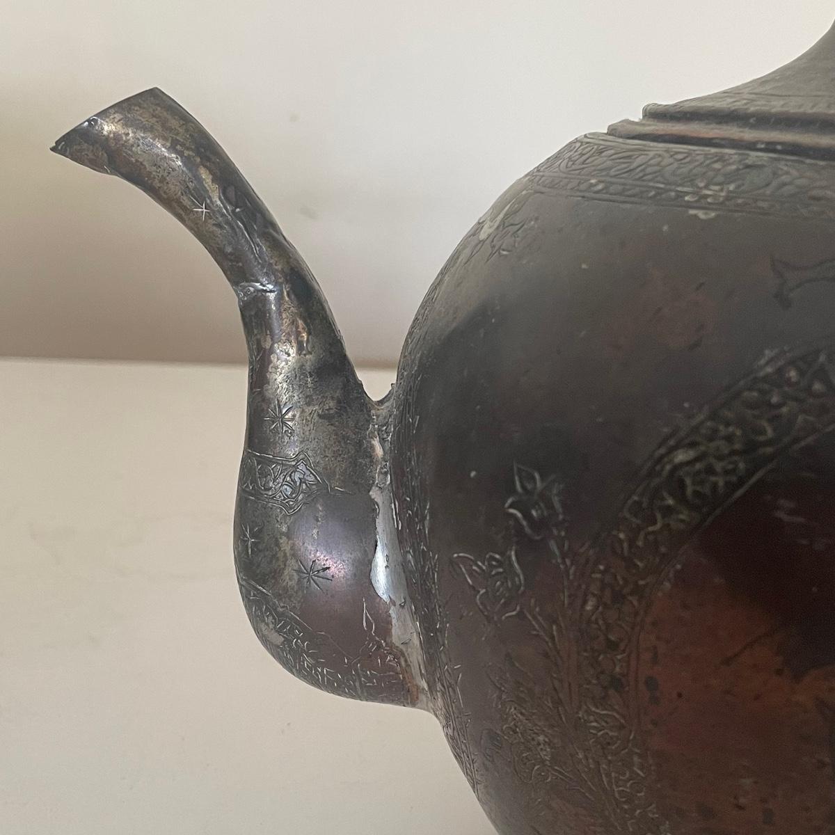 The larger of these three metal kettles is copper, smallest is brass and the third one appears to be silver plate that has a strong patina and measures 3” d base x 8” tall.