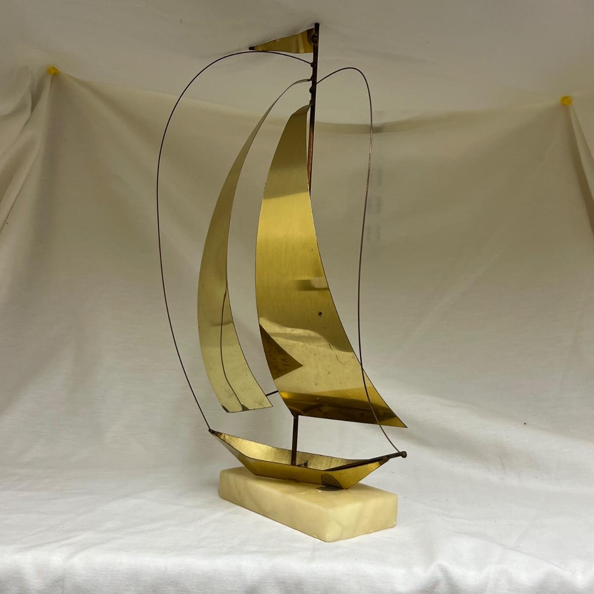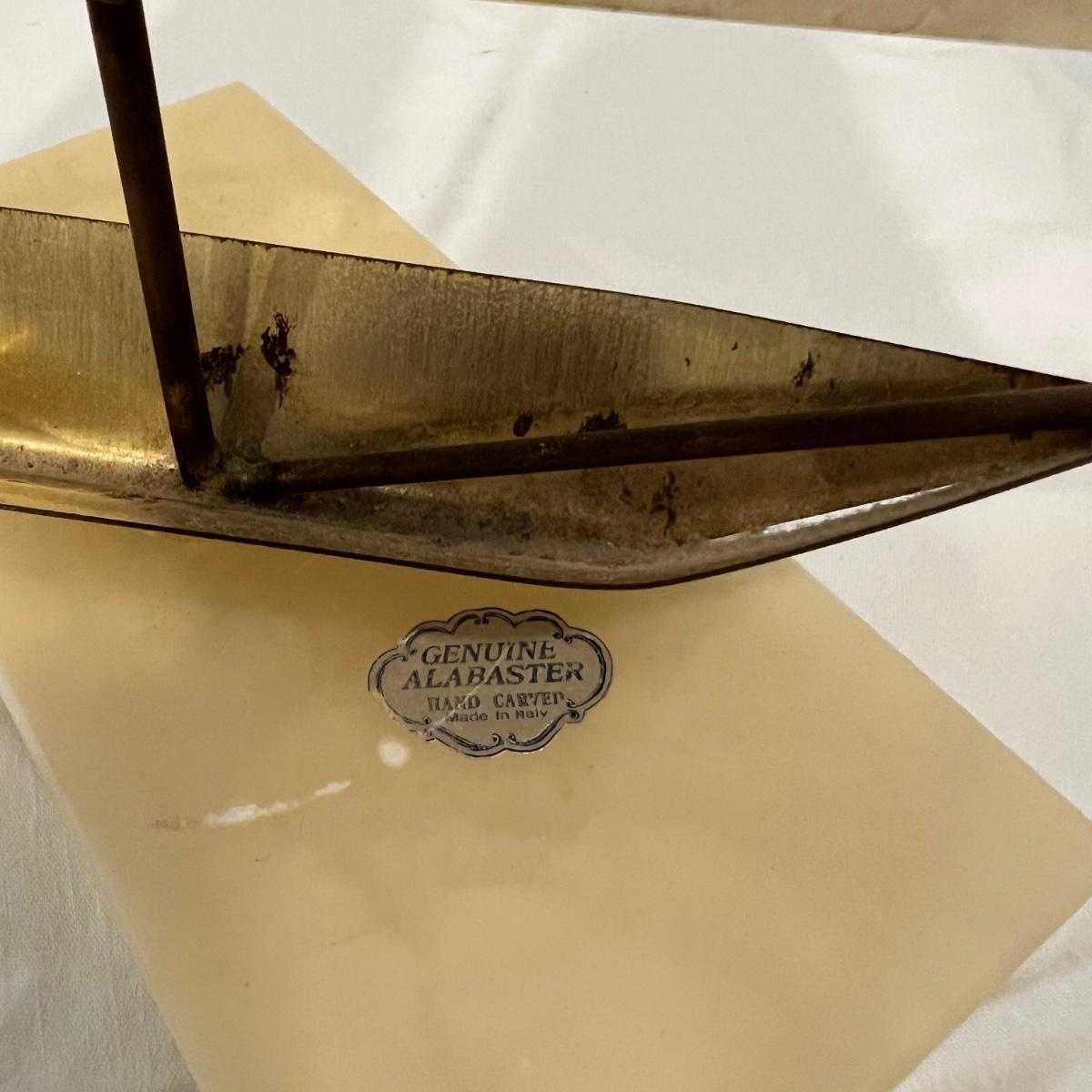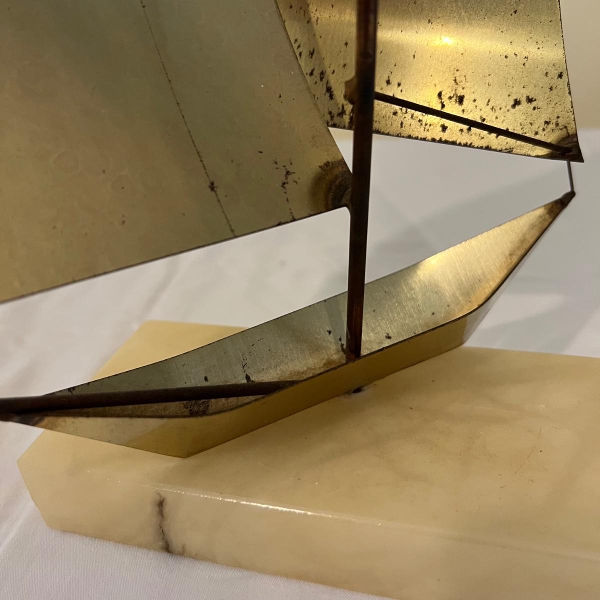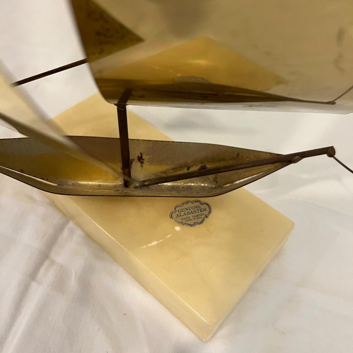 A vintage brass sailboat that is mounted on an alabaster base. There is some minor tarnished spots, see images.