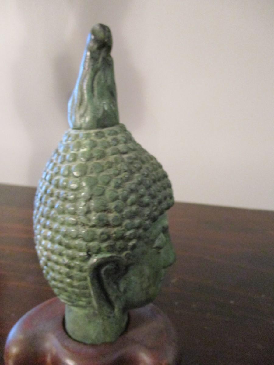 Thai Bronze Buddha Head On Wood Base
