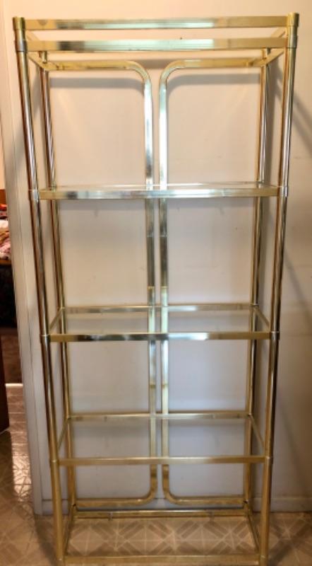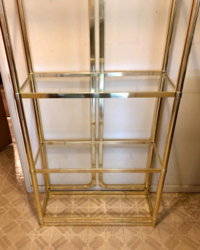 Polished brass shelf unit with 3 glass shelves. Approx 72" tall.