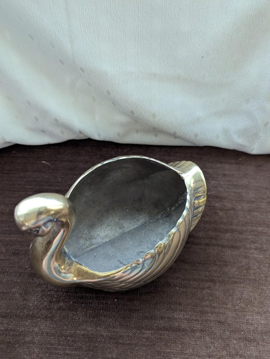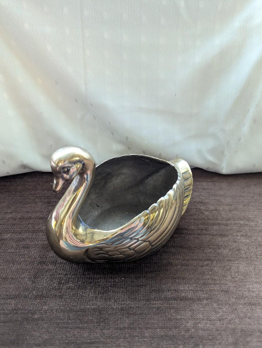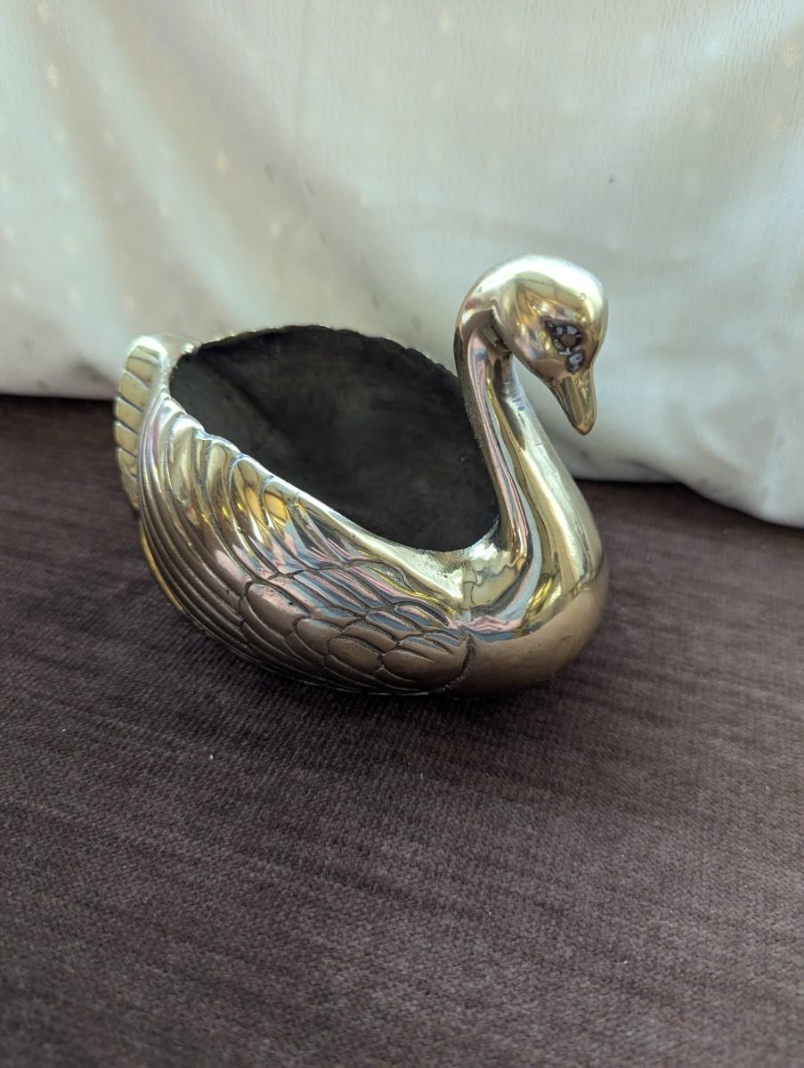 Nice brass swan shaped planter. Long curved neck and feather texture all around. Perfect for plants or for holding small towels in a powder room. Unmarked.