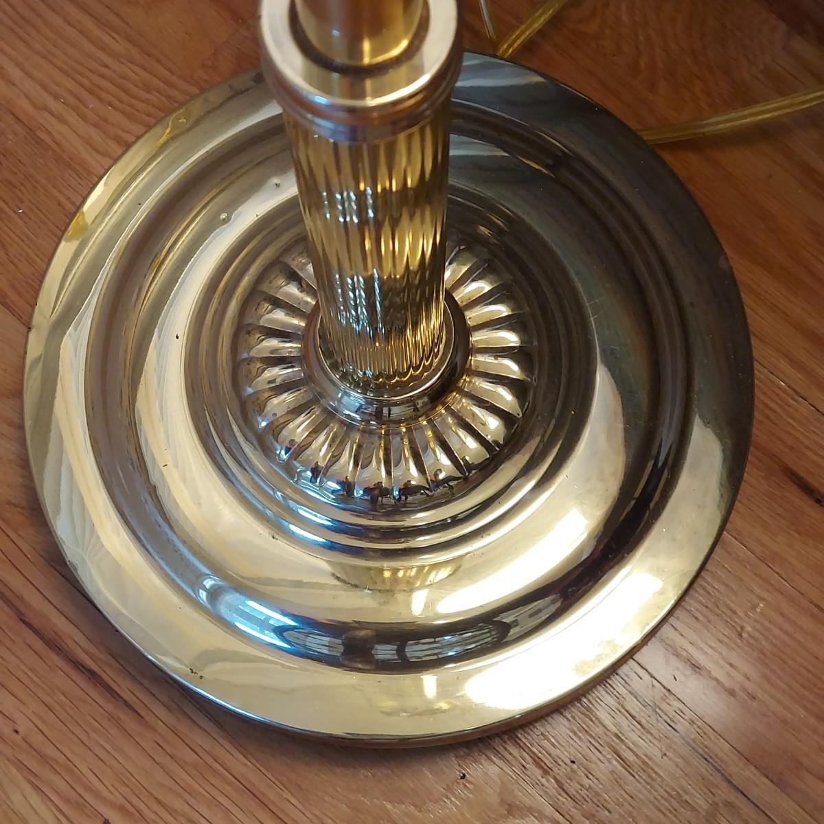 A bright polished brass-like floor lamp with a swing arm socket, three-way switch and cloth shade. The base is about 10”D and it’s 58” to the top of the metal hoop finial. Lamp shows only mild wear. See images. Local pick up only.