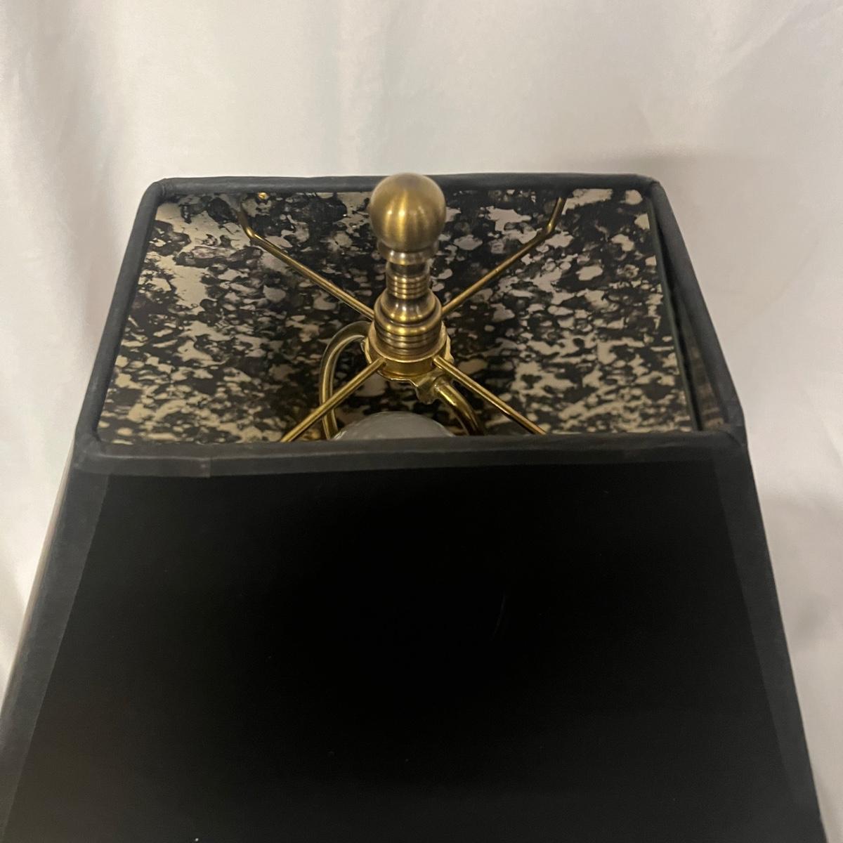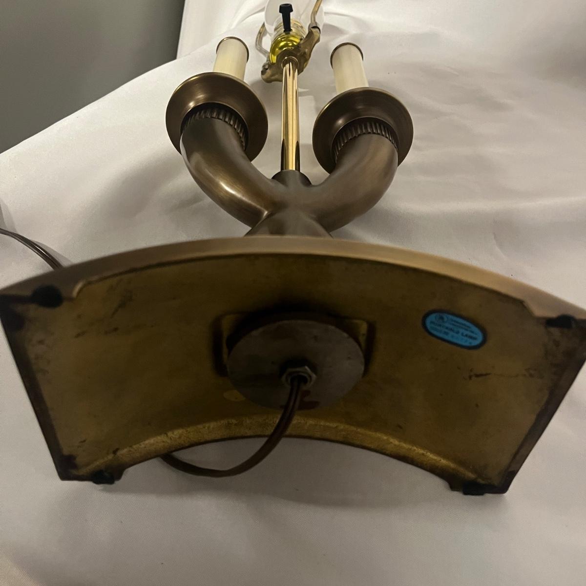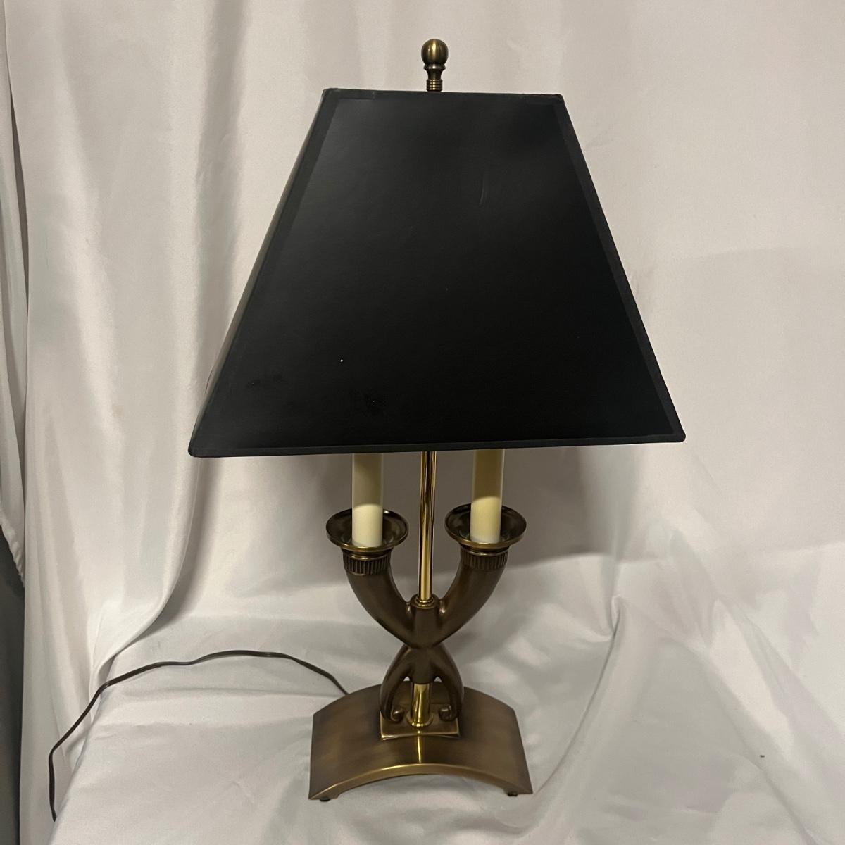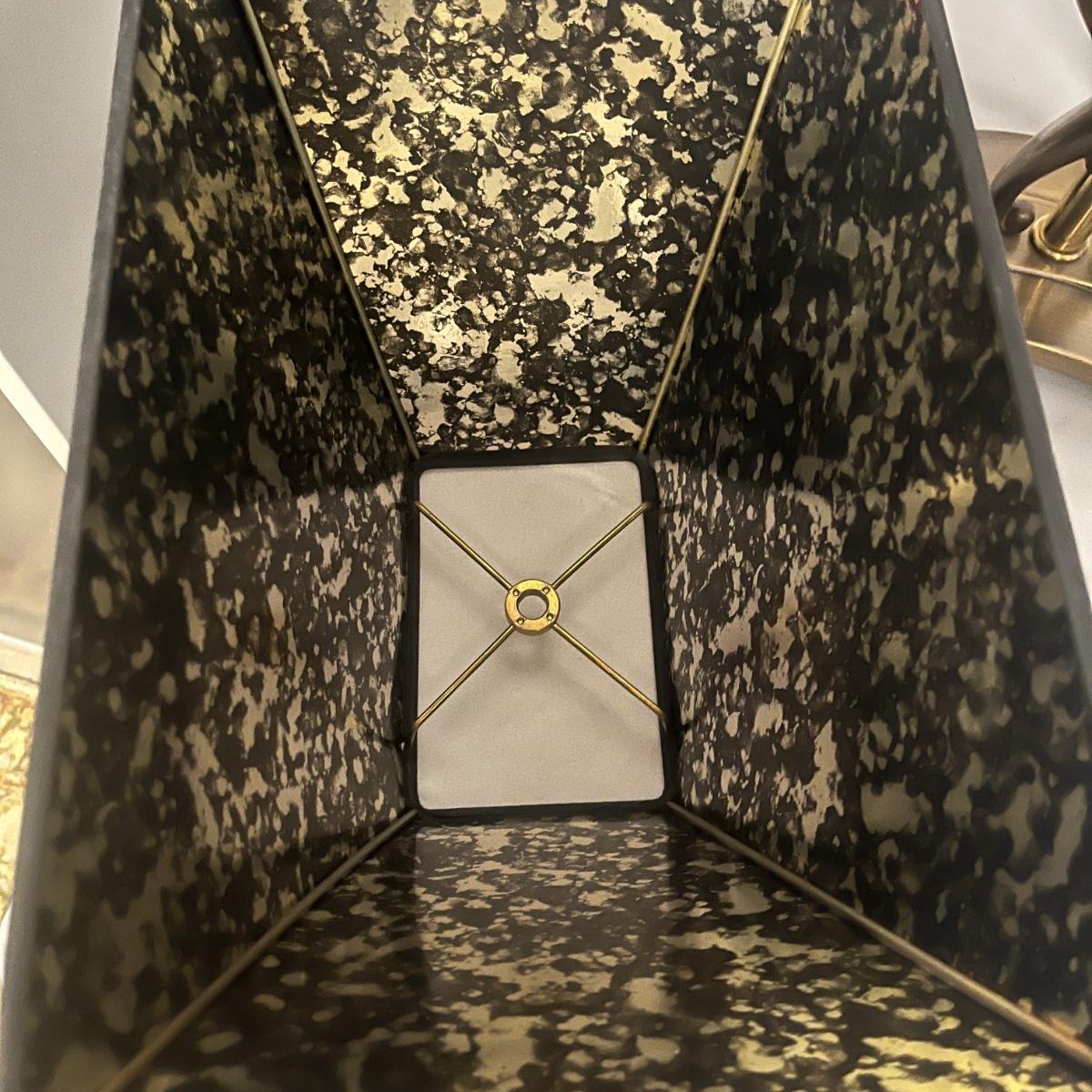 This lamp is brass colored metal with a brushed look. It has an on off switch. Lamp measures 4.5” x 8” x 23”H without shade. Lamp powered on when plugged in. It has a black shade with a metallic, possibly anti-glare interior. Shade in some pictures looks faded, but it is just the reflection.
