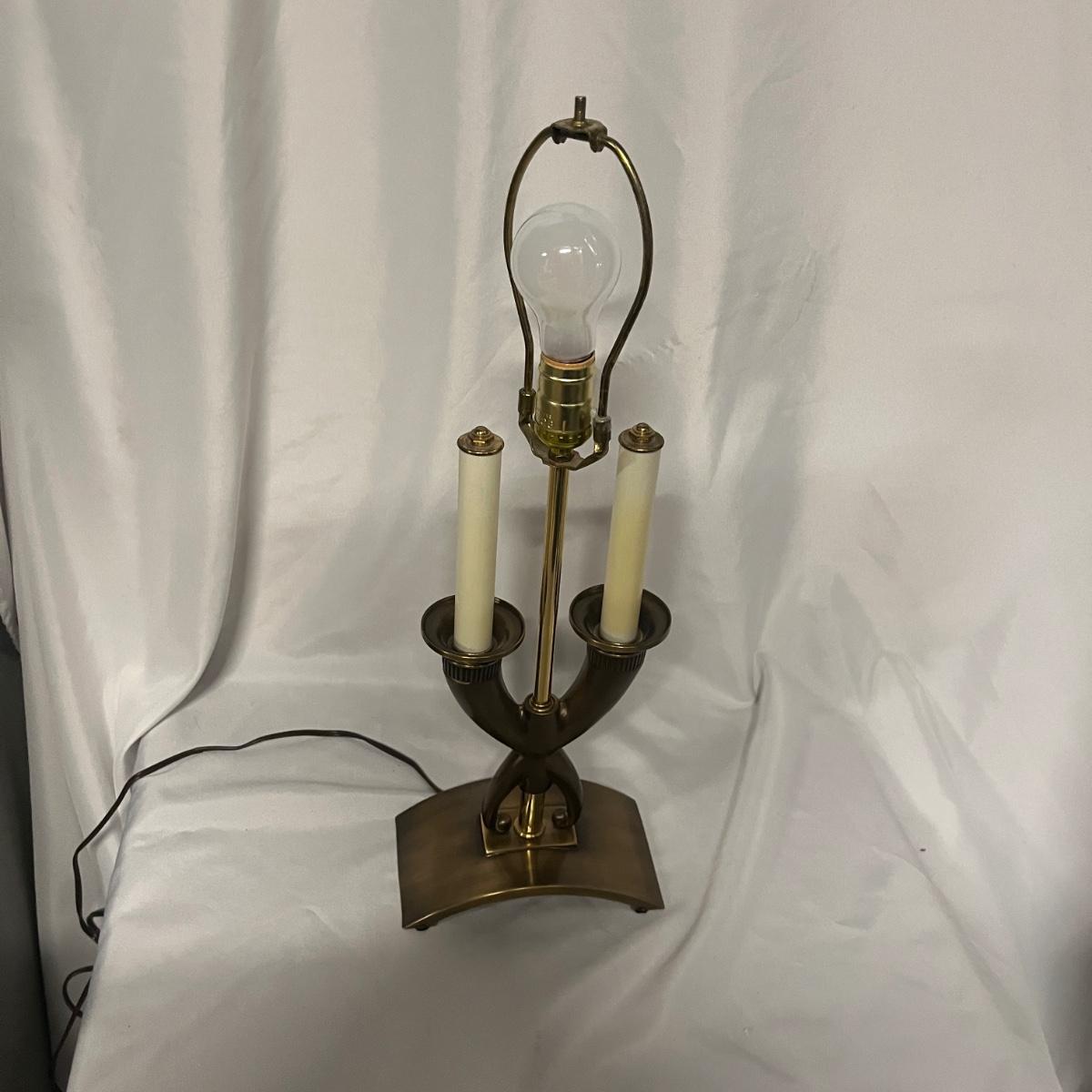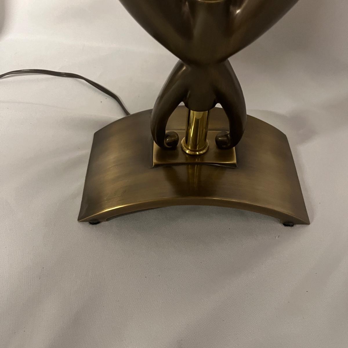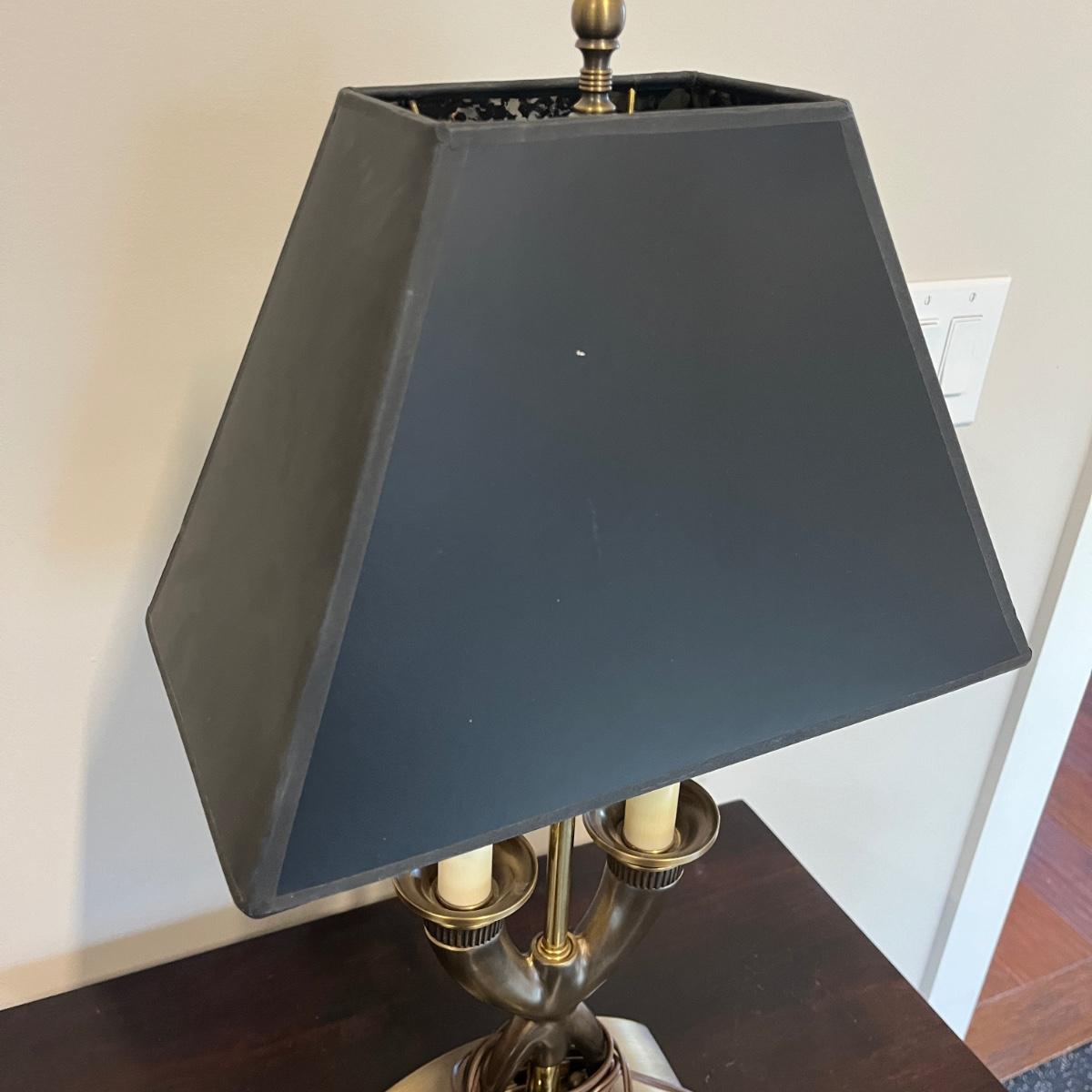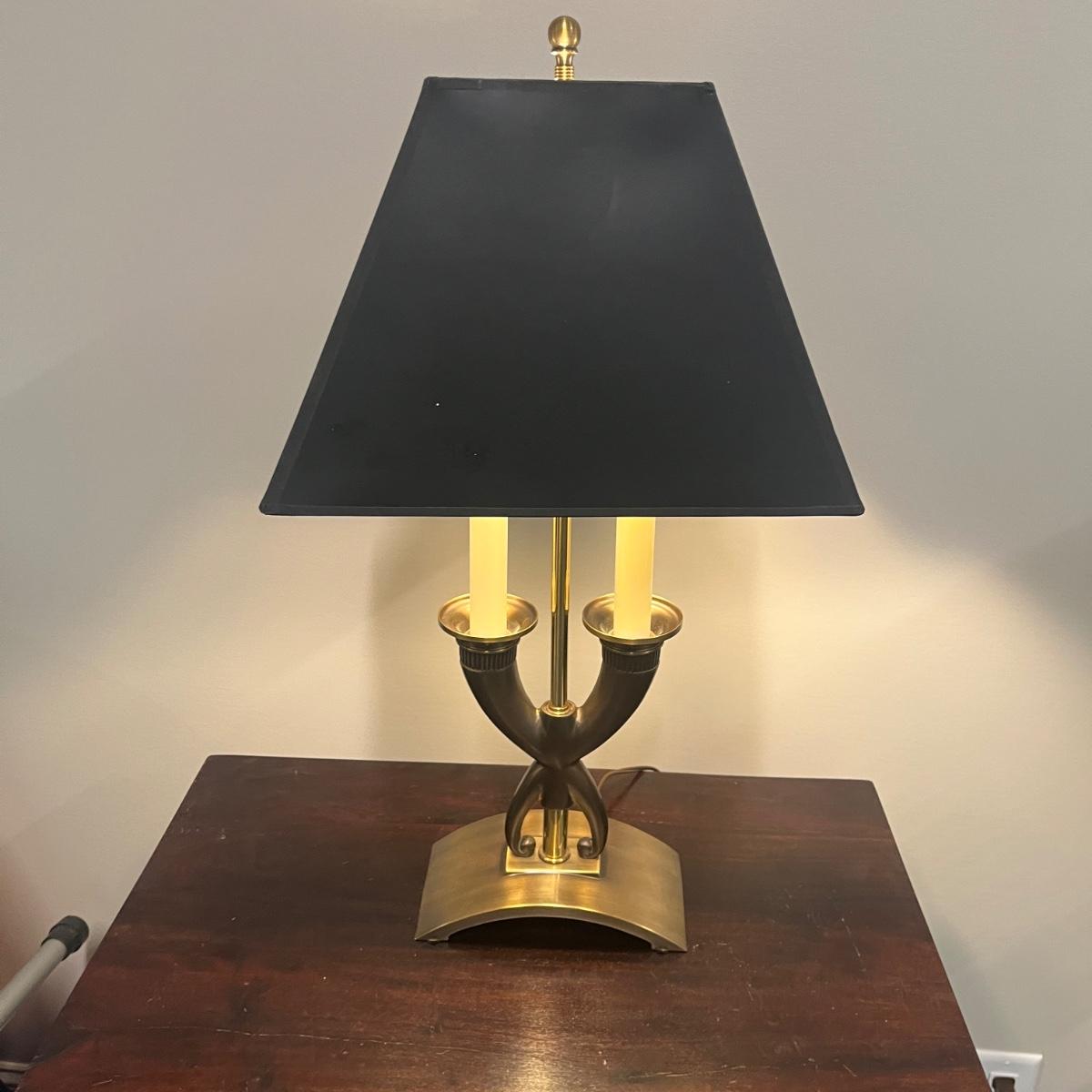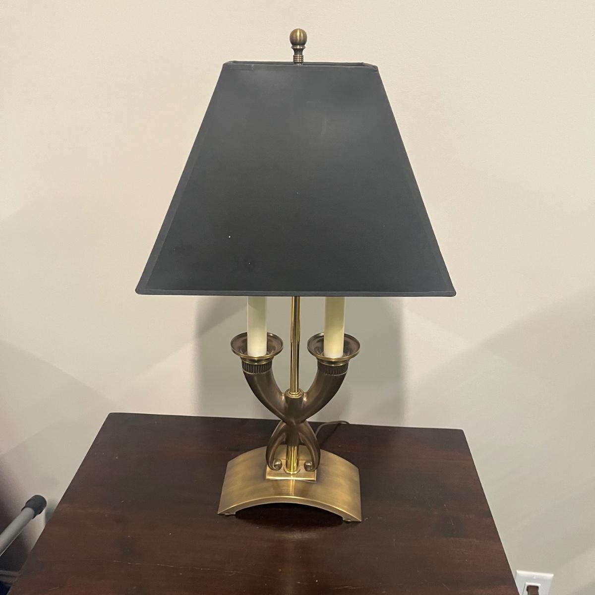 This lamp is brass colored metal with a brushed look. It has an on off switch. Lamp measures 4.5” x 8” x 23”H without shade. Lamp powered on when plugged in. It has a black shade with a metallic, possibly anti-glare interior. Shade in some pictures looks faded, but it is just the reflection.