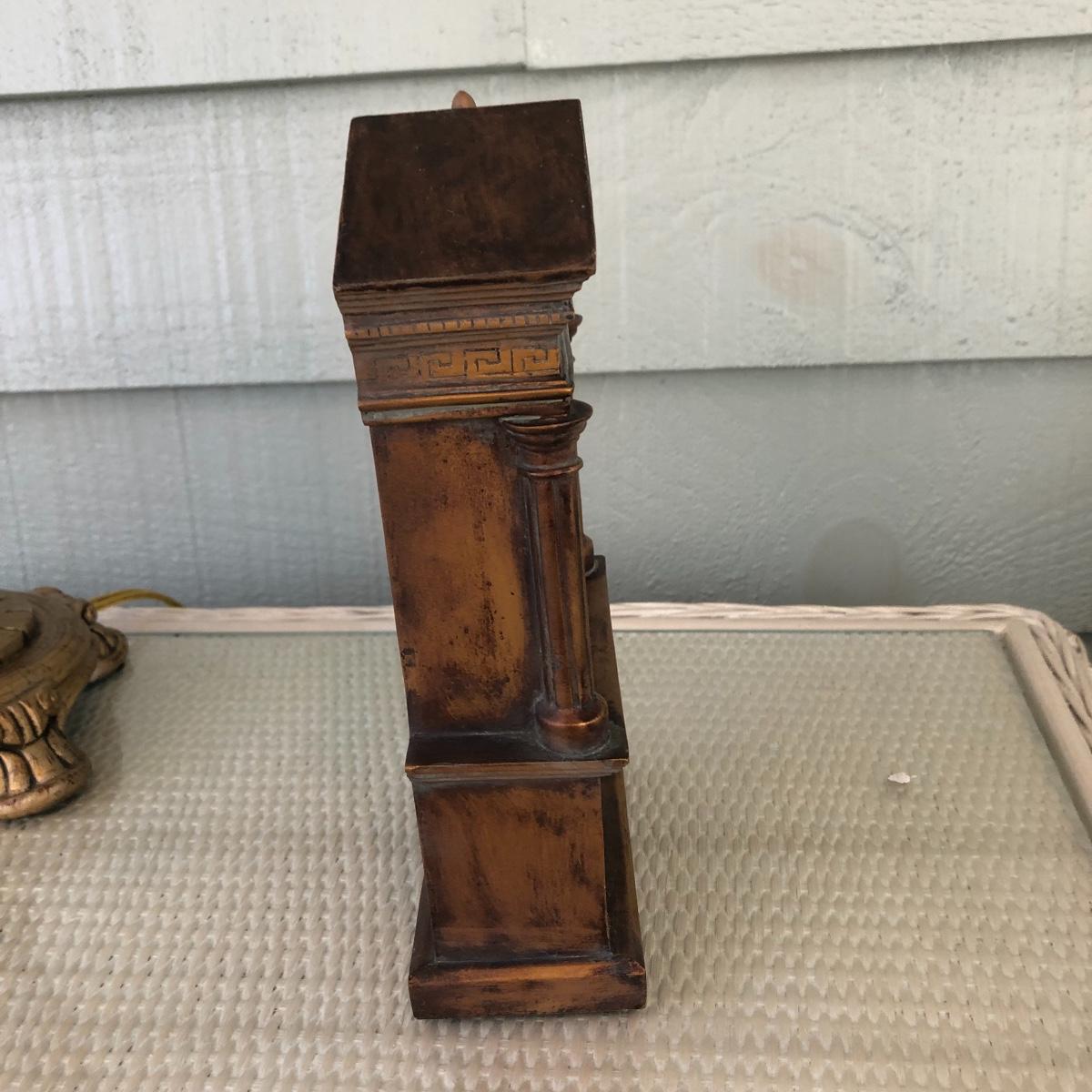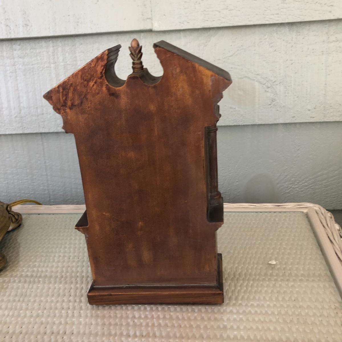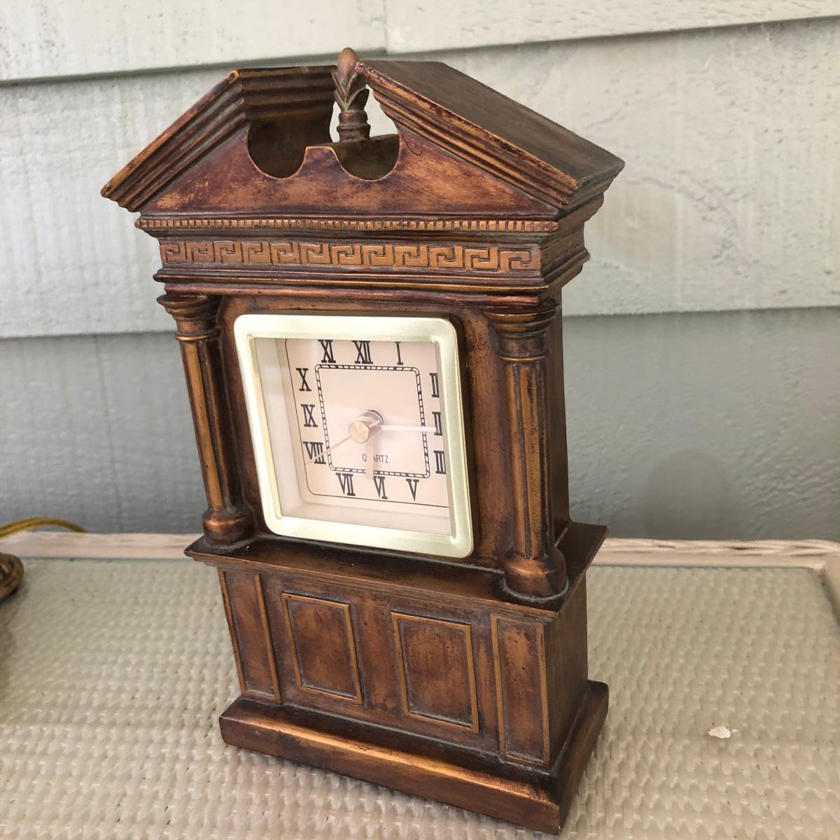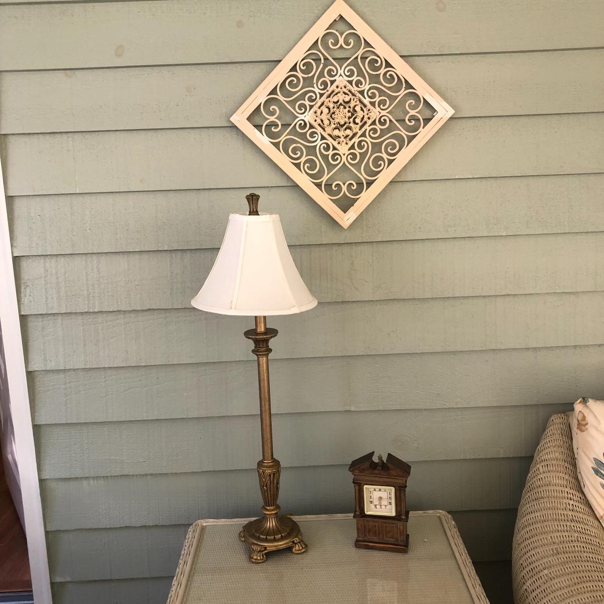This lot includes a white metal wall plaque, a table Quartz clock and a brass colored table lamp. The metal wall plaque measures 15.5” x 15.5”. The bronze colored table clock is made of a dense material - similar to painted stone. It is battery operated and needs a new battery. It measures 5.5” x 2.5” x 8.5”. The lamp is about 33” tall and worked when tested. The wall plaque could use a fresh coat of paint. Local pick up only.