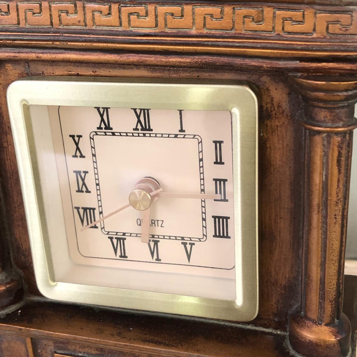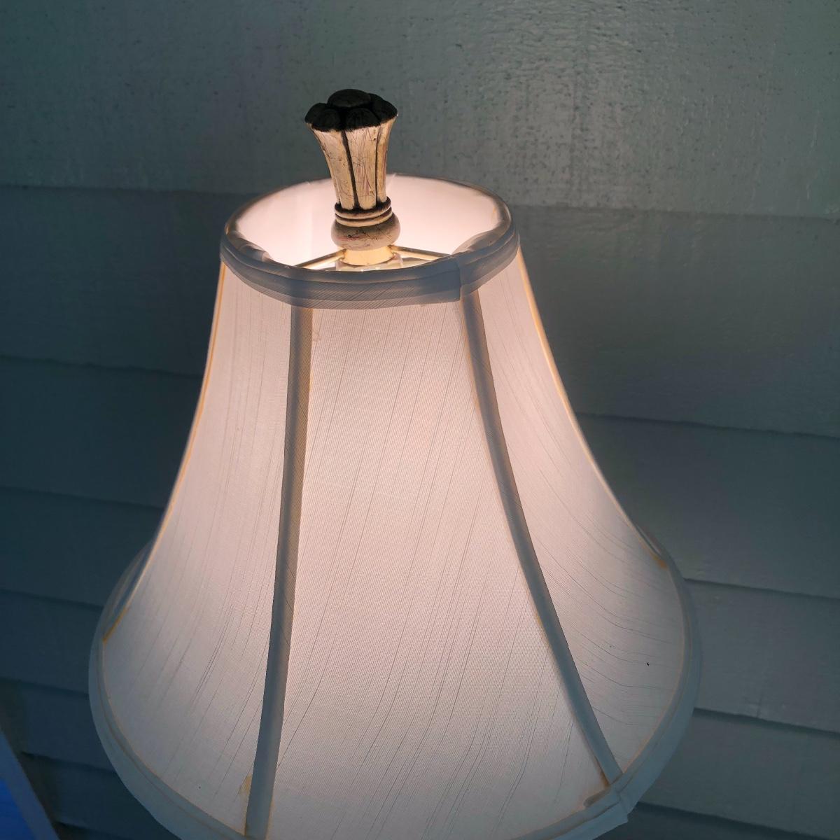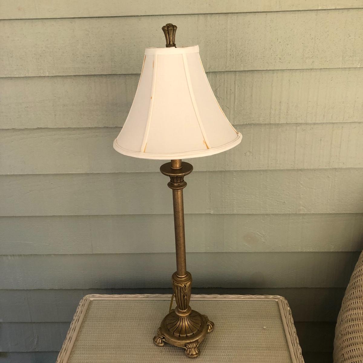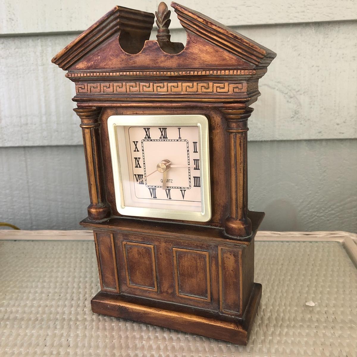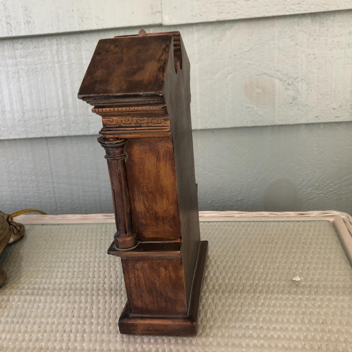 This lot includes a white metal wall plaque, a table Quartz clock and a brass colored table lamp. The metal wall plaque measures 15.5” x 15.5”. The bronze colored table clock is made of a dense material - similar to painted stone. It is battery operated and needs a new battery. It measures 5.5” x 2.5” x 8.5”. The lamp is about 33” tall and worked when tested. The wall plaque could use a fresh coat of paint. Local pick up only.