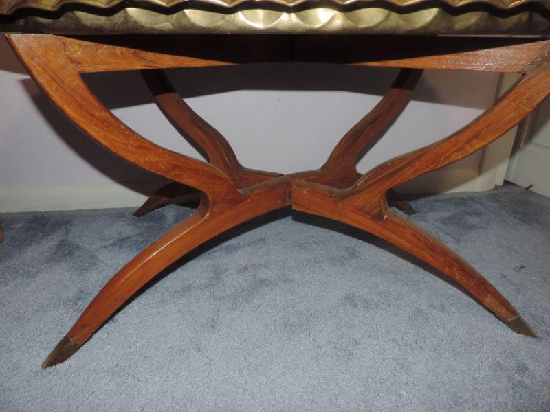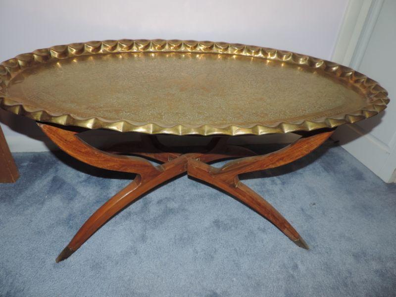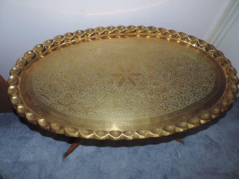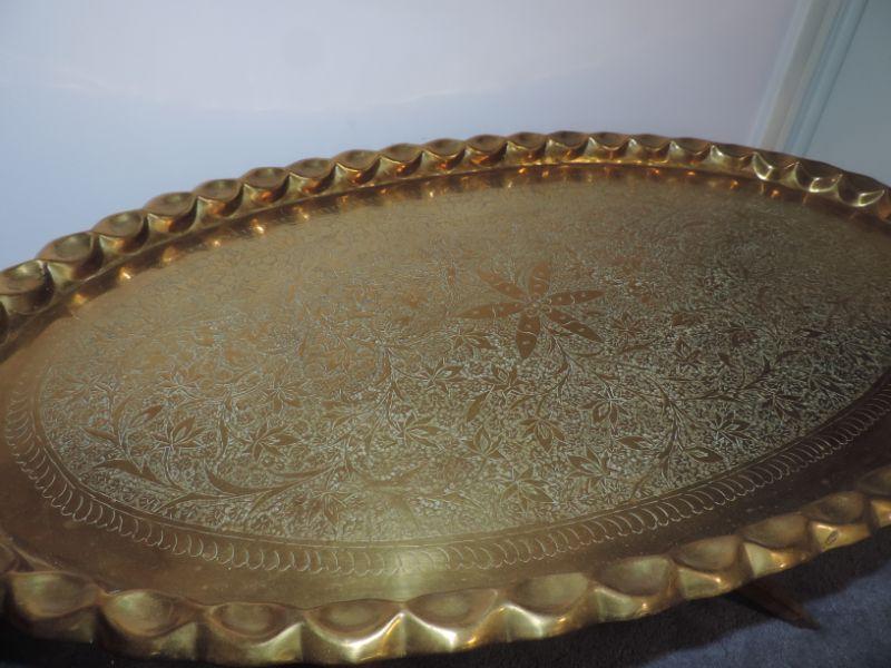 LARGE BRASS TRAY THAT RESTS ON A WOODEN FRAME