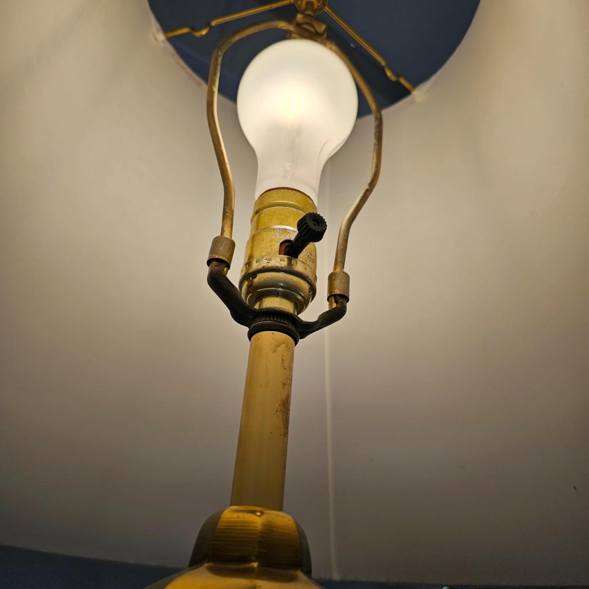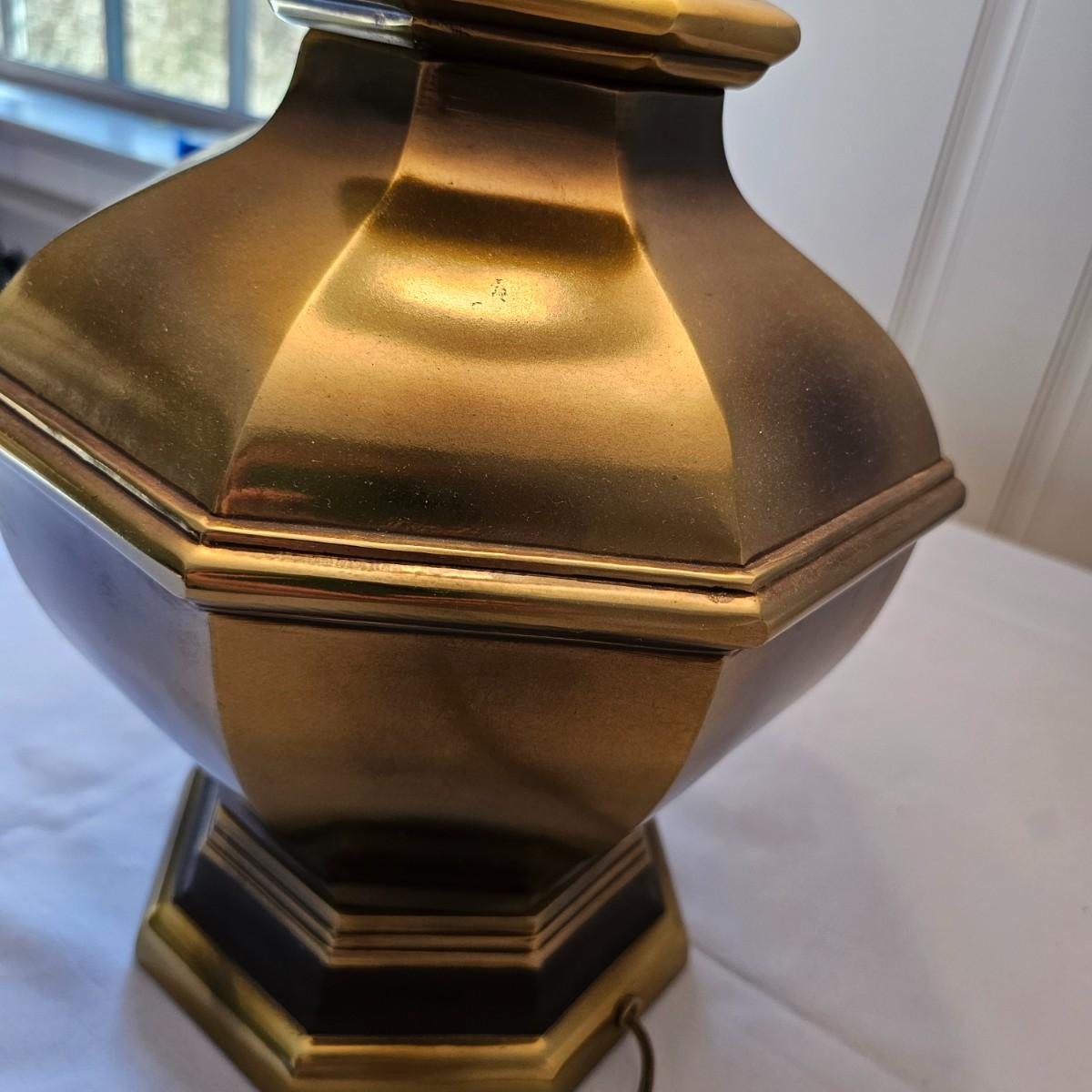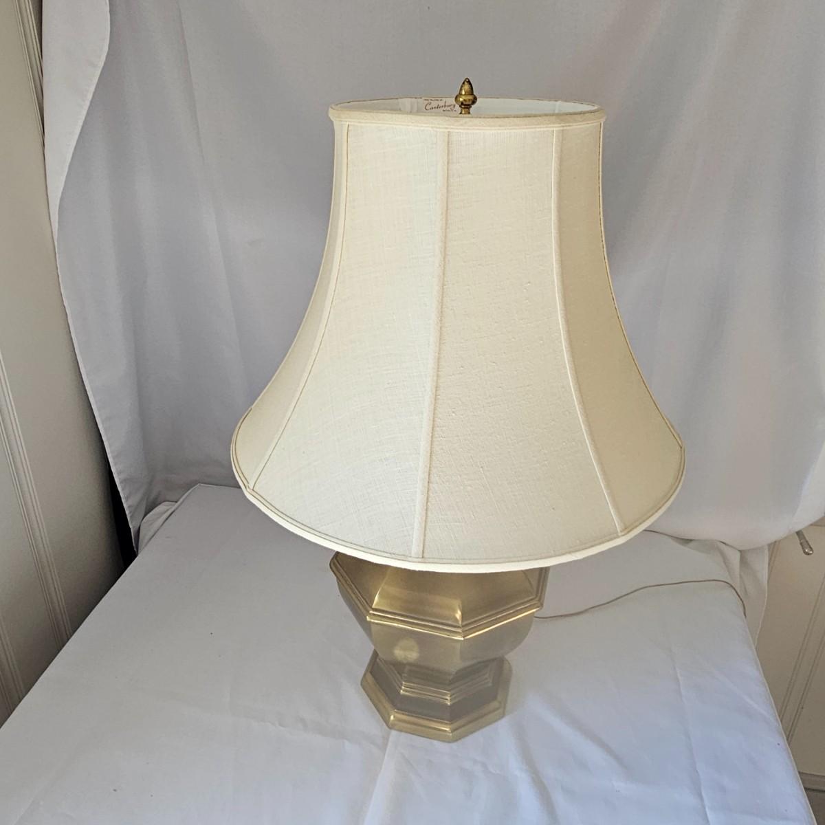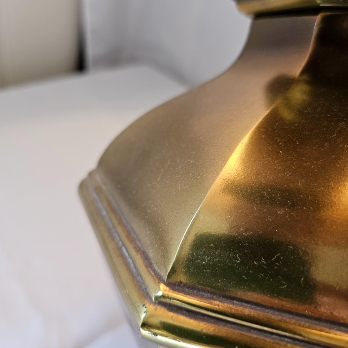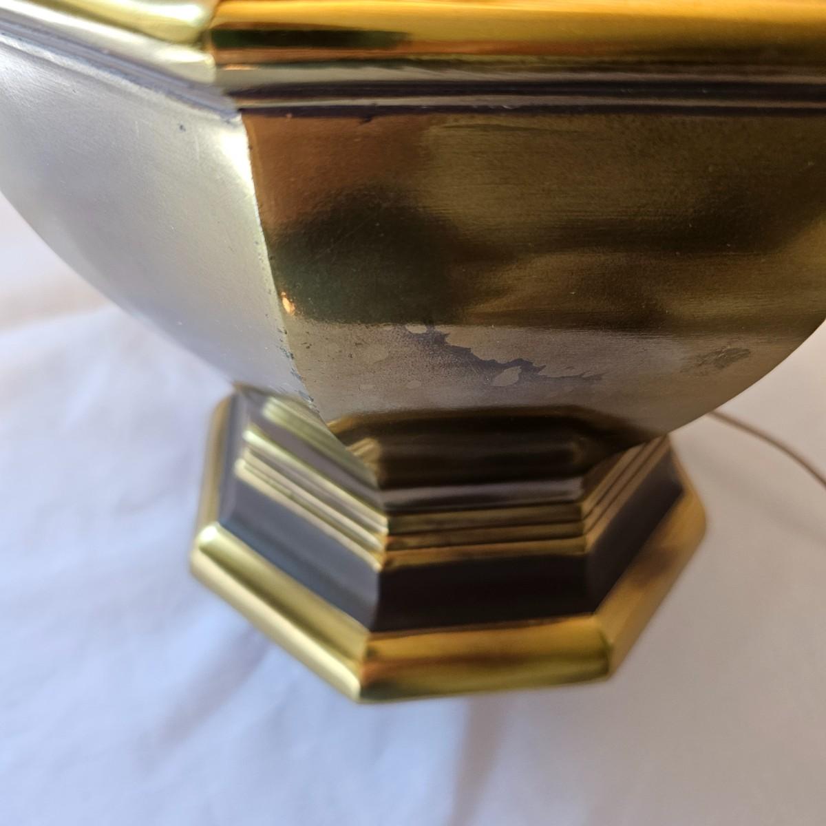 Octagonal styled brass base on this 3-way table lamp with custom made shade. Lamp has some patina on base, measures 20.5"D x 31"H. Lamp powered on when plugged in. See photos for details. Local pickup only.
