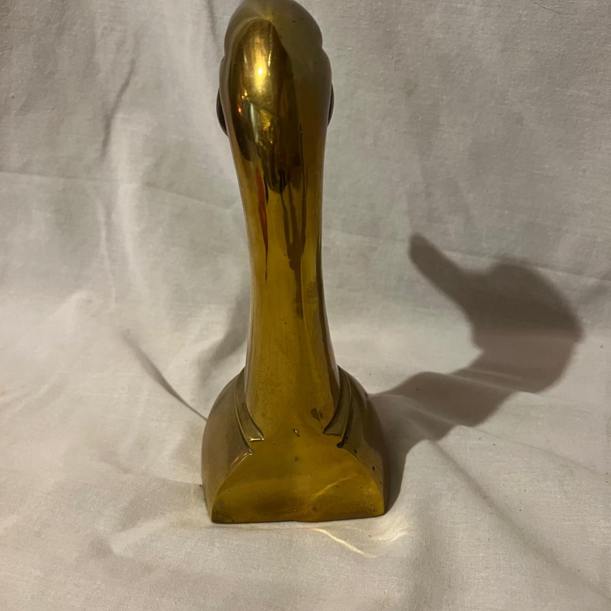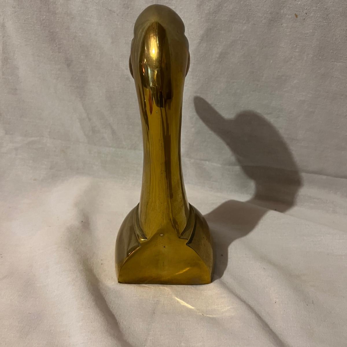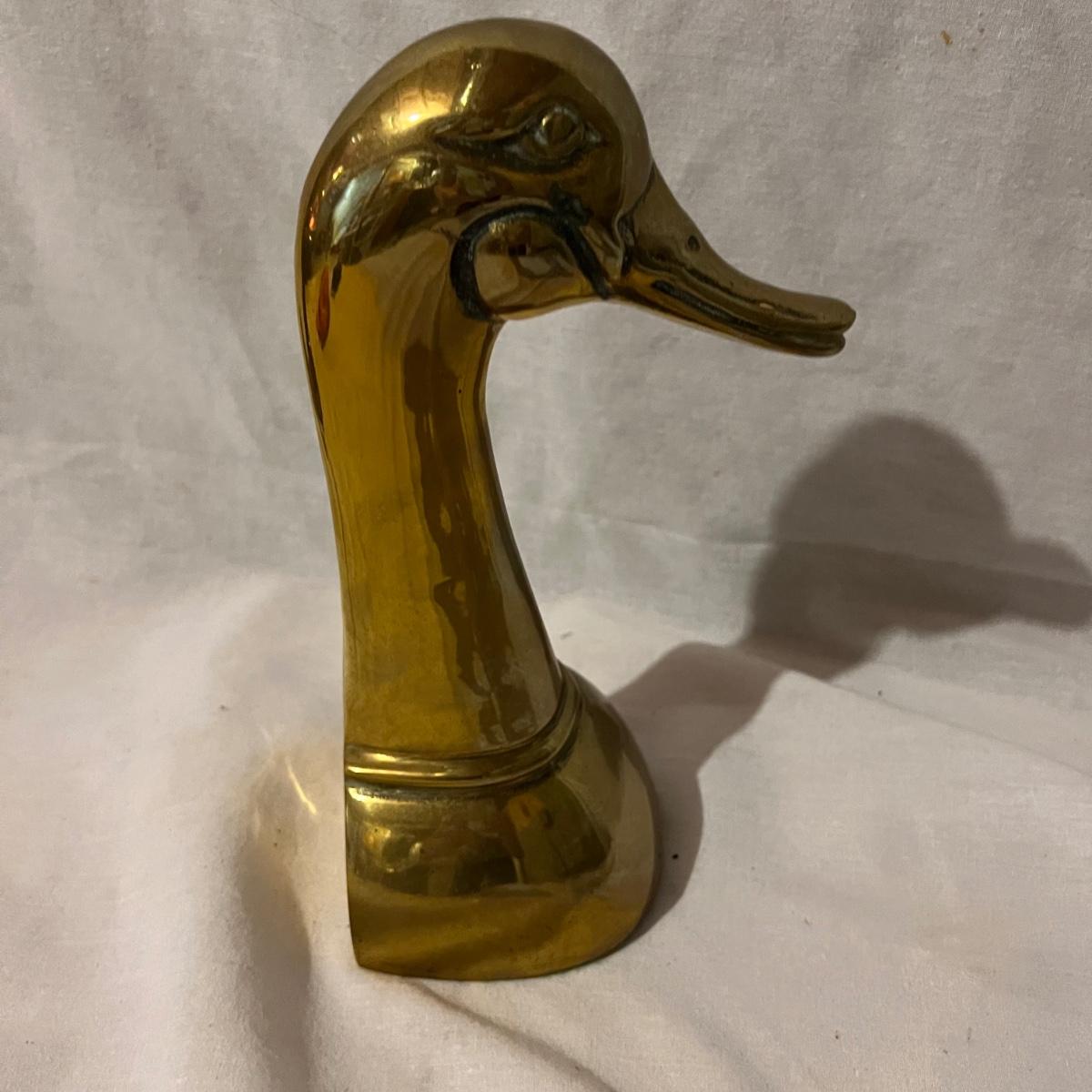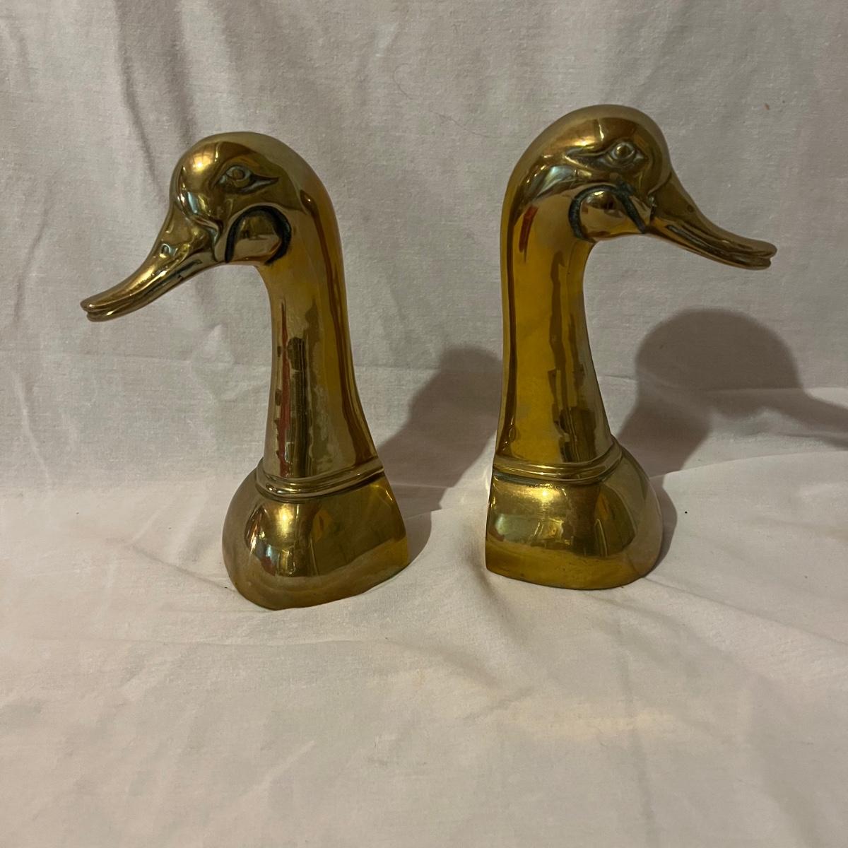 Two brass long neck duck head bookends that measure approximately 6” x 4” x 9.5”H each.
