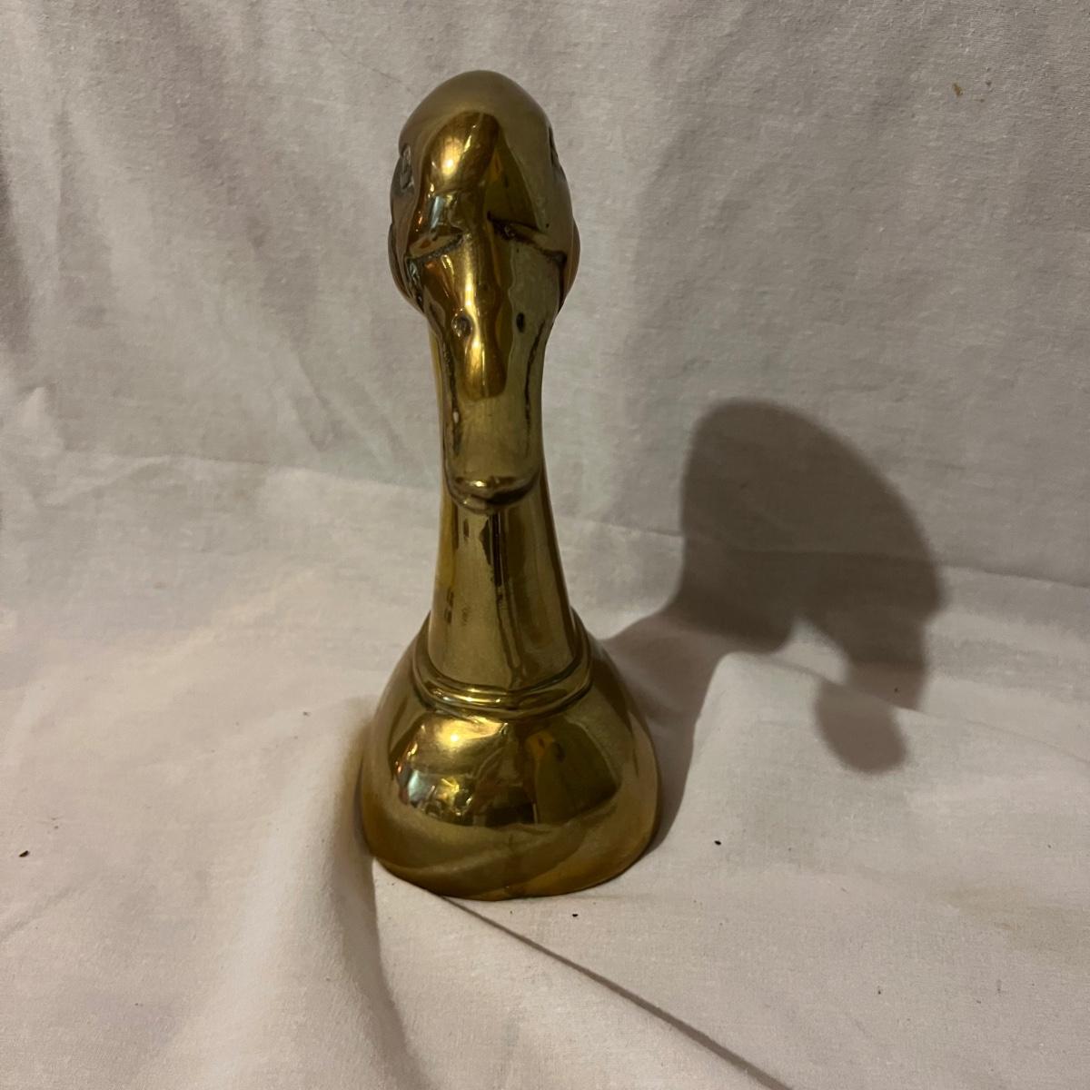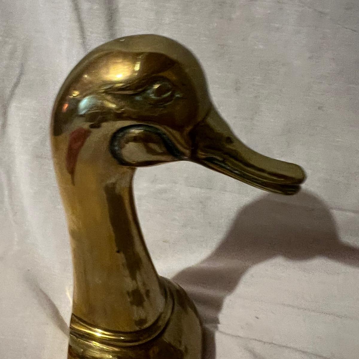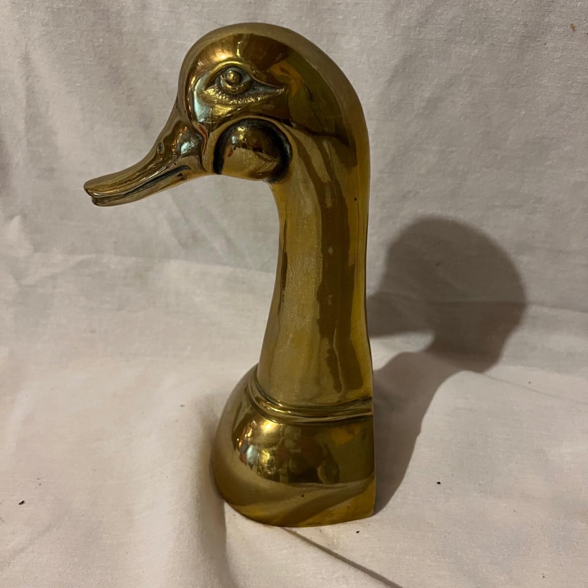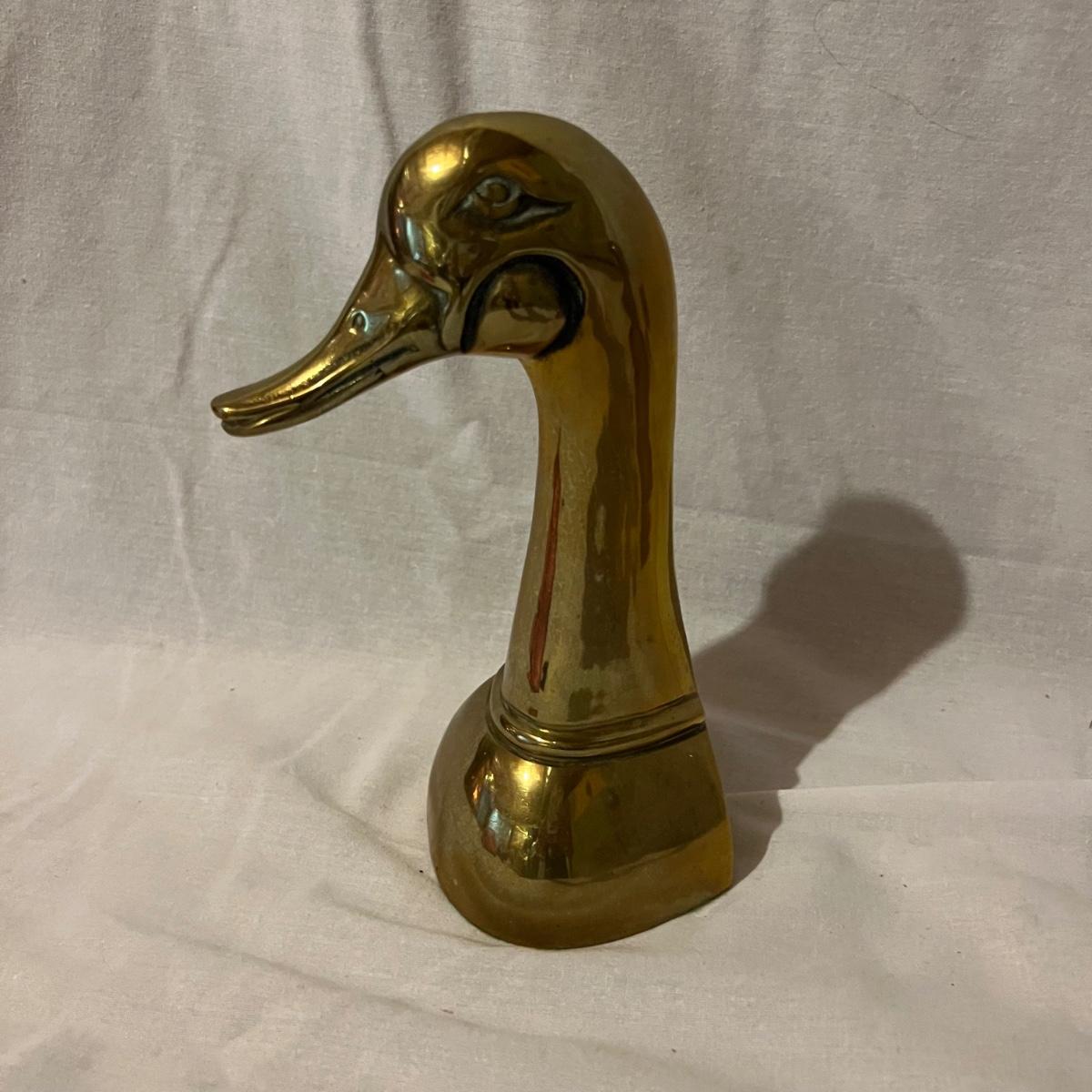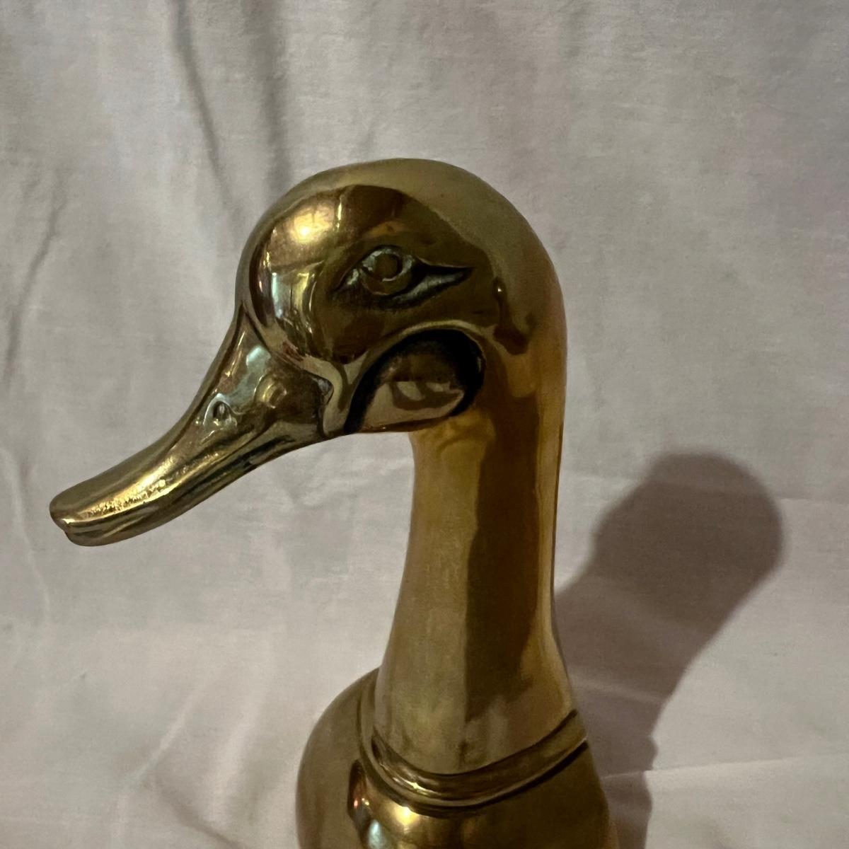 Two brass long neck duck head bookends that measure approximately 6” x 4” x 9.5”H each.