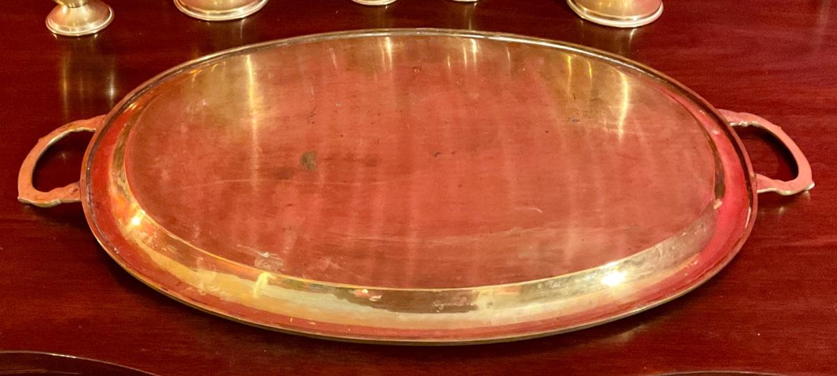 Brass tea set with handled tray, has two tea pots, sugar with cover, creamer, waist bowl