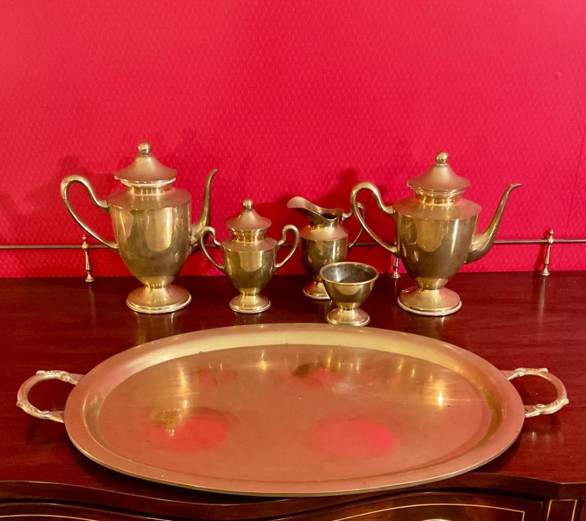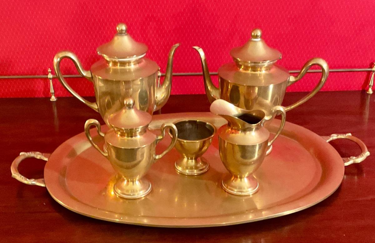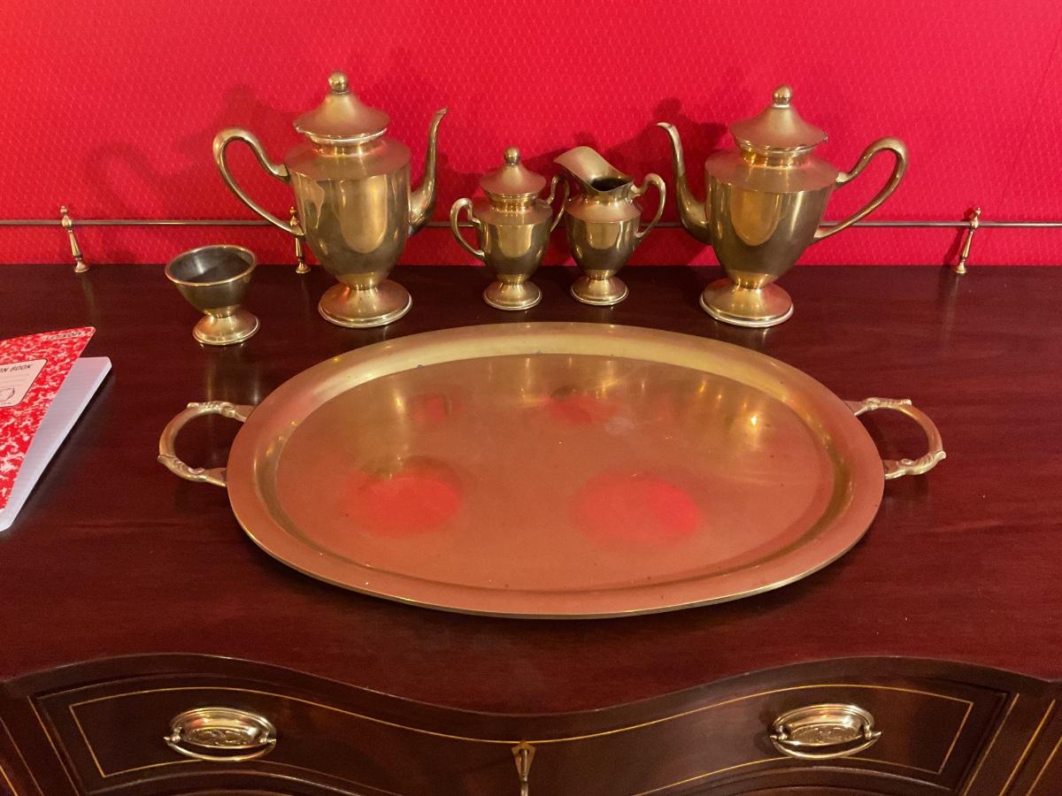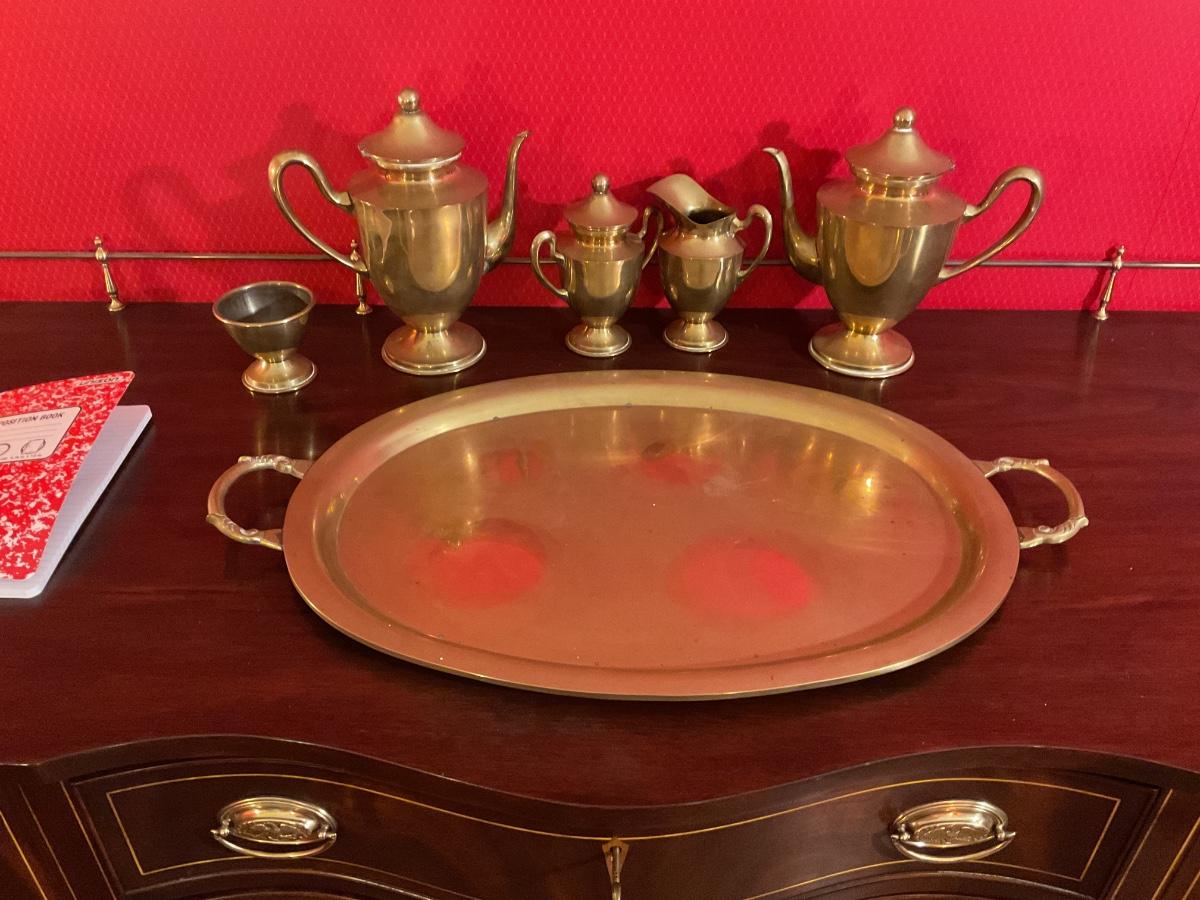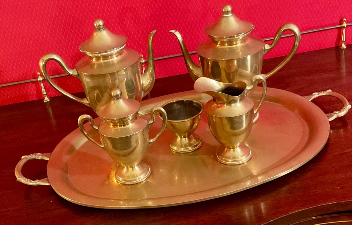 Beautiful estate piece brass tea set, has tray, two pots, covered sugar, creamer and waist pot