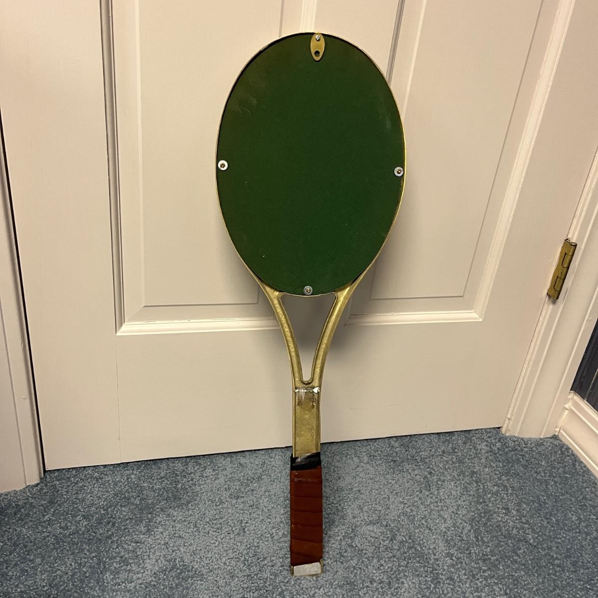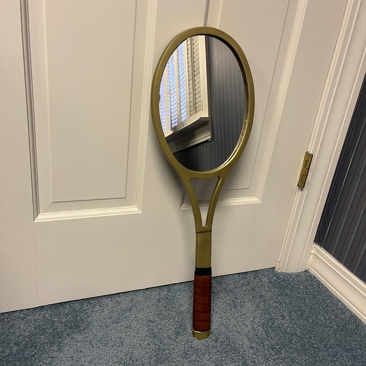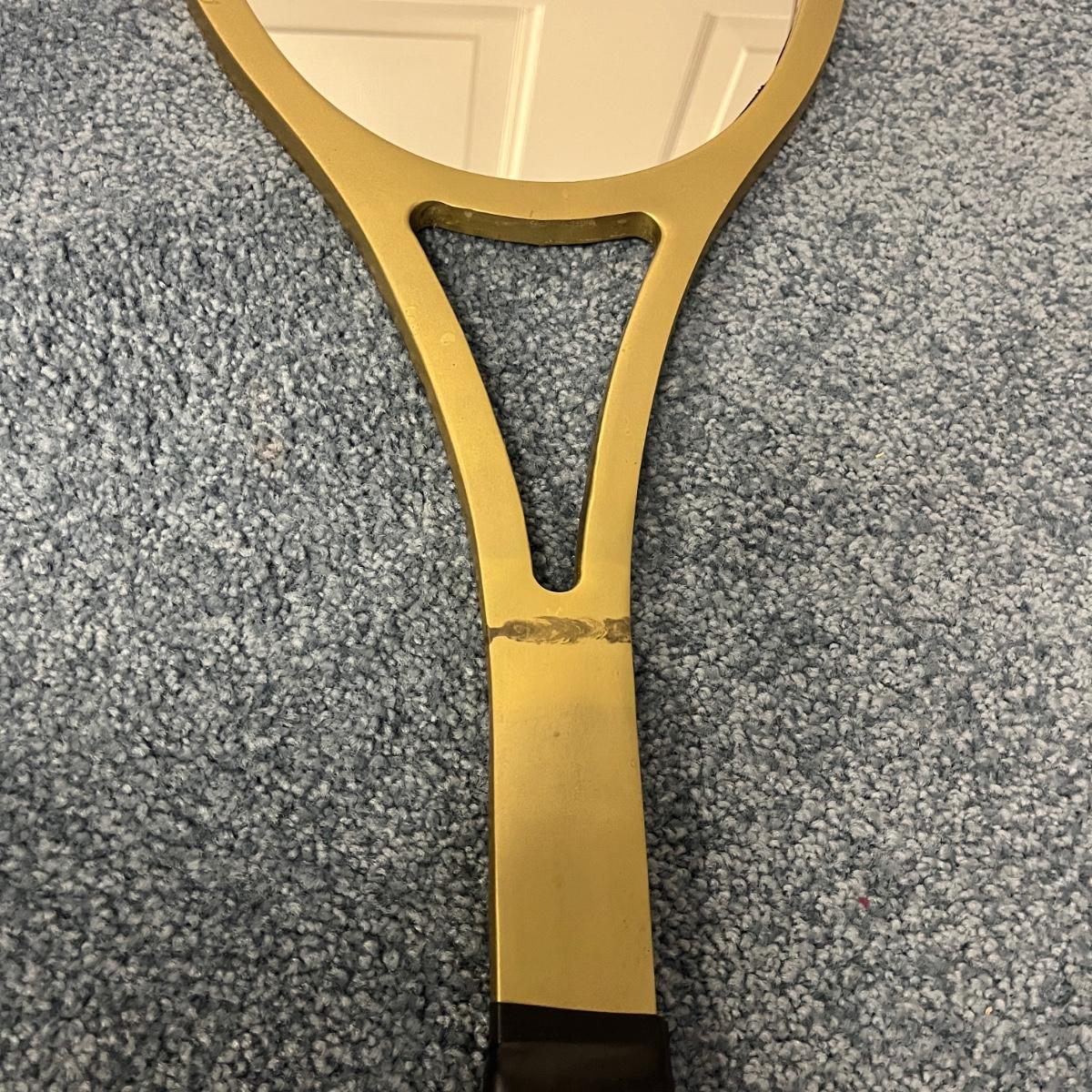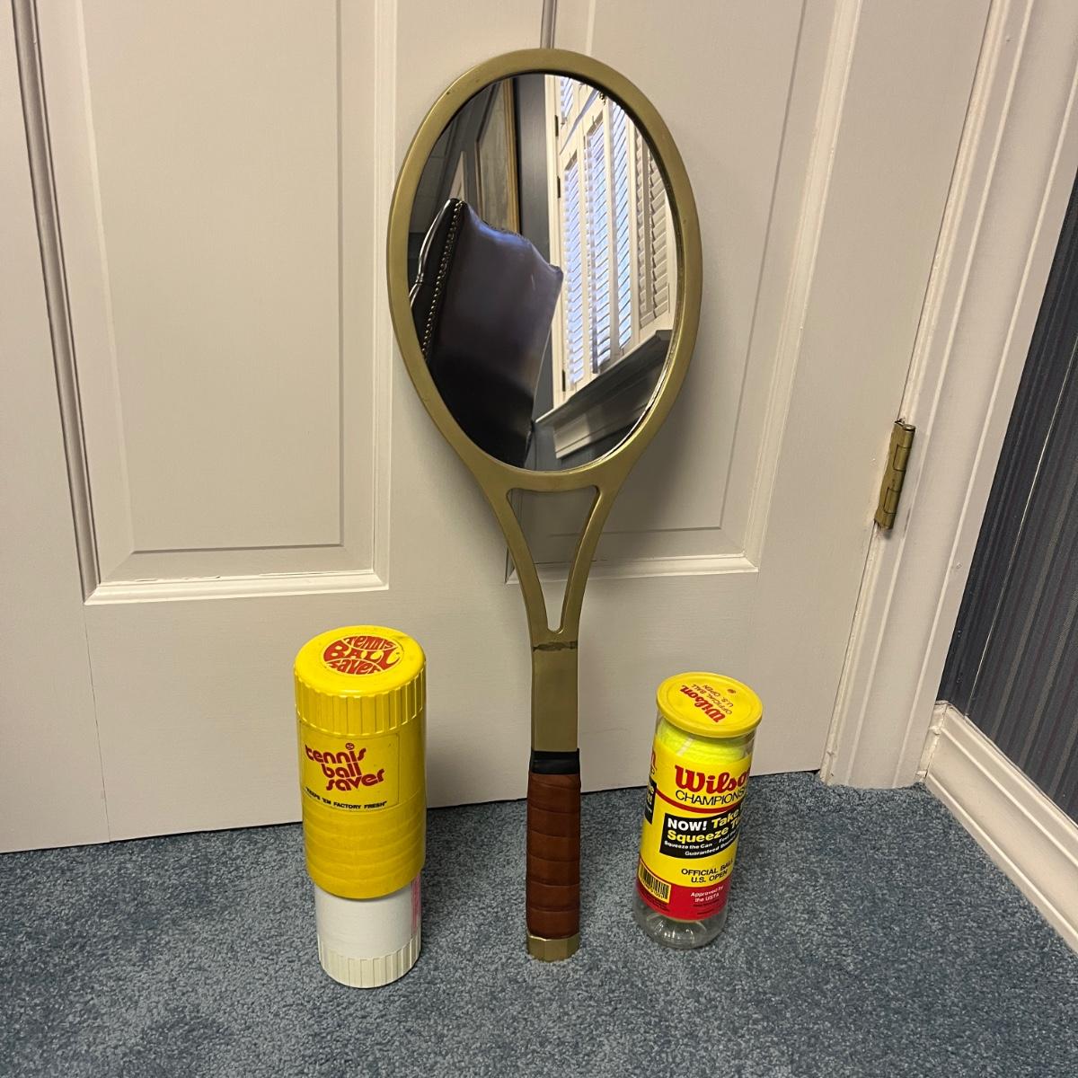Lot includes a tennis ball saver, a pack of three new Wilson tennis balls and a brass tennis racket mirror. Racket measures 8.5” x .5” x 28”H. Racket has discoloration on neck, see pictures.