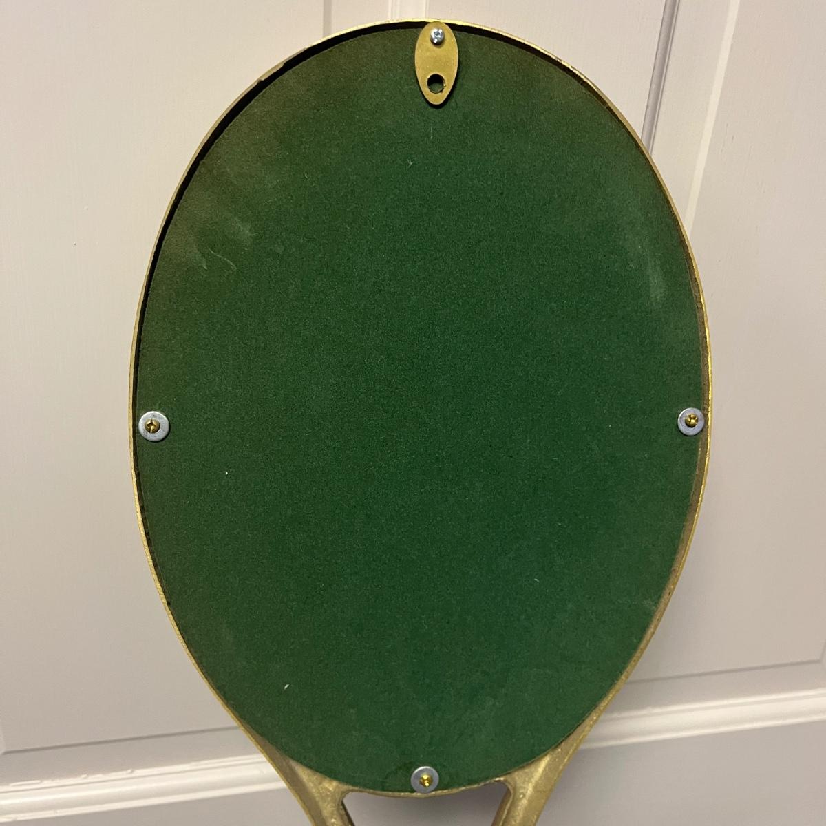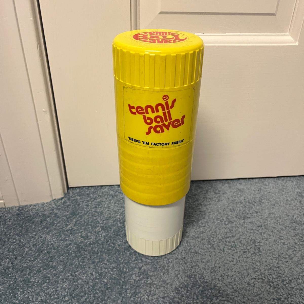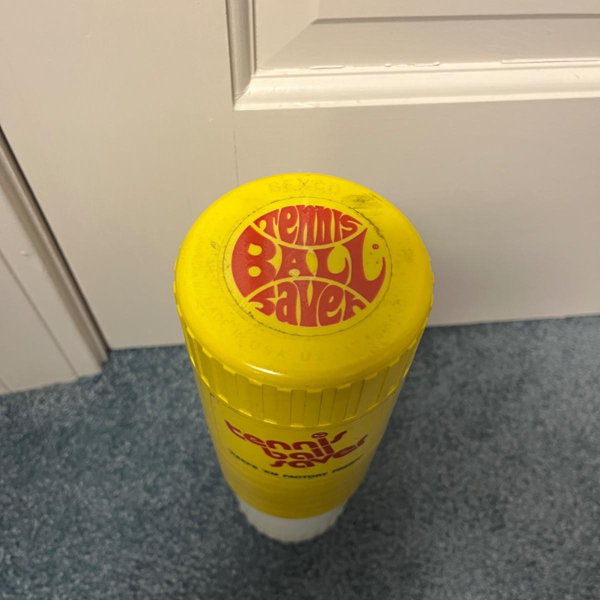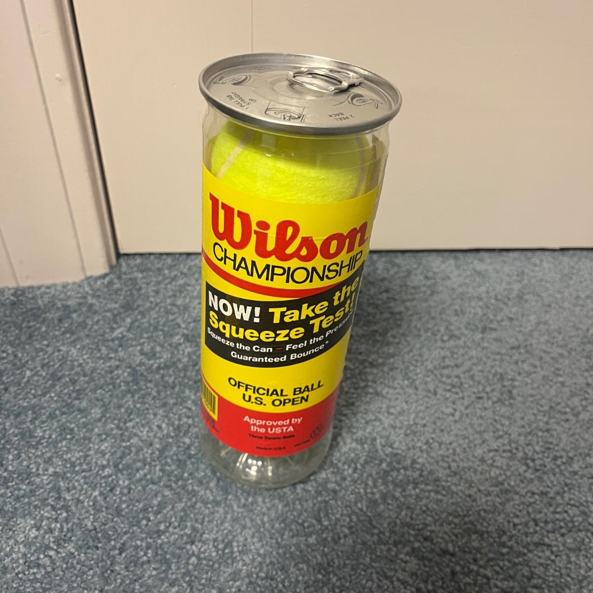 Lot includes a tennis ball saver, a pack of three new Wilson tennis balls and a brass tennis racket mirror. Racket measures 8.5” x .5” x 28”H. Racket has discoloration on neck, see pictures.