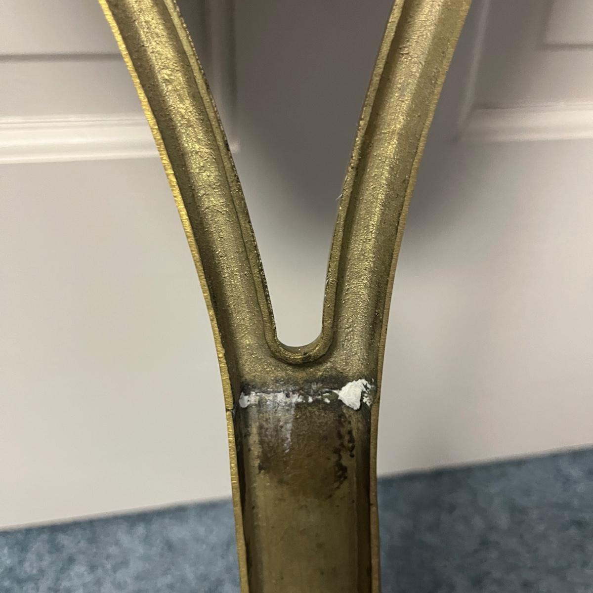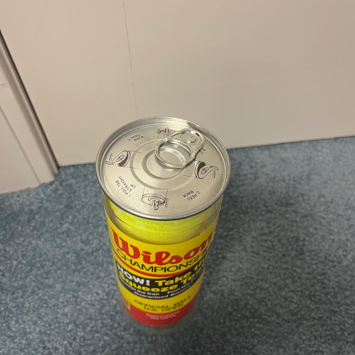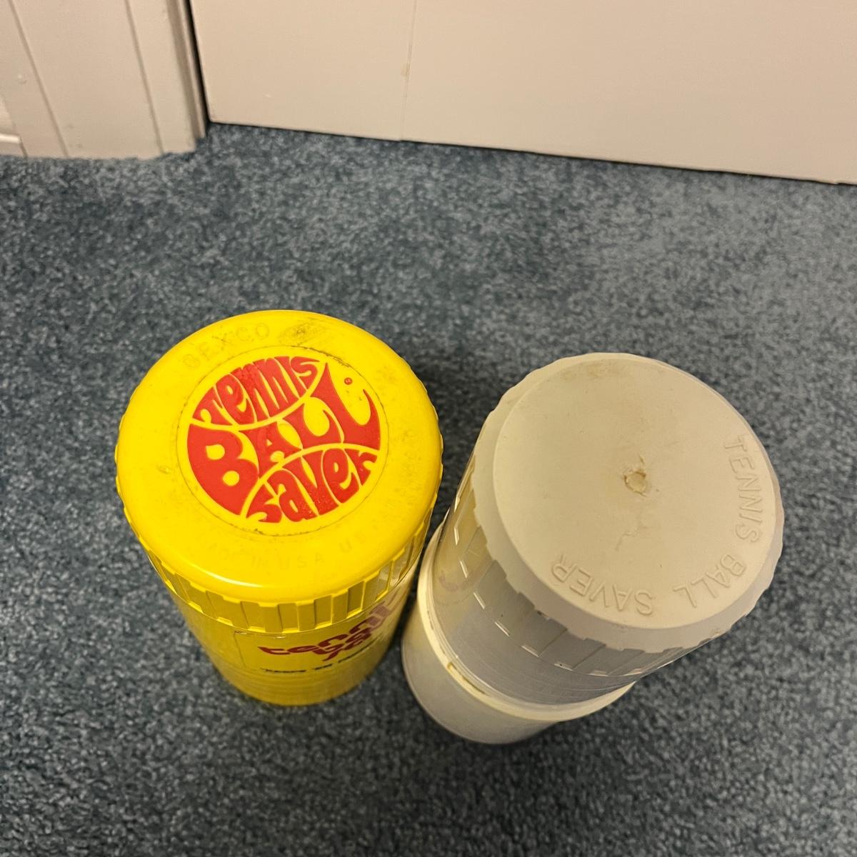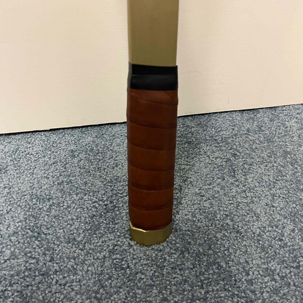 Lot includes a tennis ball saver, a pack of three new Wilson tennis balls and a brass tennis racket mirror. Racket measures 8.5” x .5” x 28”H. Racket has discoloration on neck, see pictures.