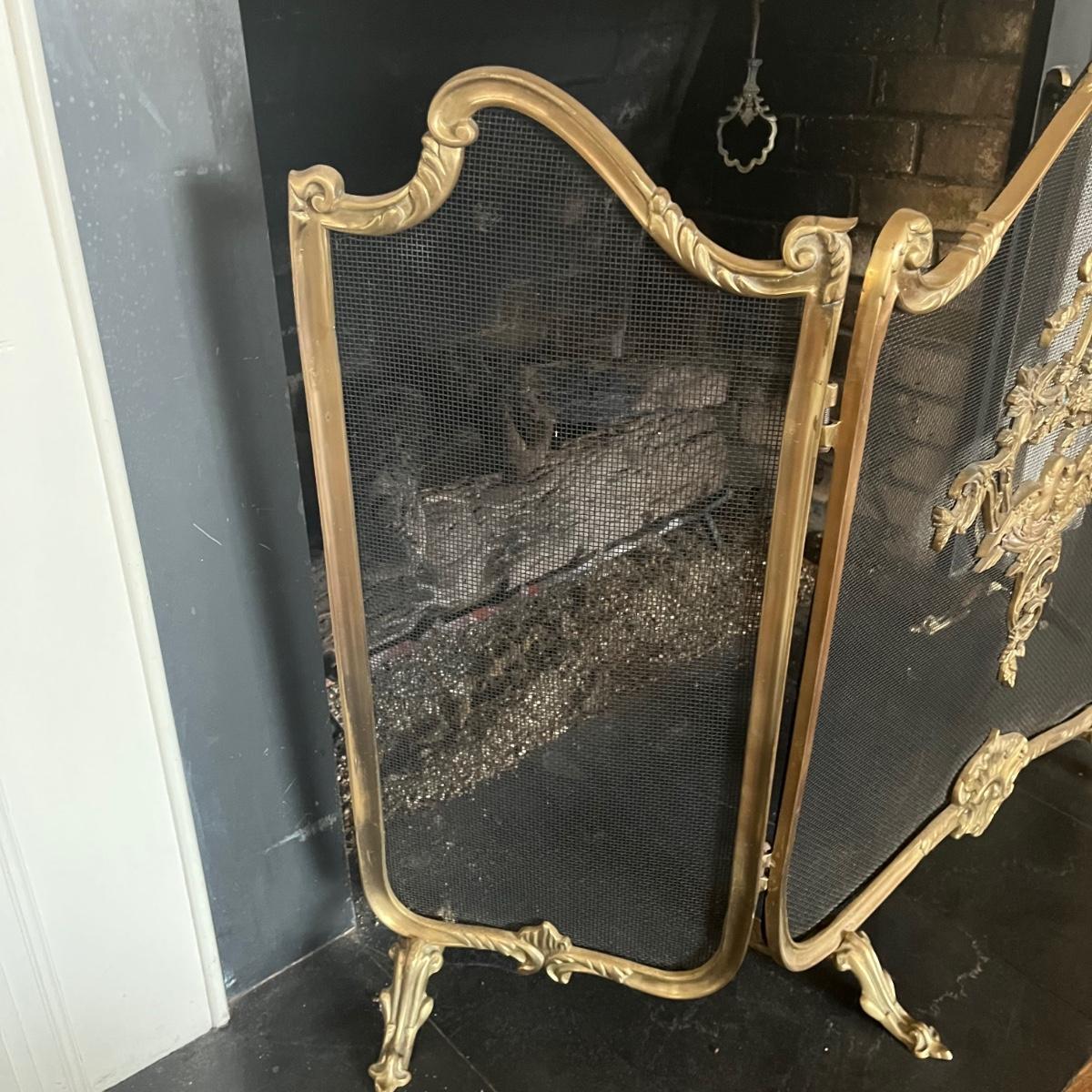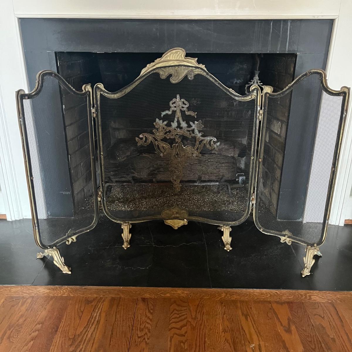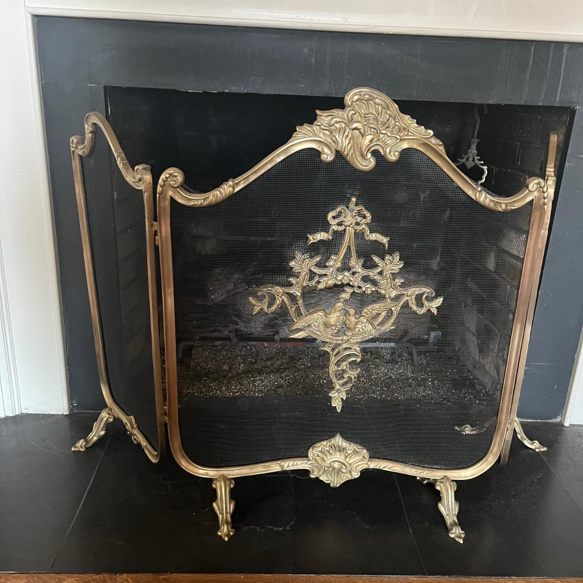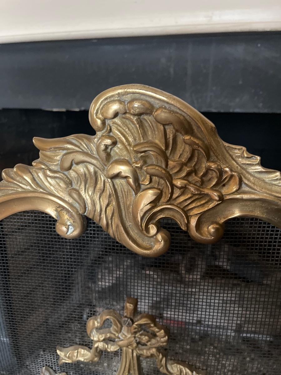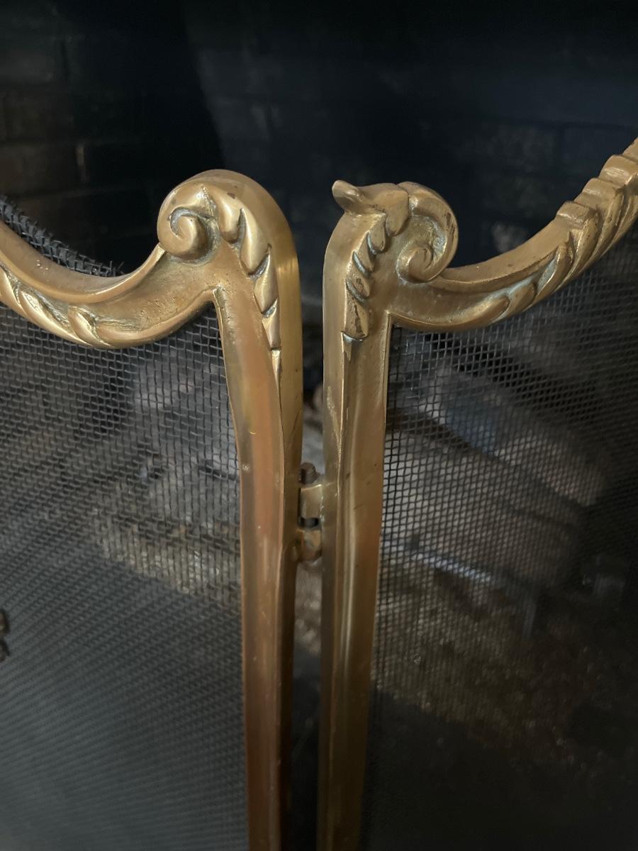 A beautifully ornate three-paneled brass fireplace screen. The metal screen is within a brass frame with brass feet and brass decor. Small section of screen needs to be reattached to frame, but item is otherwise in good condition. See photos for details. Item measures approximately 9” x 51” x 32”.