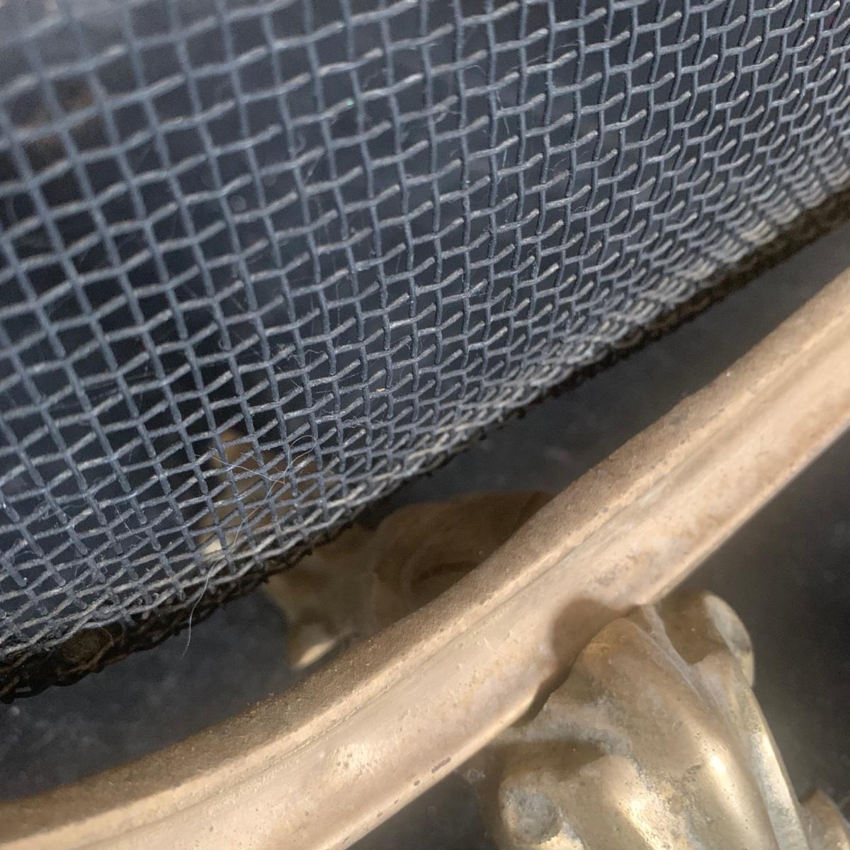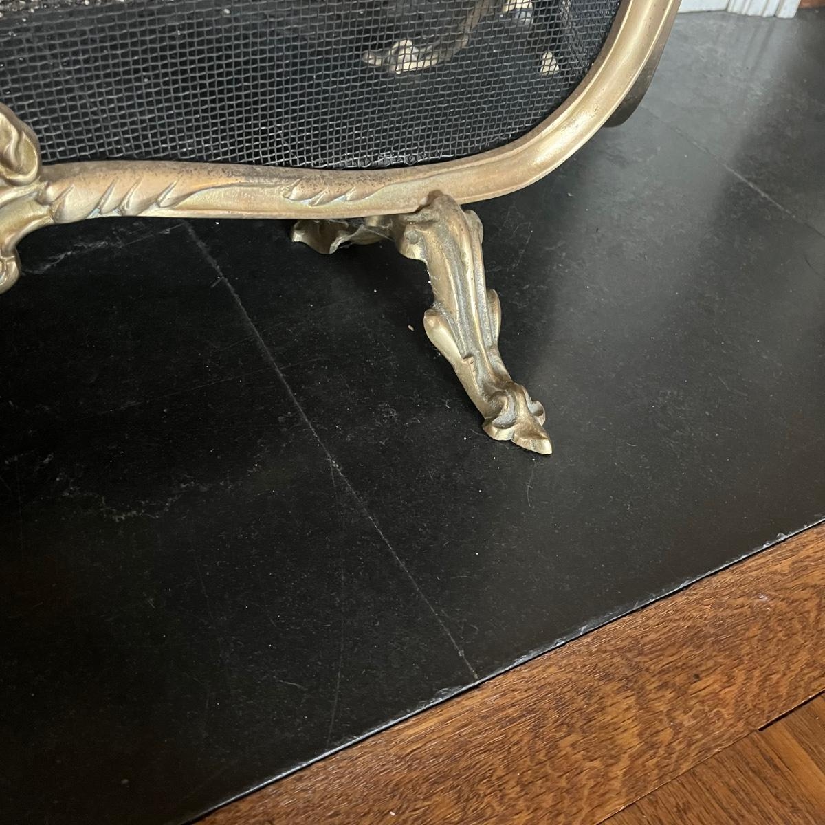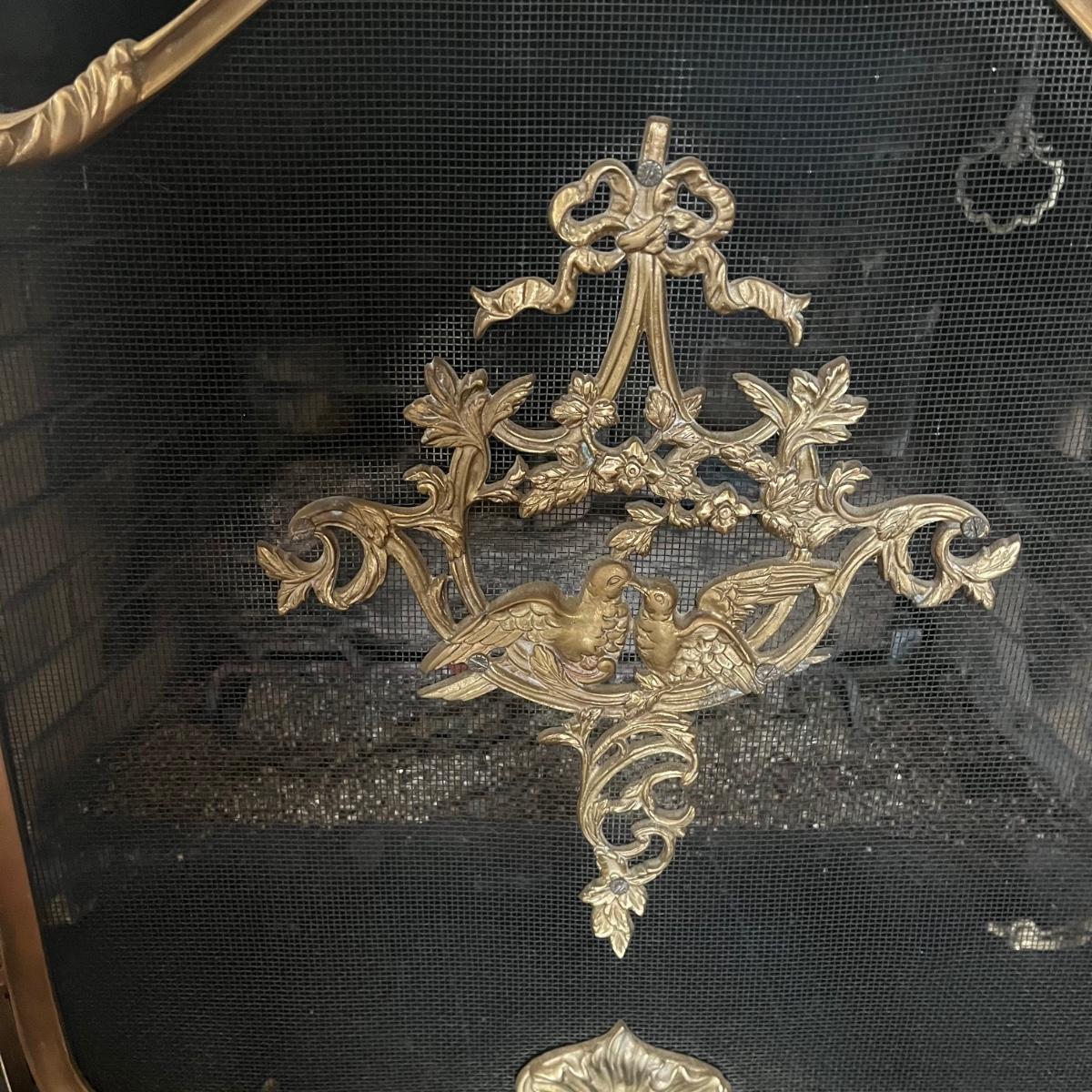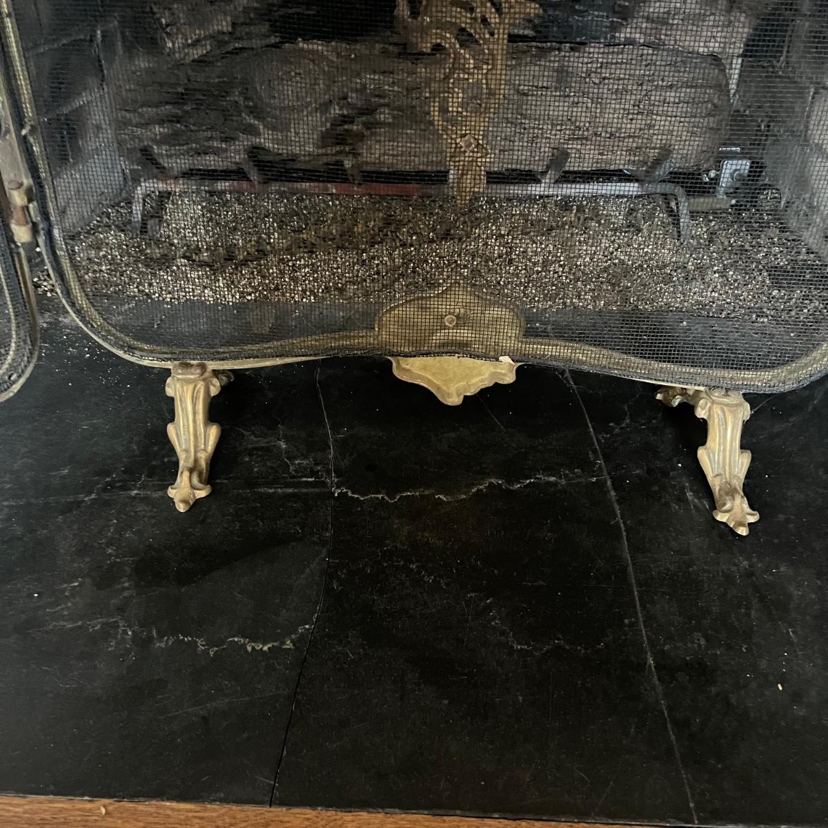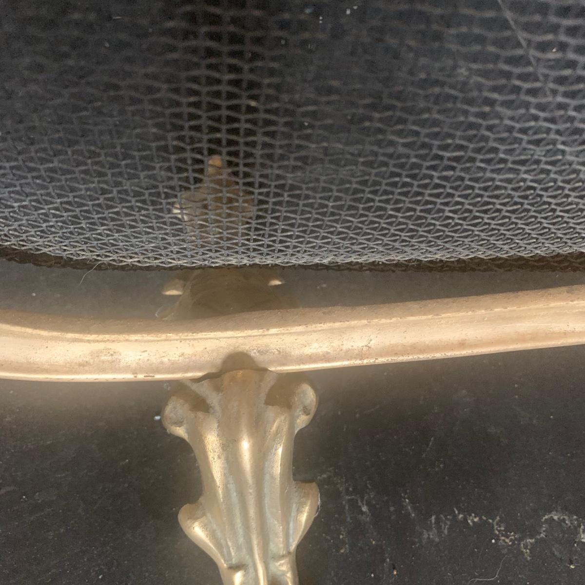 A beautifully ornate three-paneled brass fireplace screen. The metal screen is within a brass frame with brass feet and brass decor. Small section of screen needs to be reattached to frame, but item is otherwise in good condition. See photos for details. Item measures approximately 9” x 51” x 32”.