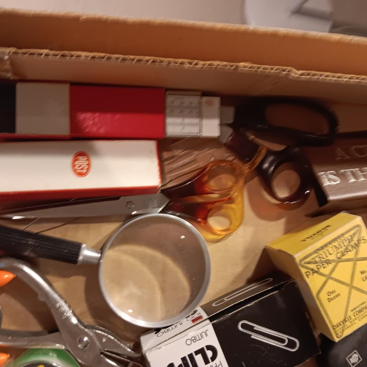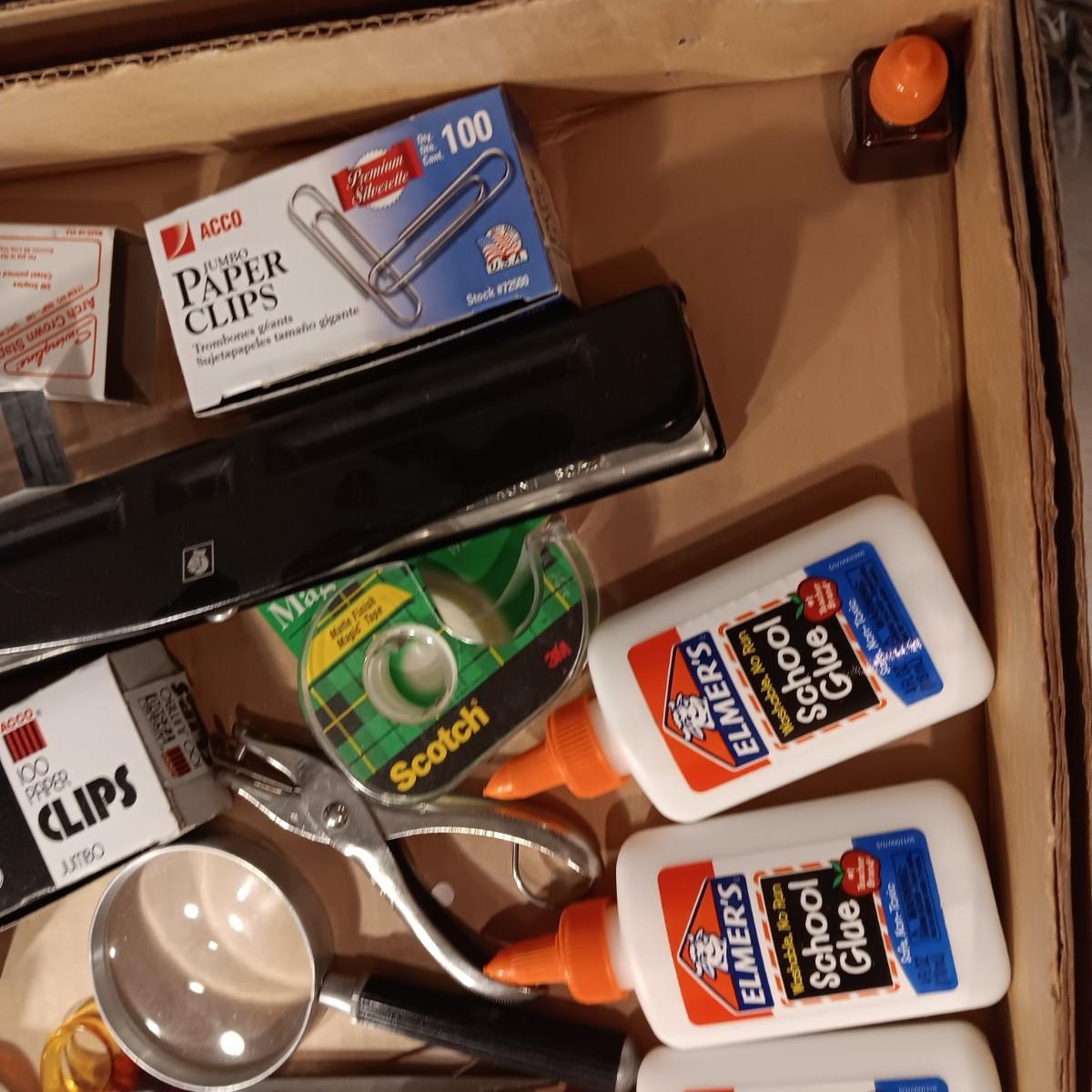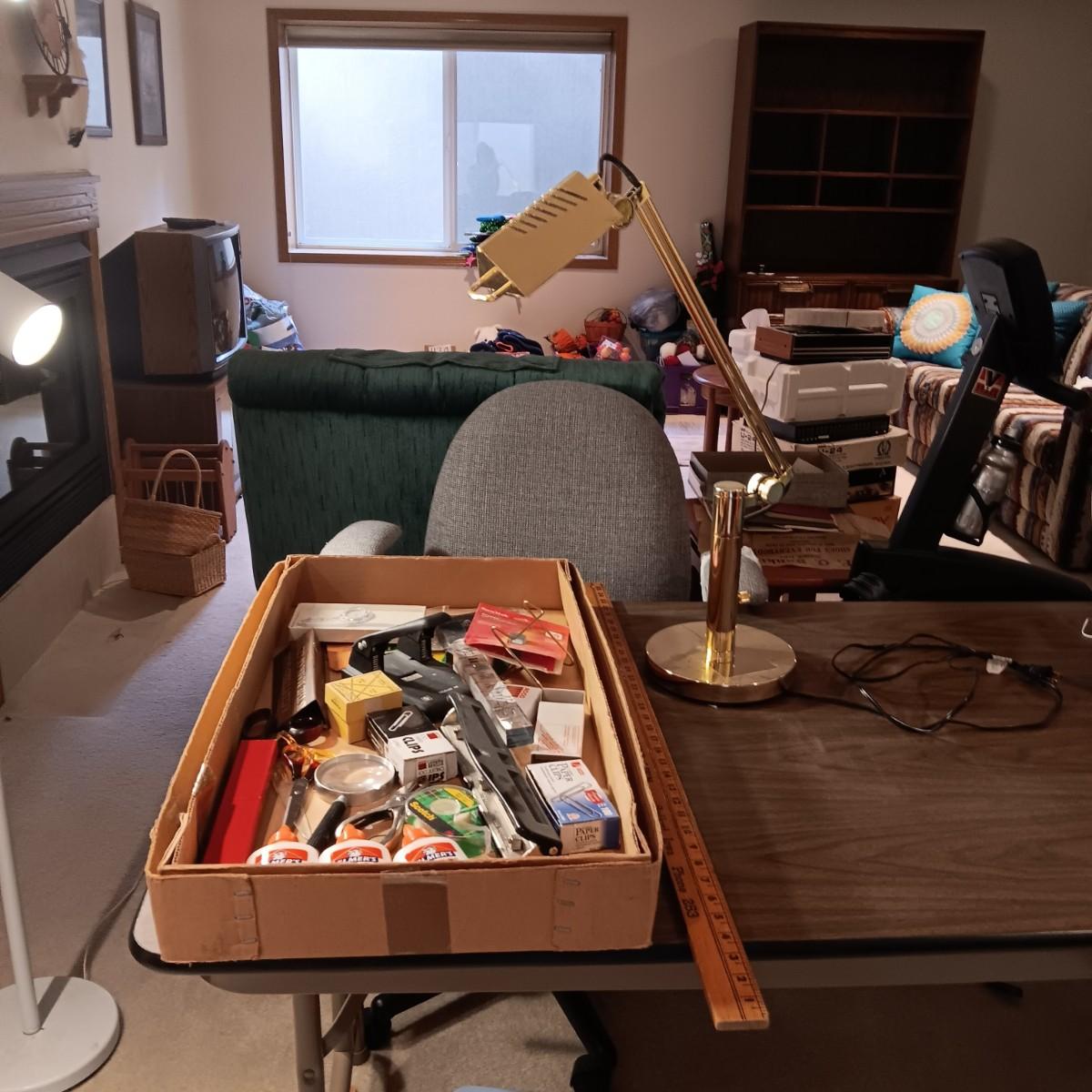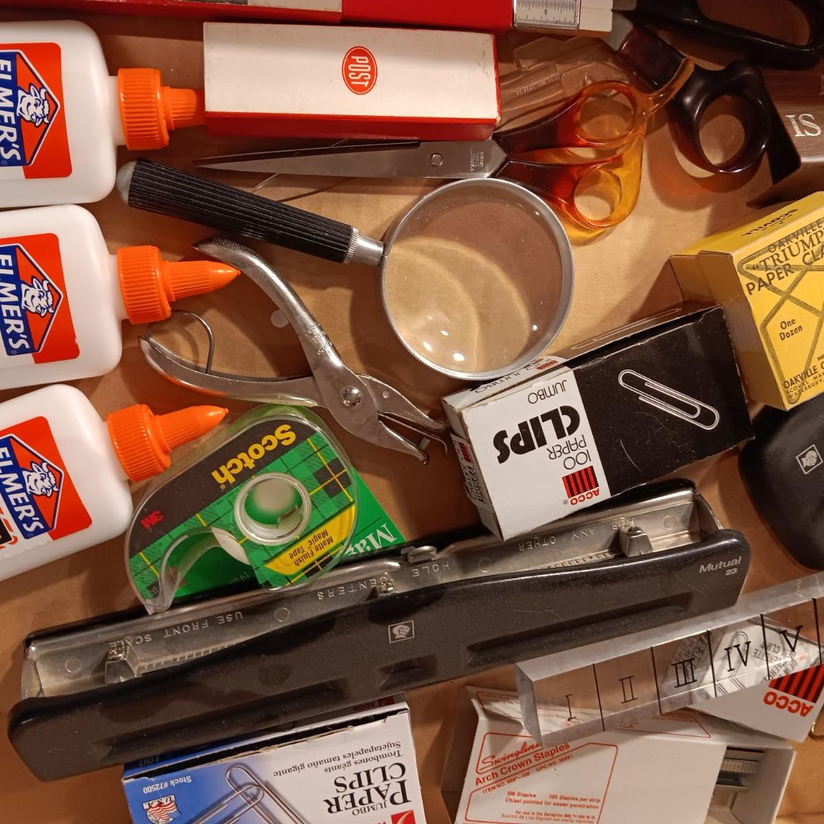 BRASS TONE ADJUSTABLE DESK LAMP AND A LARGE BOX OF OFFICE SUPPLIES