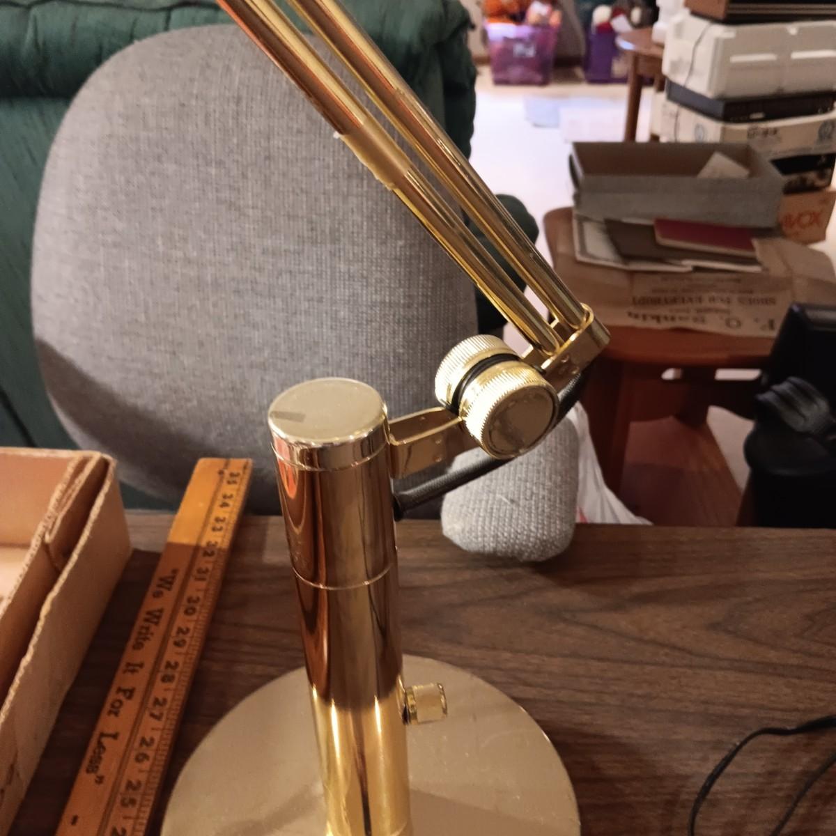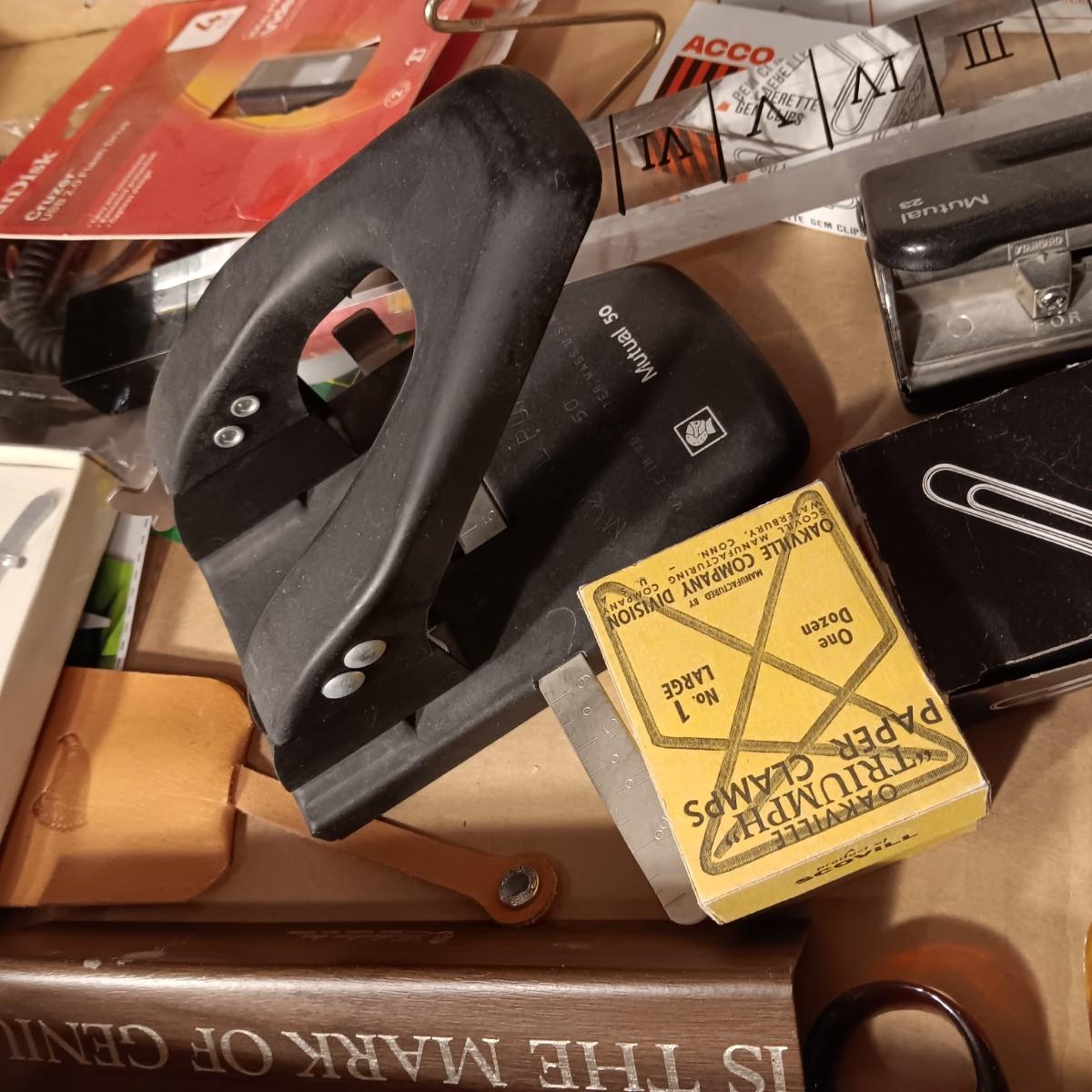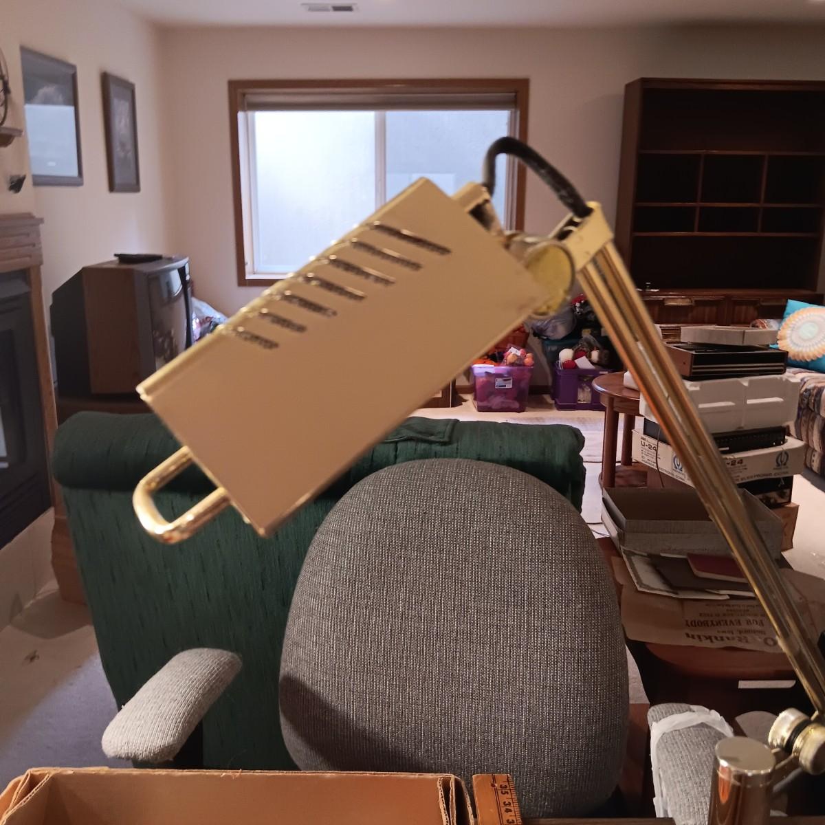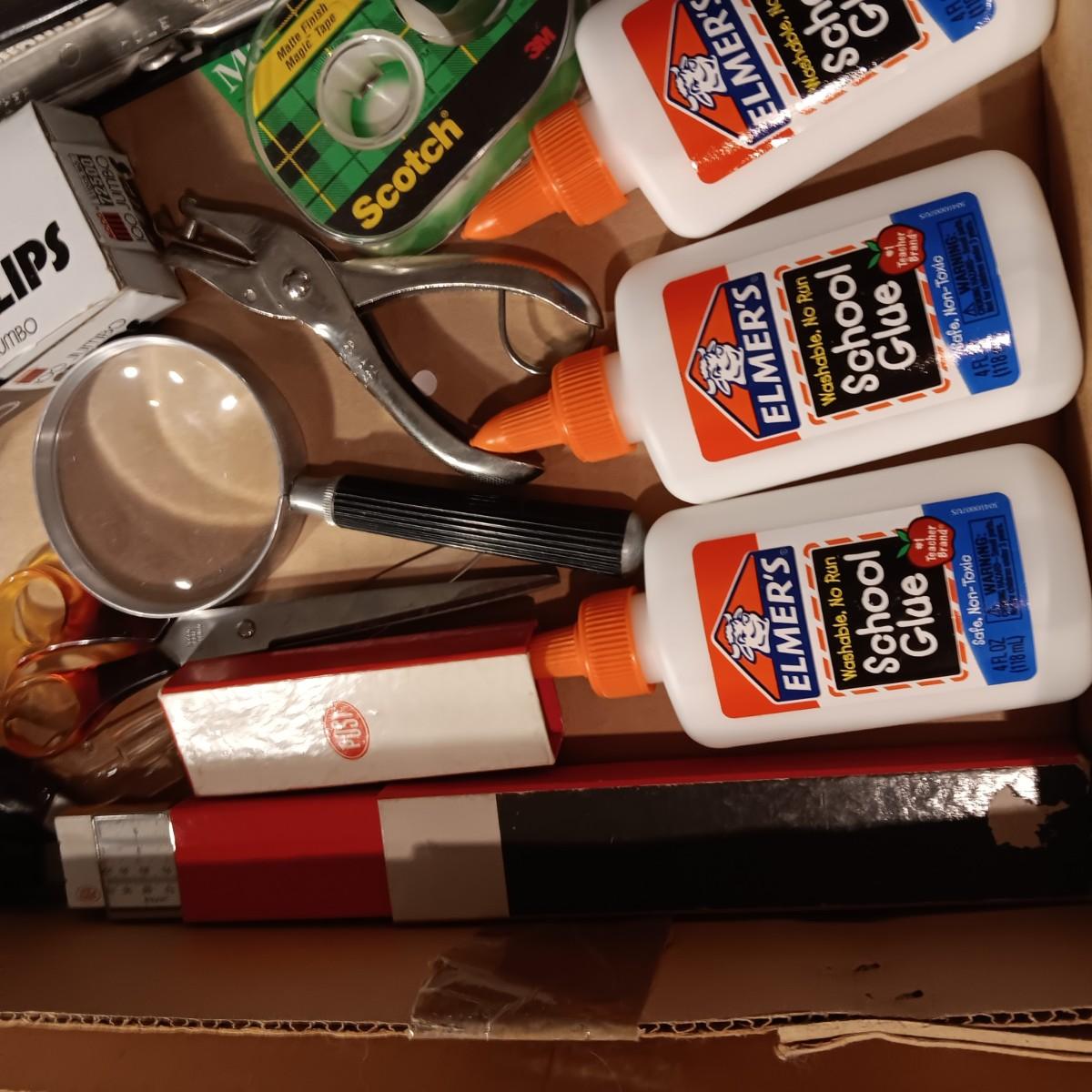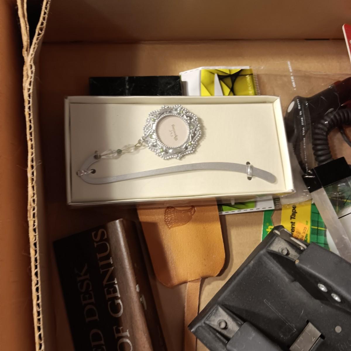 BRASS TONE ADJUSTABLE DESK LAMP AND A LARGE BOX OF OFFICE SUPPLIES