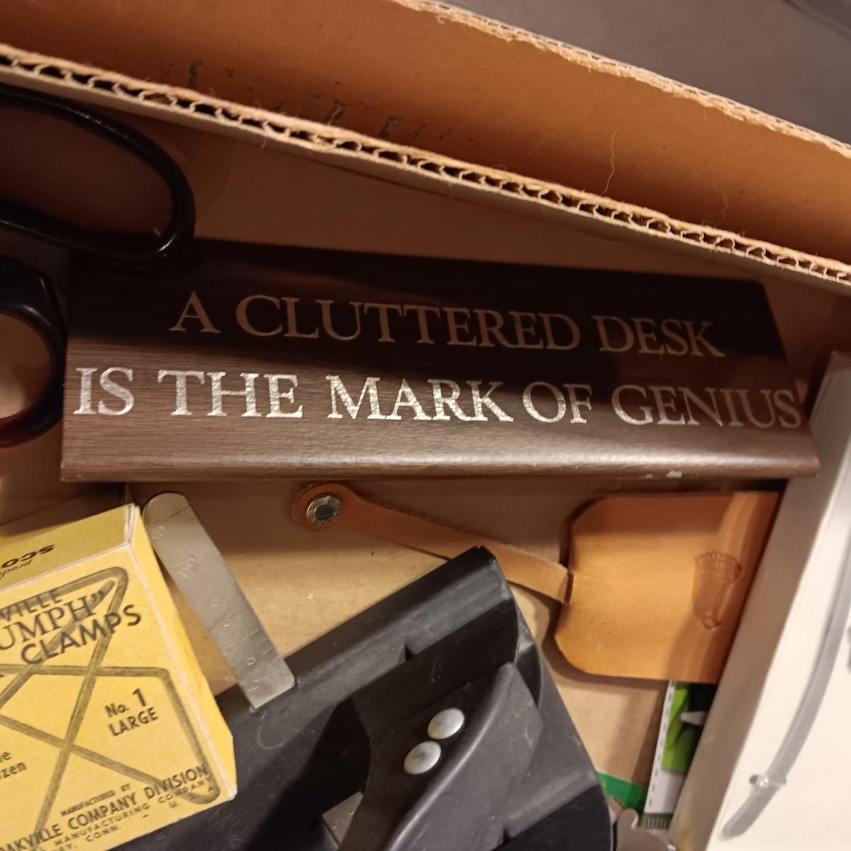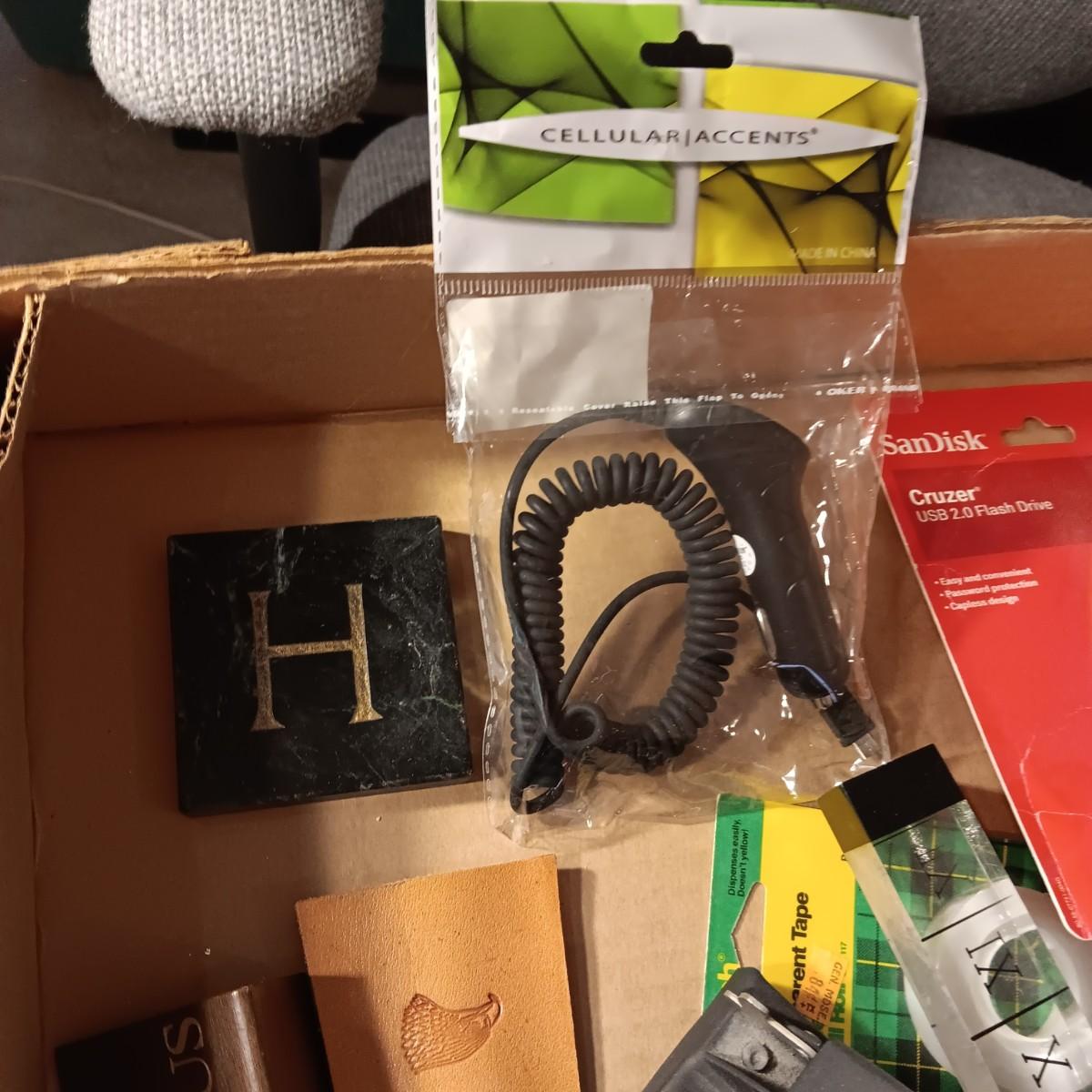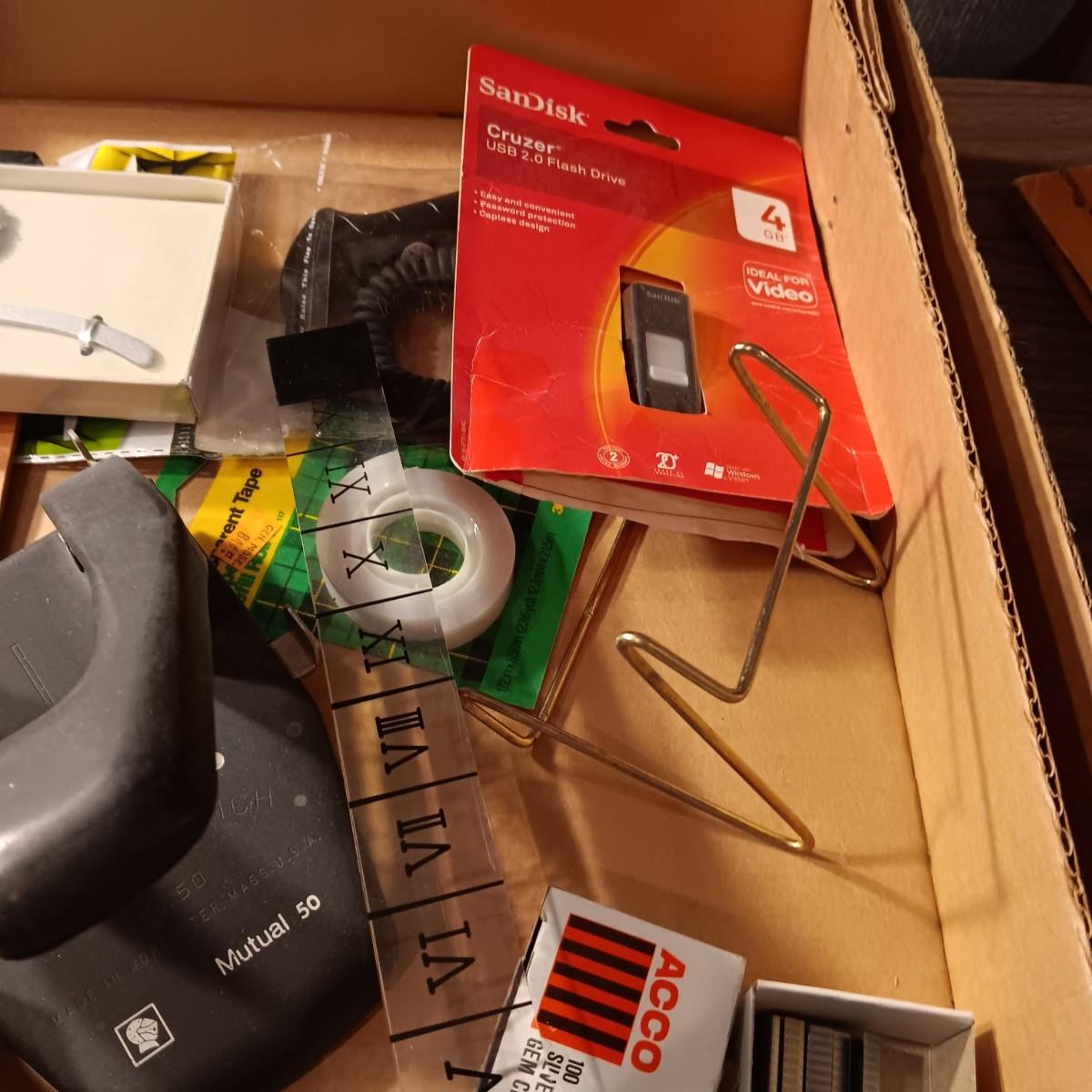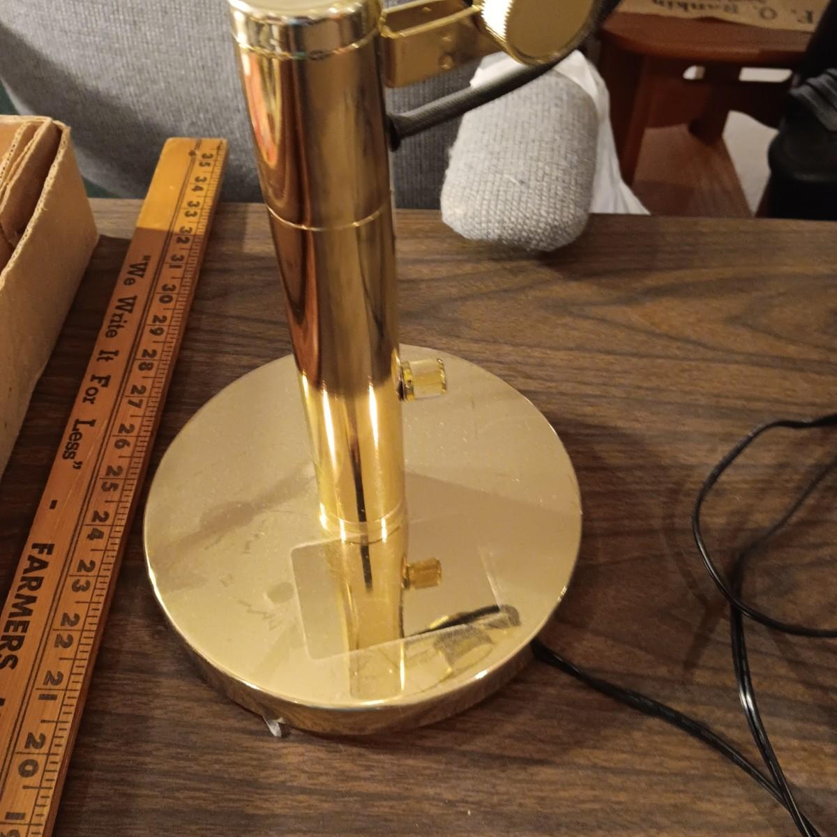 BRASS TONE ADJUSTABLE DESK LAMP AND A LARGE BOX OF OFFICE SUPPLIES