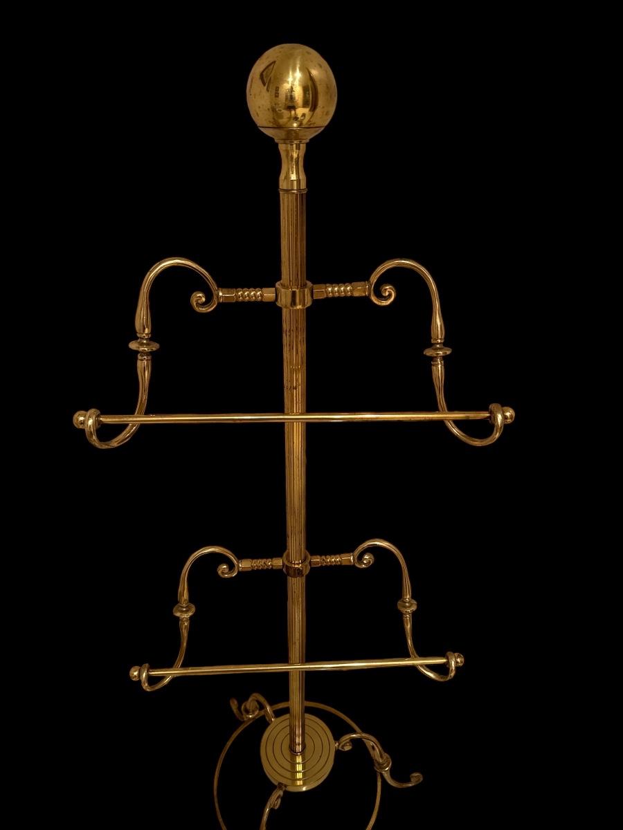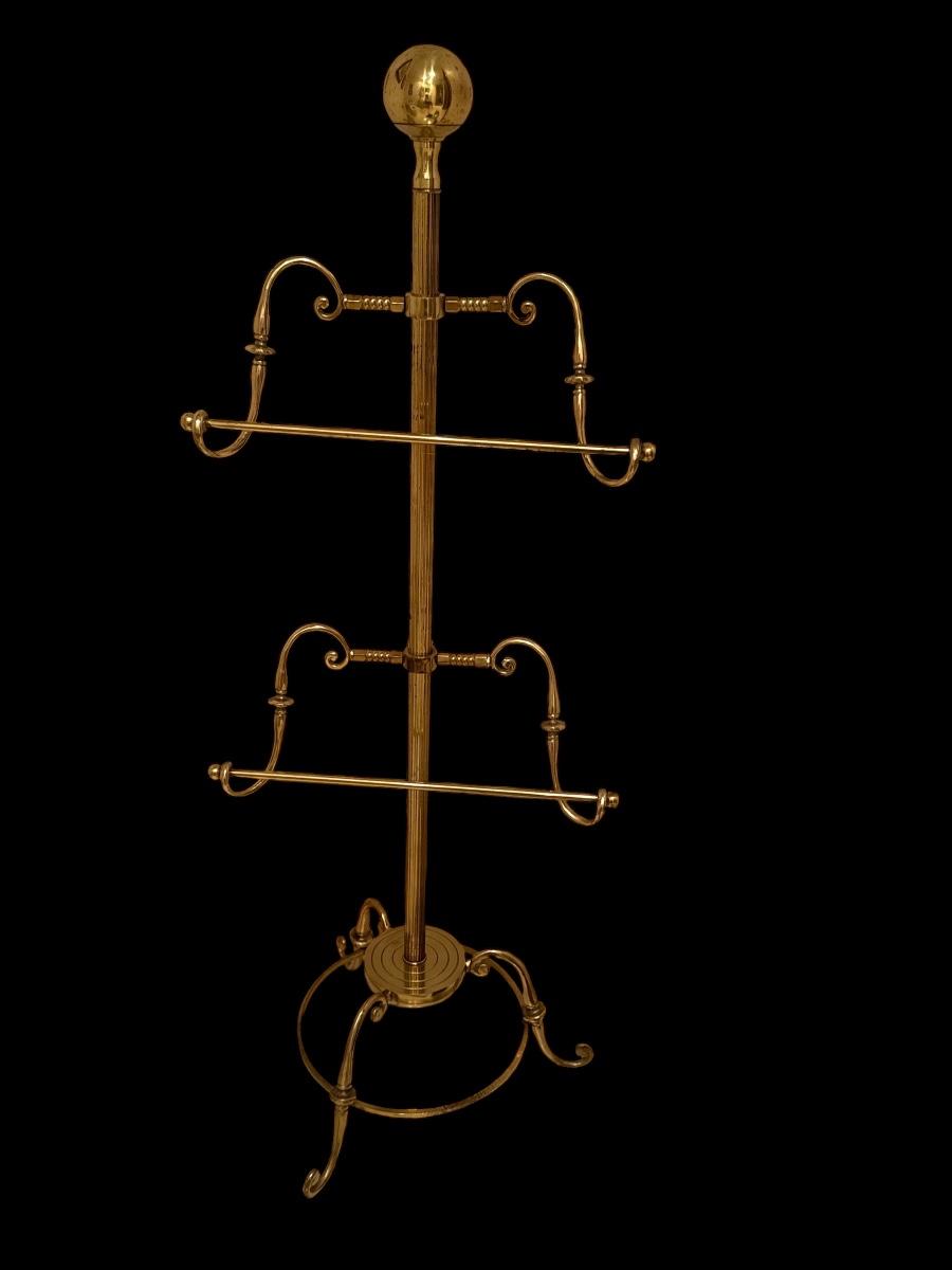 Elegant freestanding brass towel rack with a polished finish. Features two tiers of scroll-accented arms for hanging towels or garments, topped with a decorative finial and supported by a round, tripod-style base. Both functional and decorative—perfect for a bath, dressing room, or guest space.