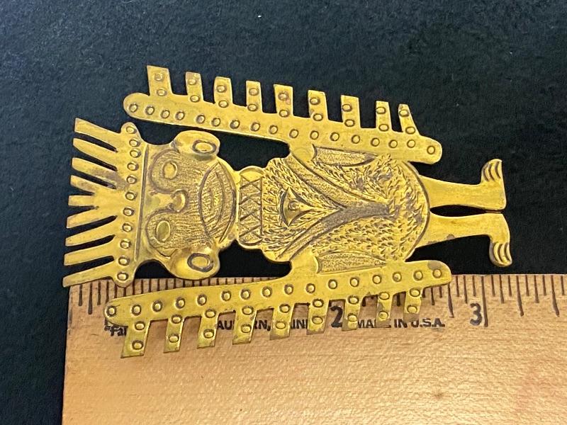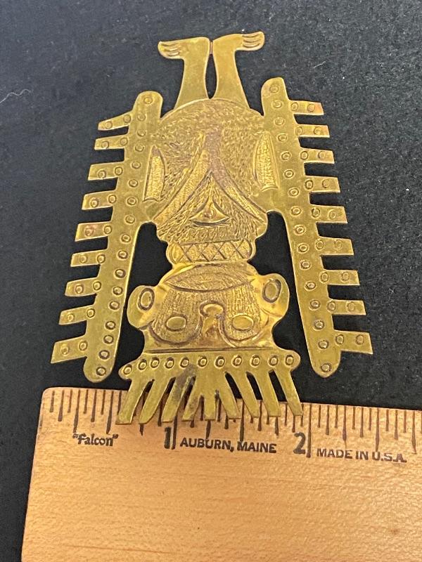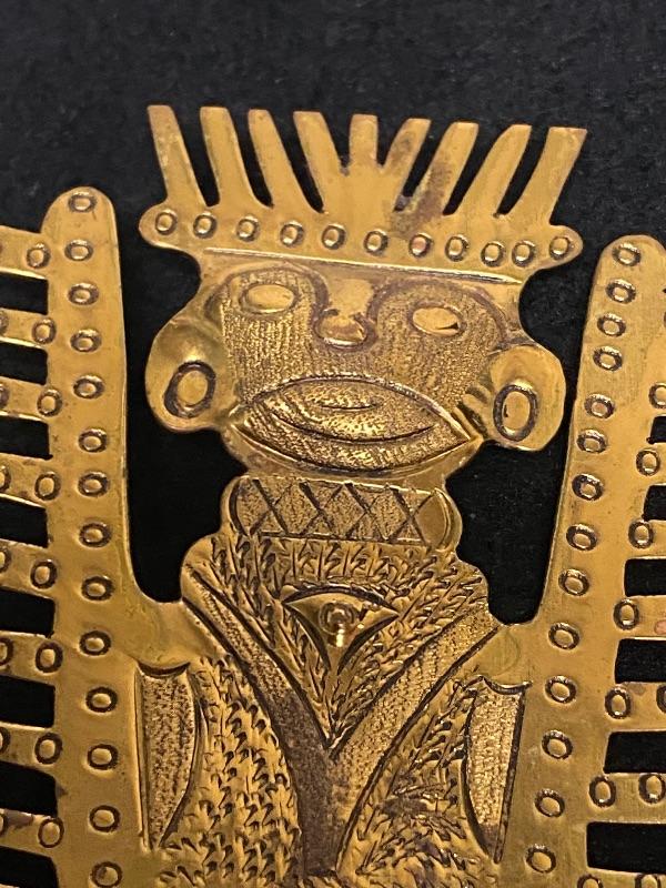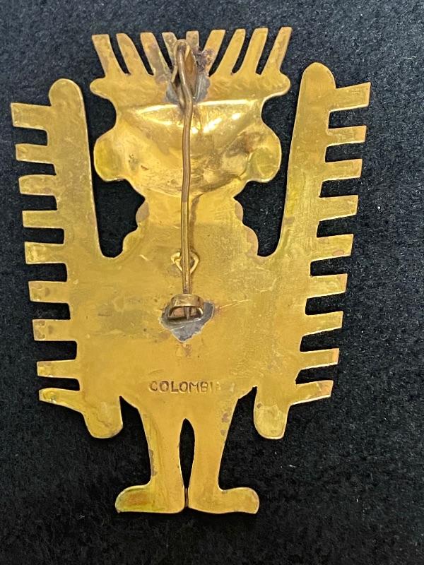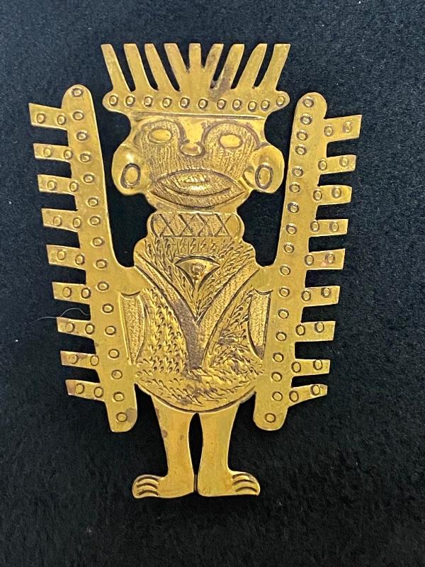 Tribal Man pin. Looks like hammered and stamped brass. Stamped Colombia on the back. A little over 3" in length.