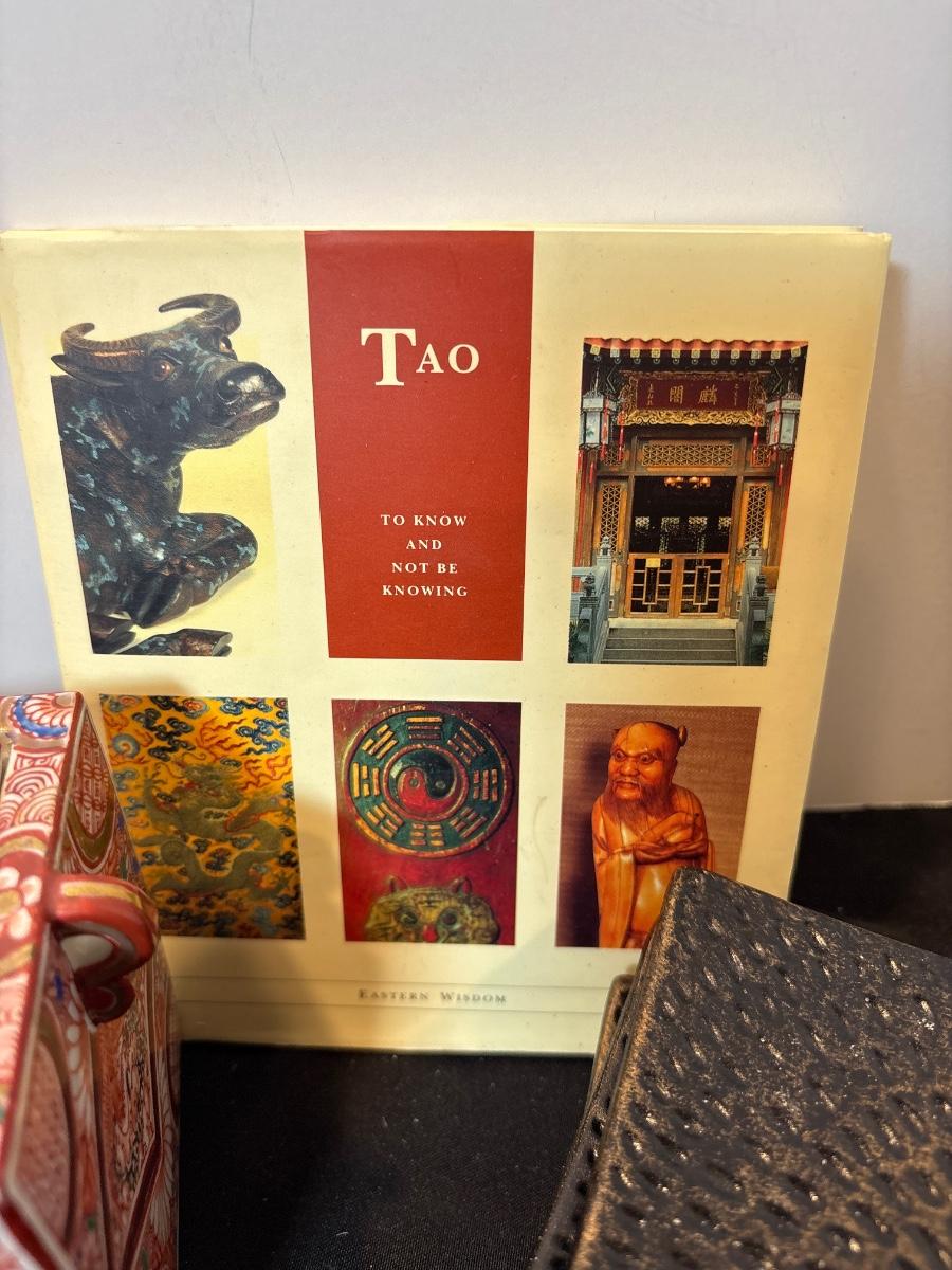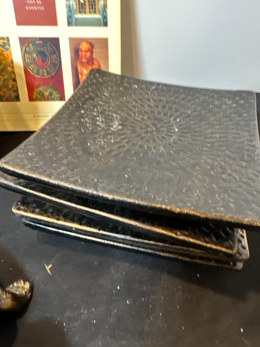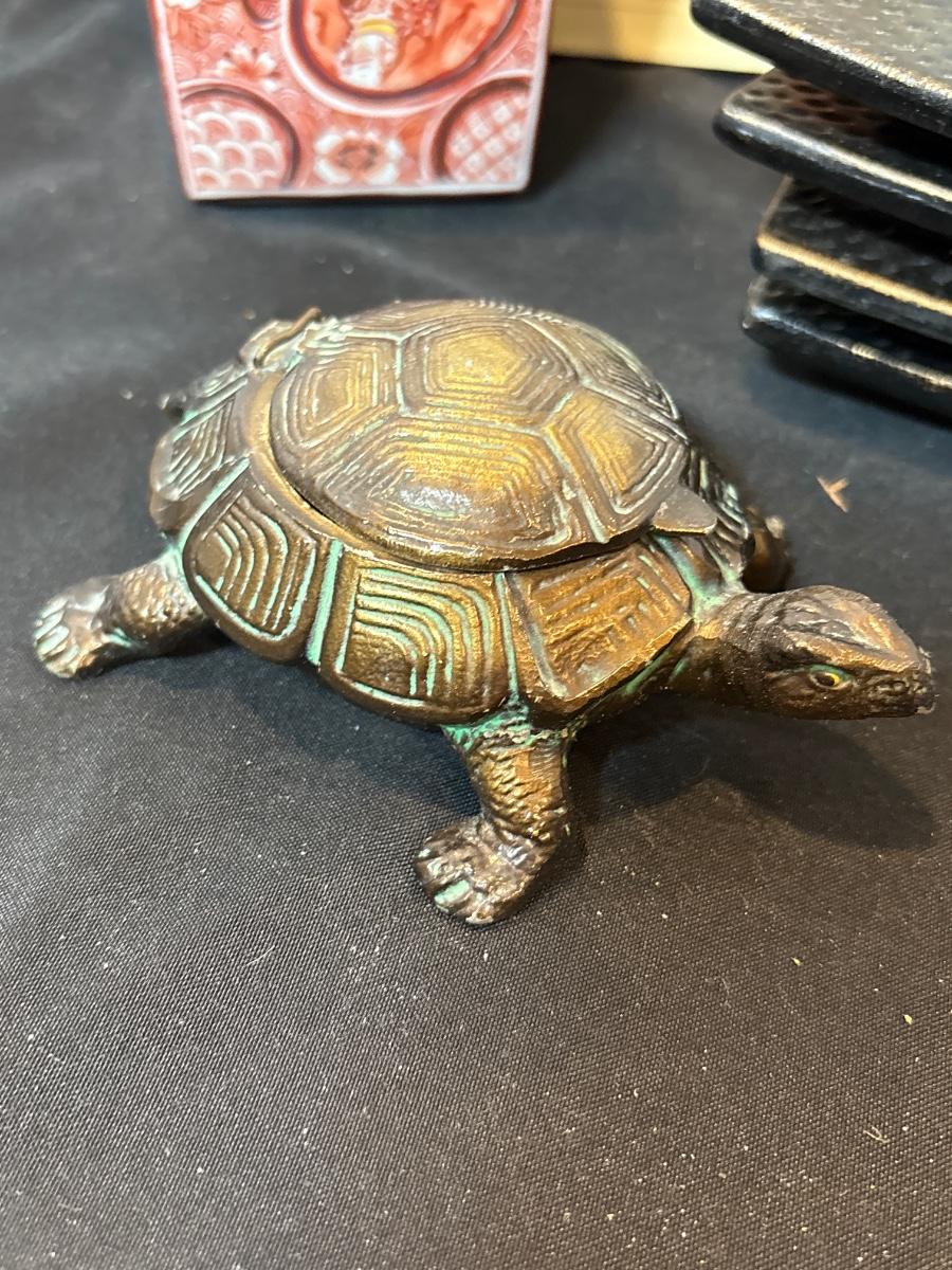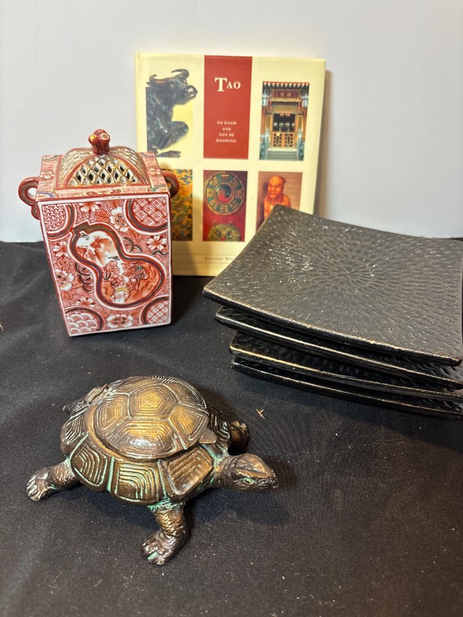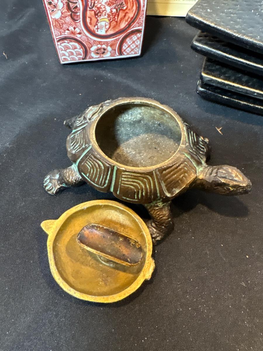 Brass turtle ashtray, cachet holder, candle holders, and book